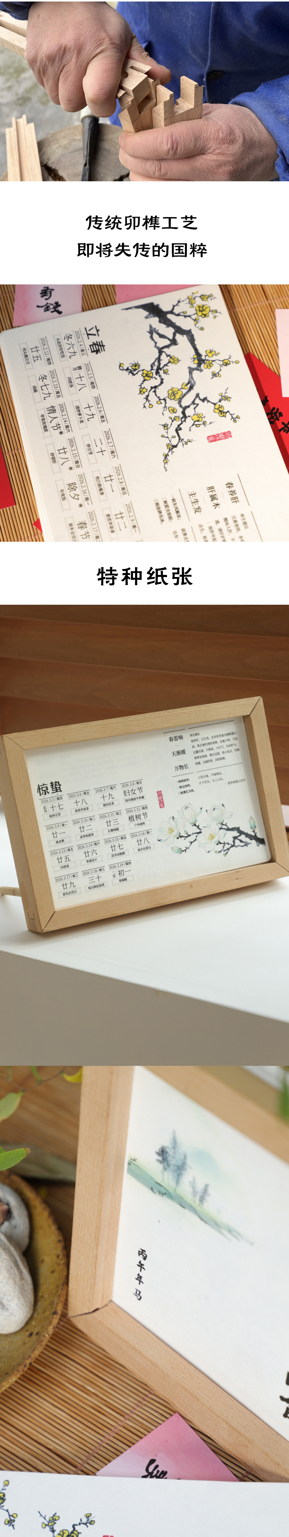 【规格】:日历纸+手作木框、日历纸 【手作人】:付元明 【发货时间】:库房产品,下单2天内发货(日历的第一天为2月4日立春) 【注意事项】:2026年新日历,内容与设计版面已更新,会跟图片稍许差别,如果去年已拍日历框,可单独买日历纸即可。 |