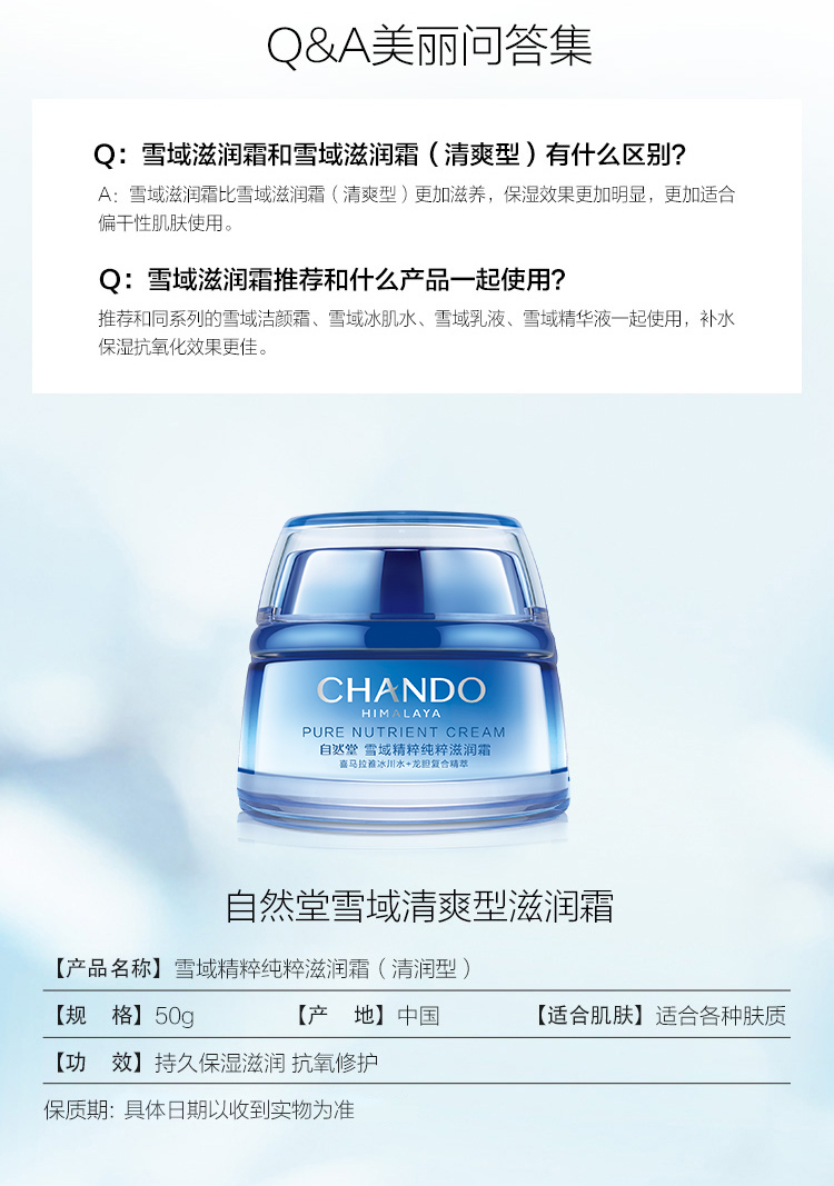 自然堂雪域清爽型滋润面霜补水锁水保湿【LY】
