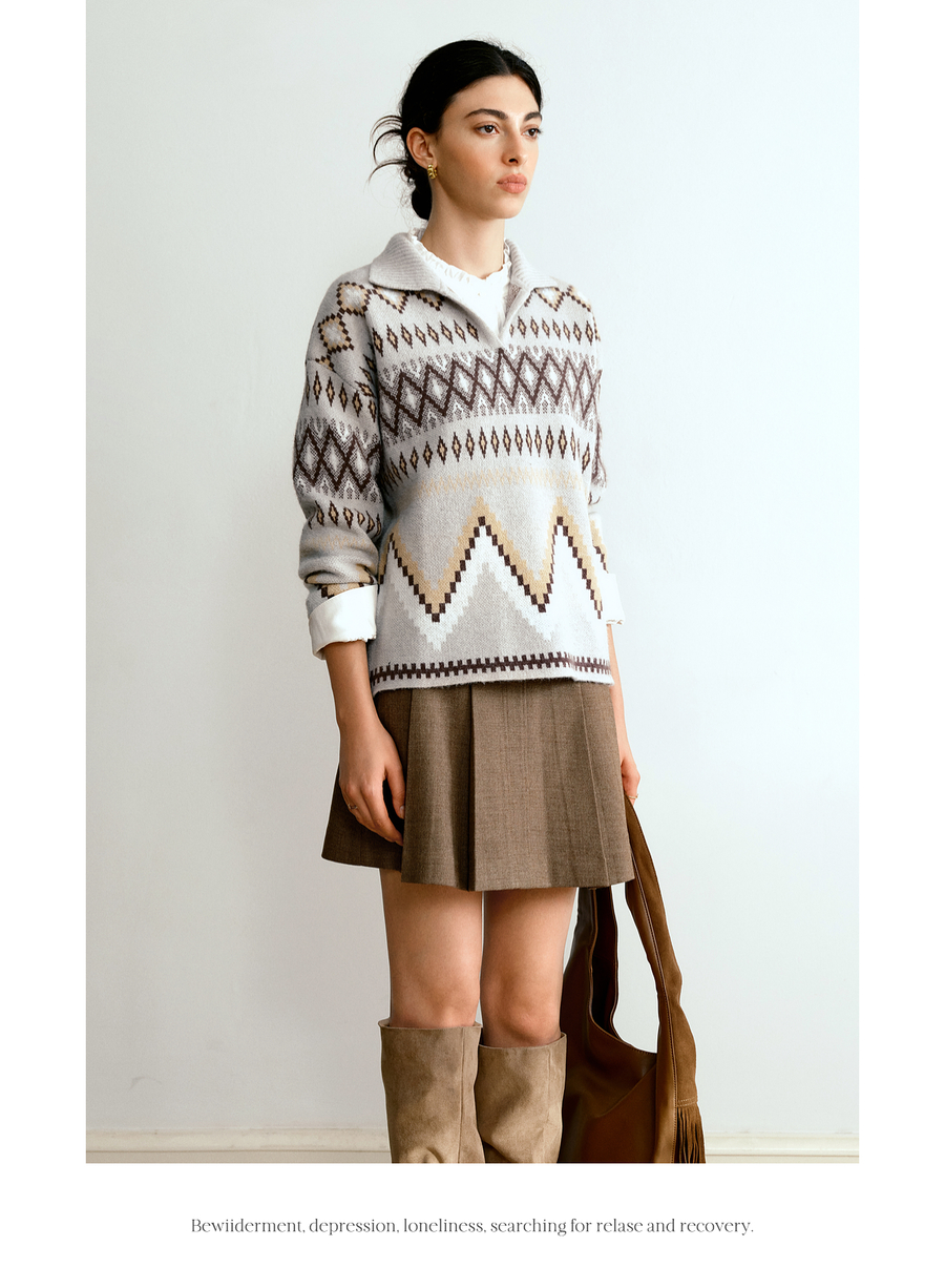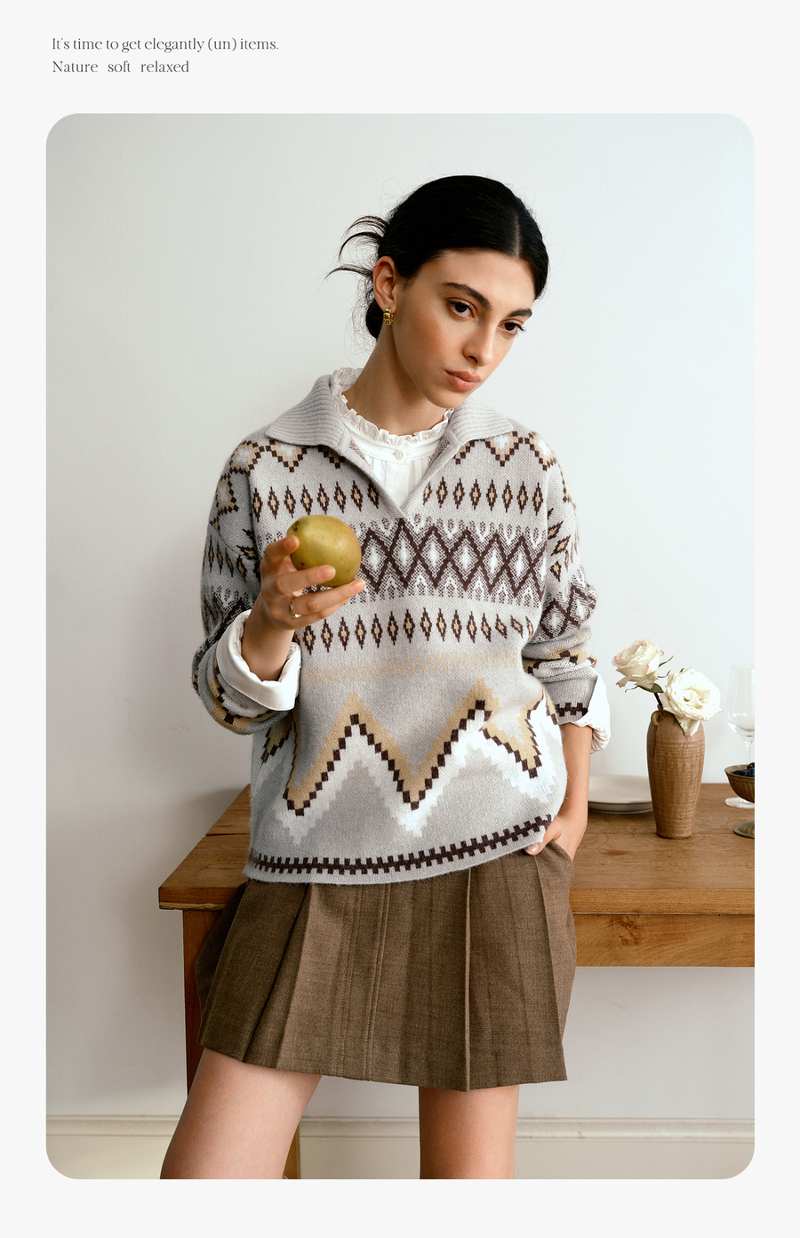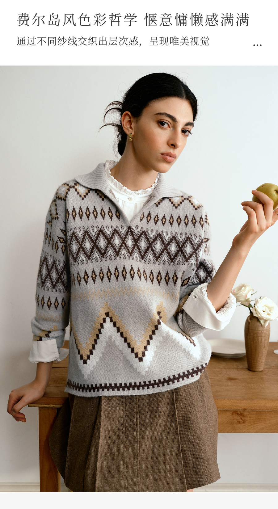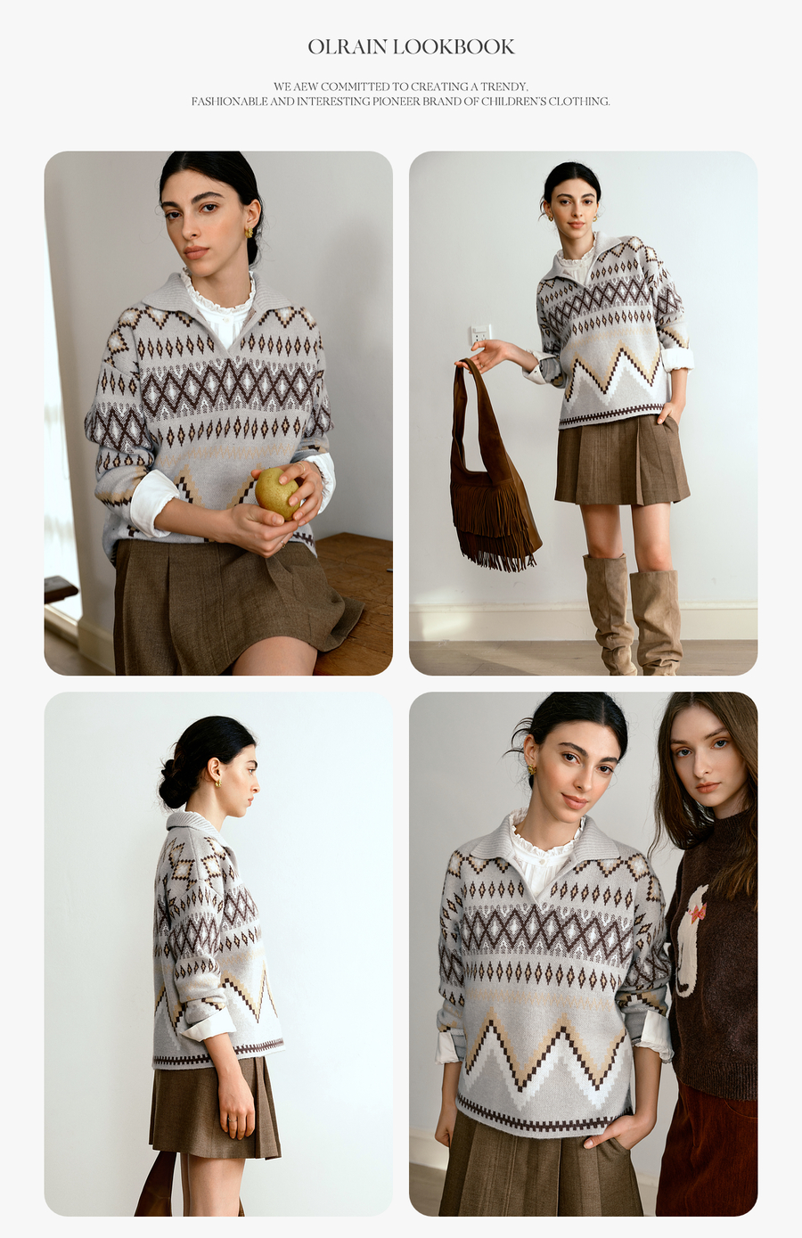 OLrain欧芮儿2025新款女秋季费尔岛复古几何毛织套头衫宽松上衣