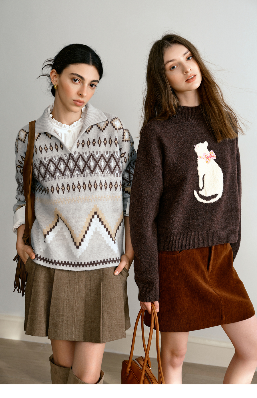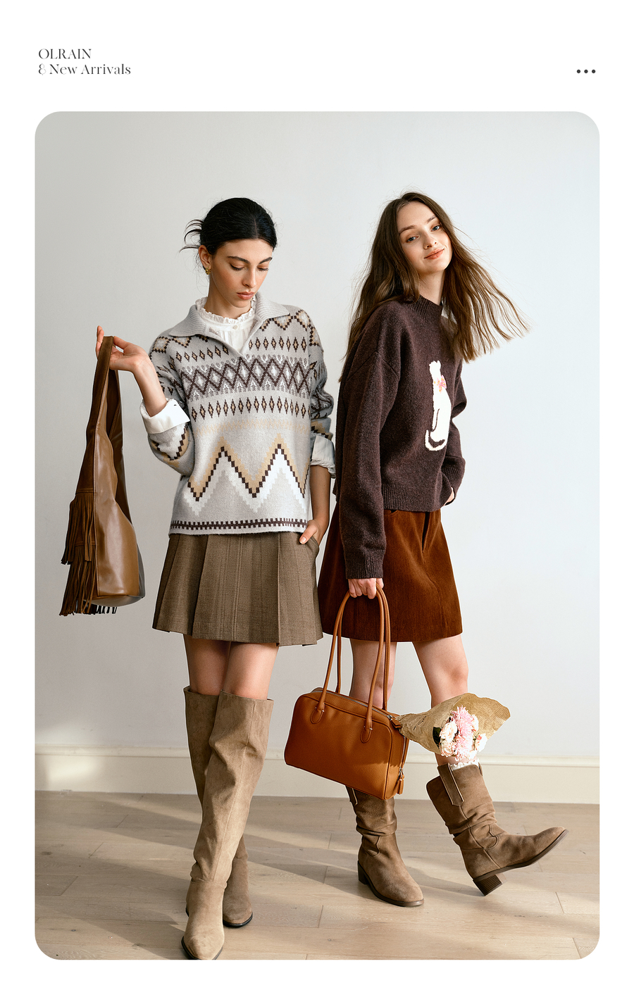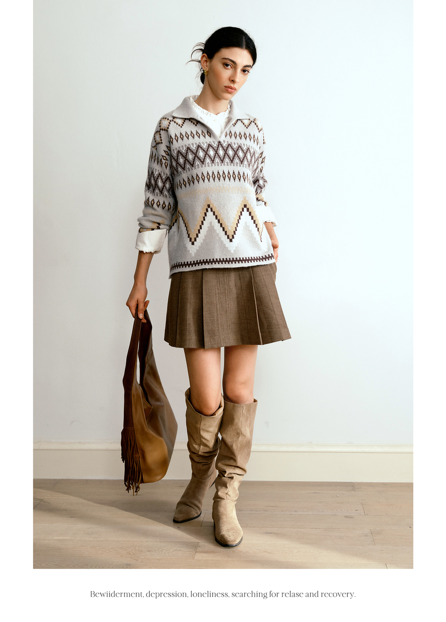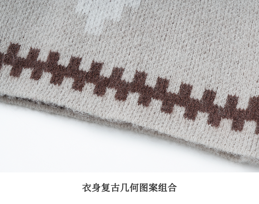 OLrain欧芮儿2025新款女秋季费尔岛复古几何毛织套头衫宽松上衣