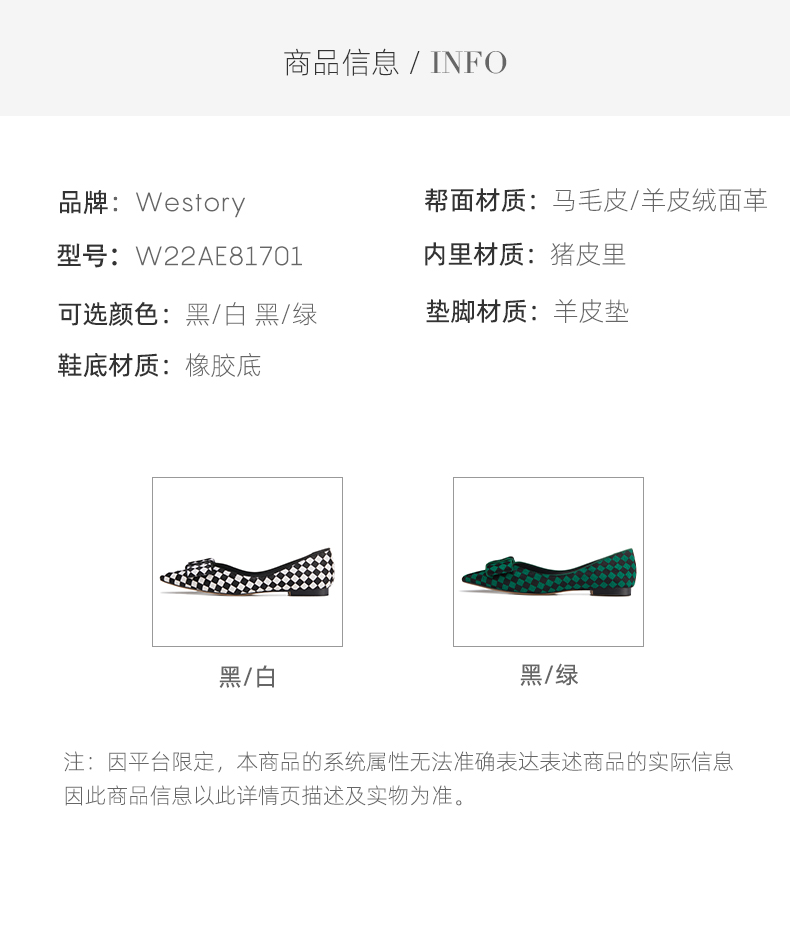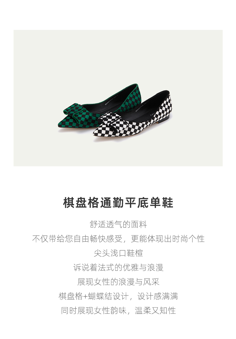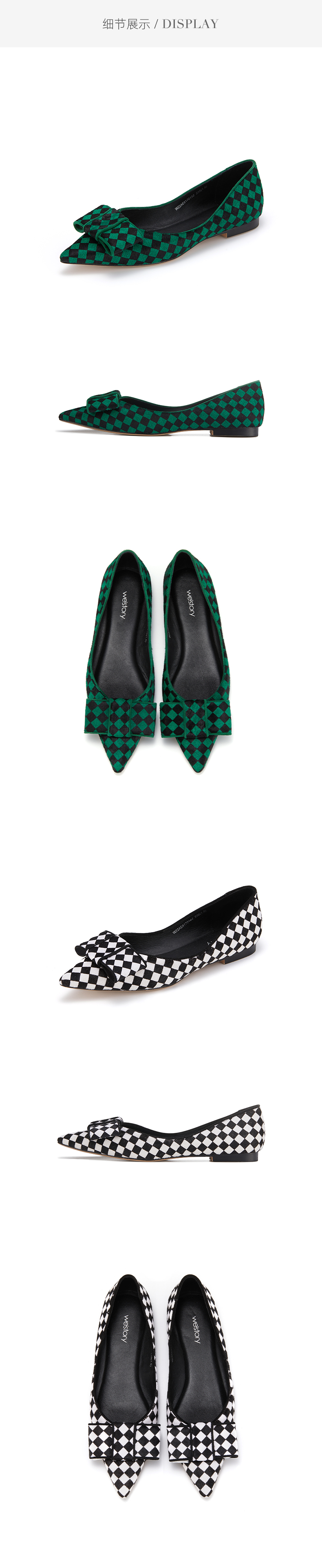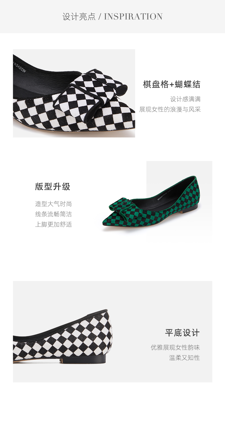 westory新款单鞋黑白棋盘格浅口女鞋蝴蝶结平底鞋小众尖头ins潮W22AE81701