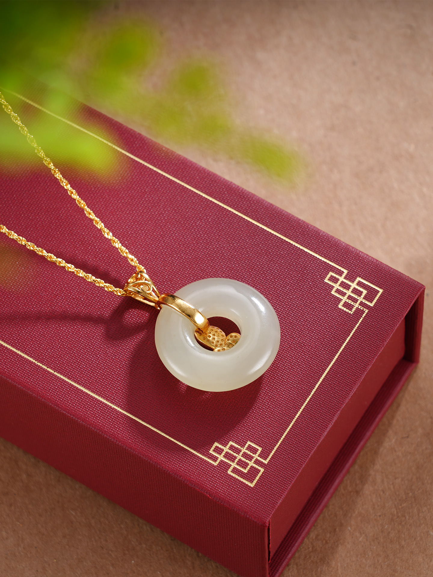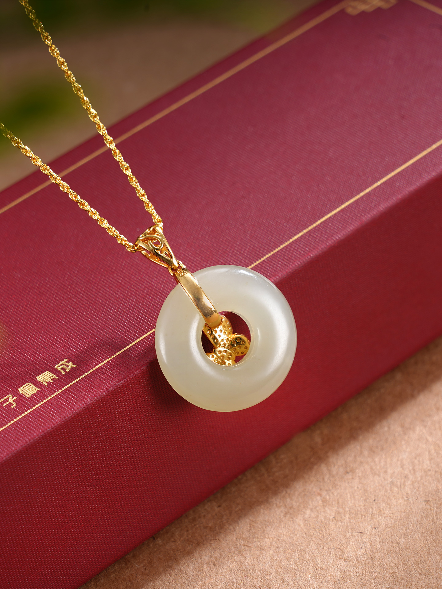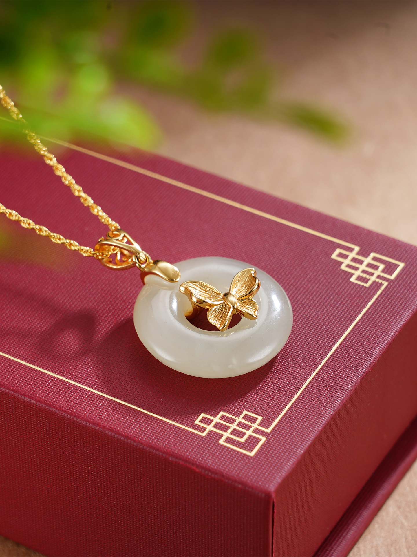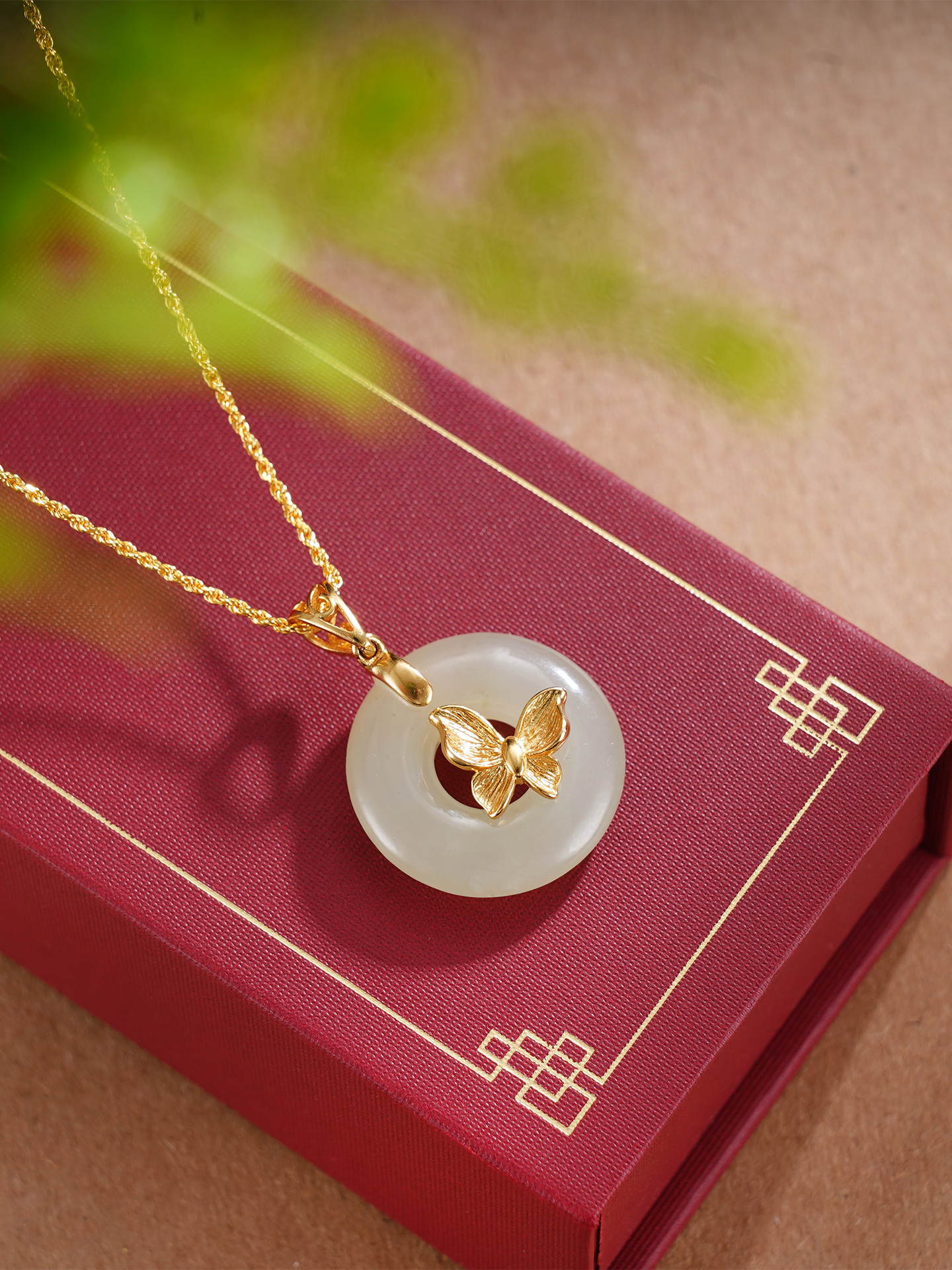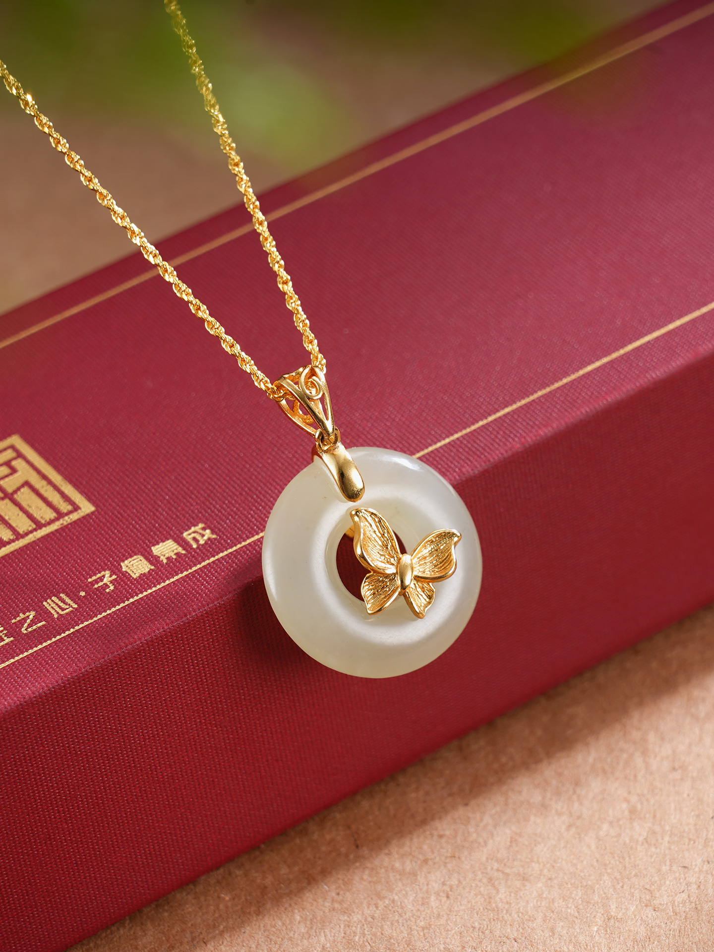 【规格】:和田玉有其他玉所不能比拟的温润感,冰清玉洁,高雅沉静,和女人最为相配。一只蝴蝶点缀于和田玉平安扣上,佩戴时正好接近心脏的位置,象征自由、美丽。