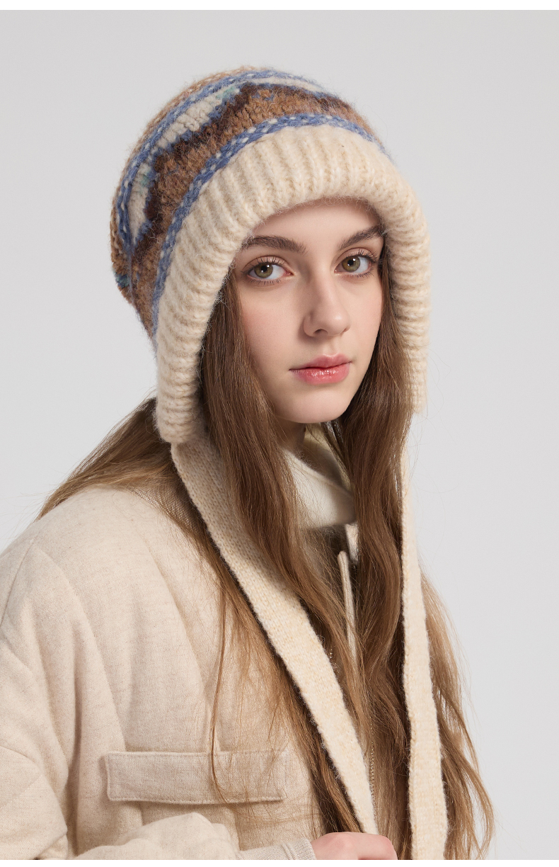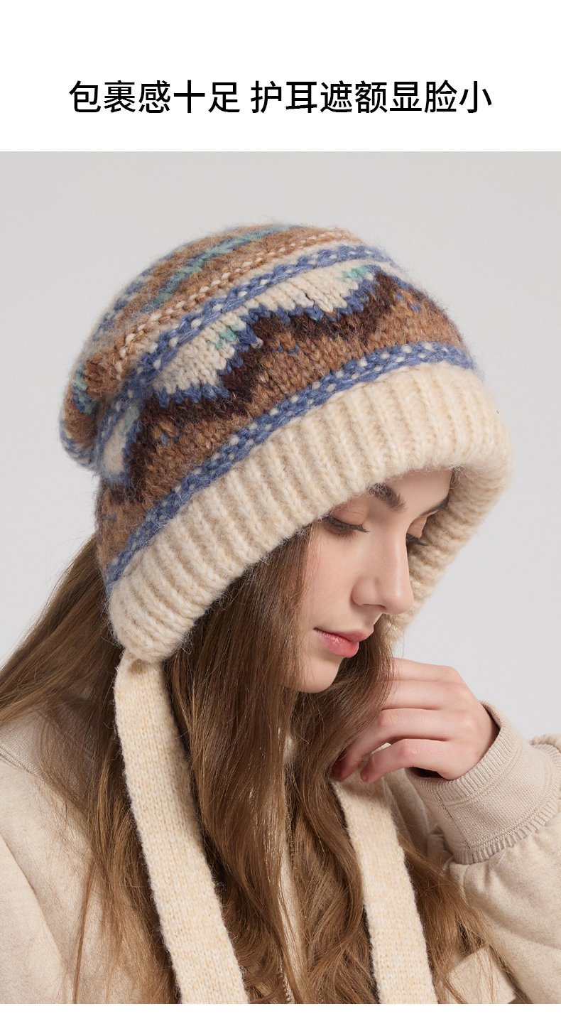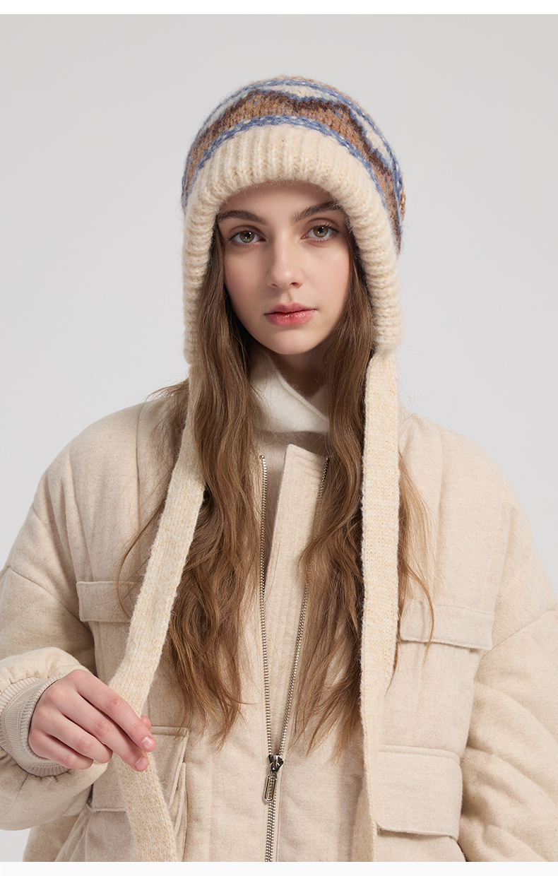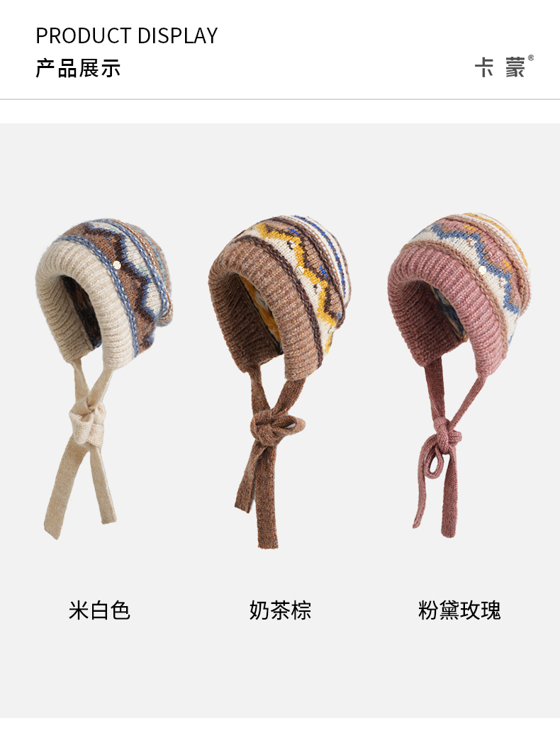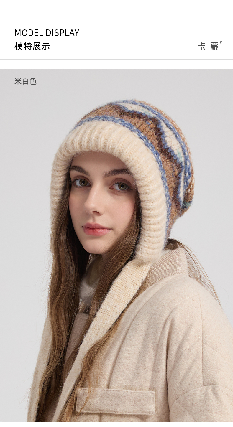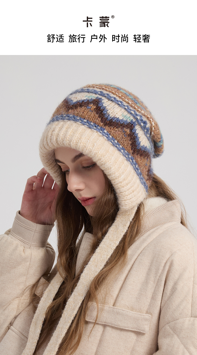 *【卡蒙】秋冬女款加厚保暖护耳系带费尔岛特色提花针织帽KM-9614