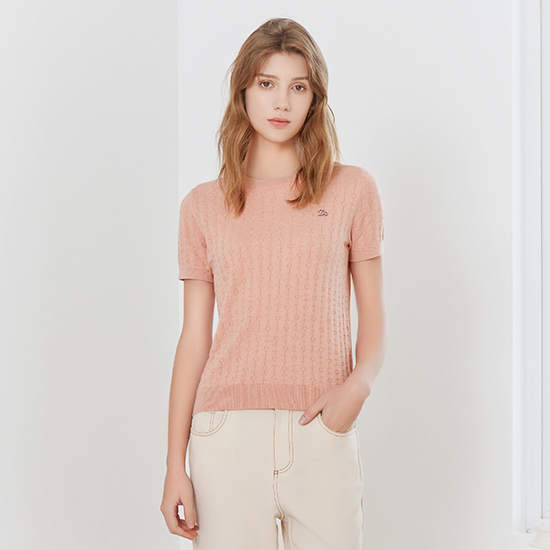【立体条纹短袖针织衫】23年春夏新品女士圆领套头针织套衫时尚条纹上衣