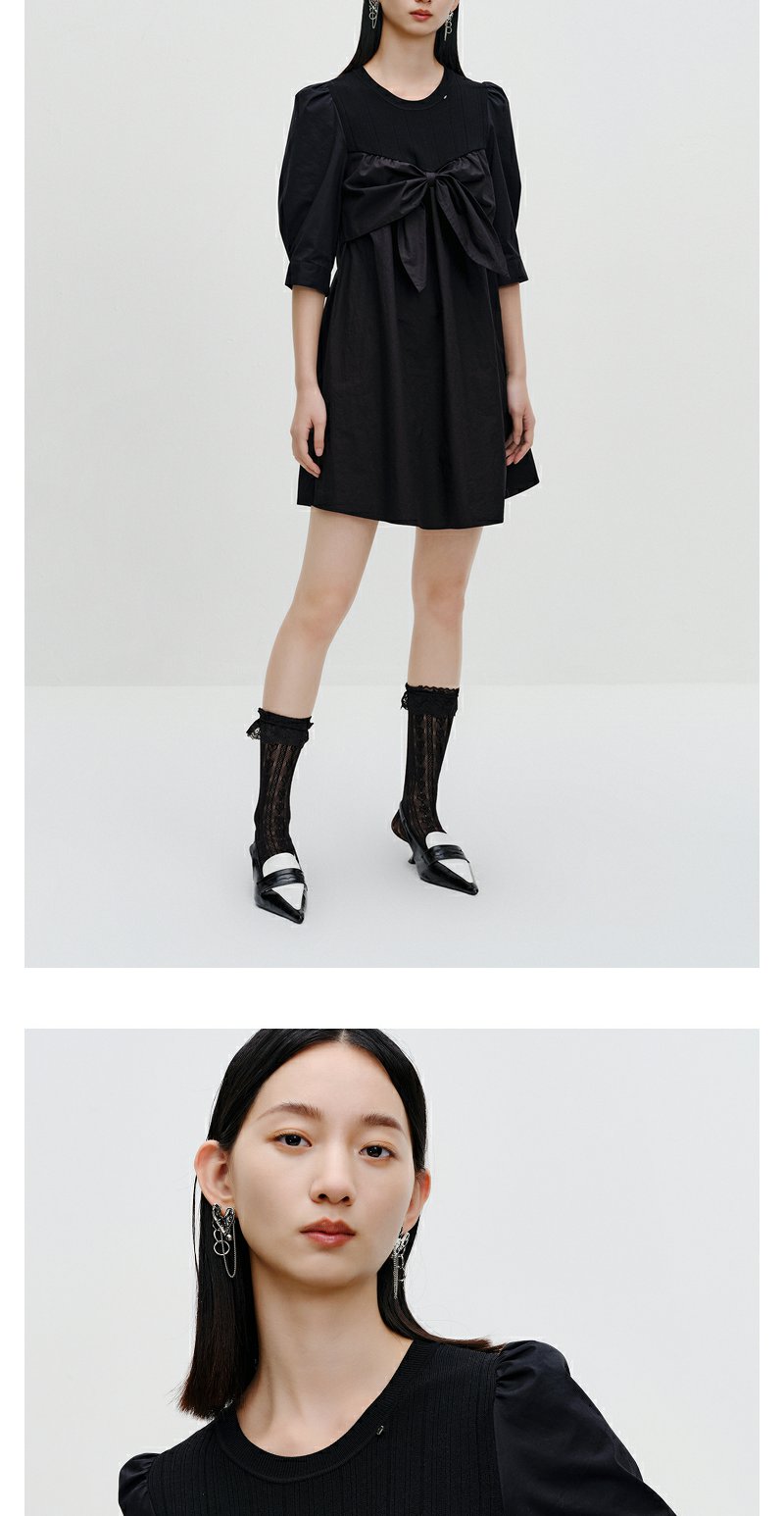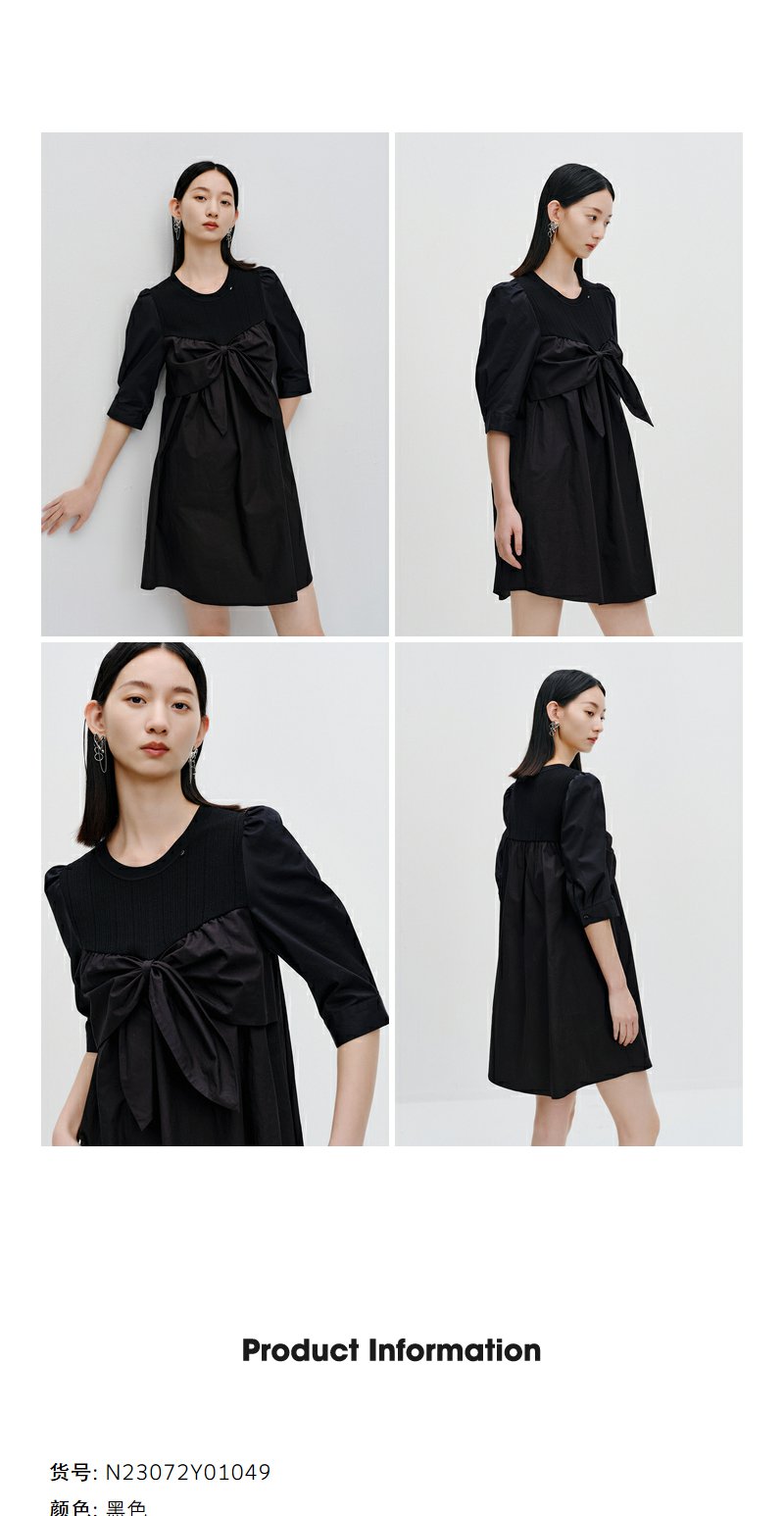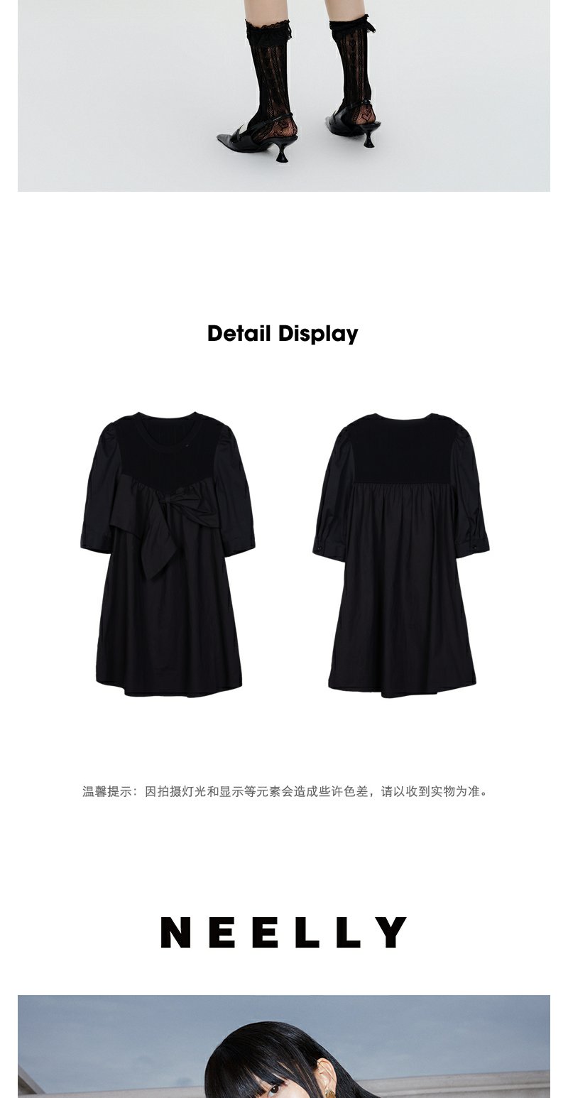NEELLY纳俪商场同款针织拼接泡泡袖连衣裙女蝴蝶结装饰减龄娃娃裙N23072Y01049
