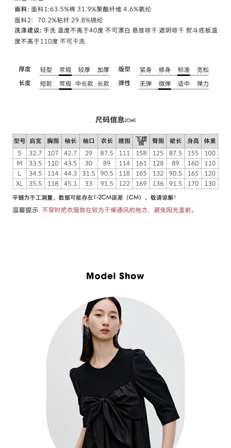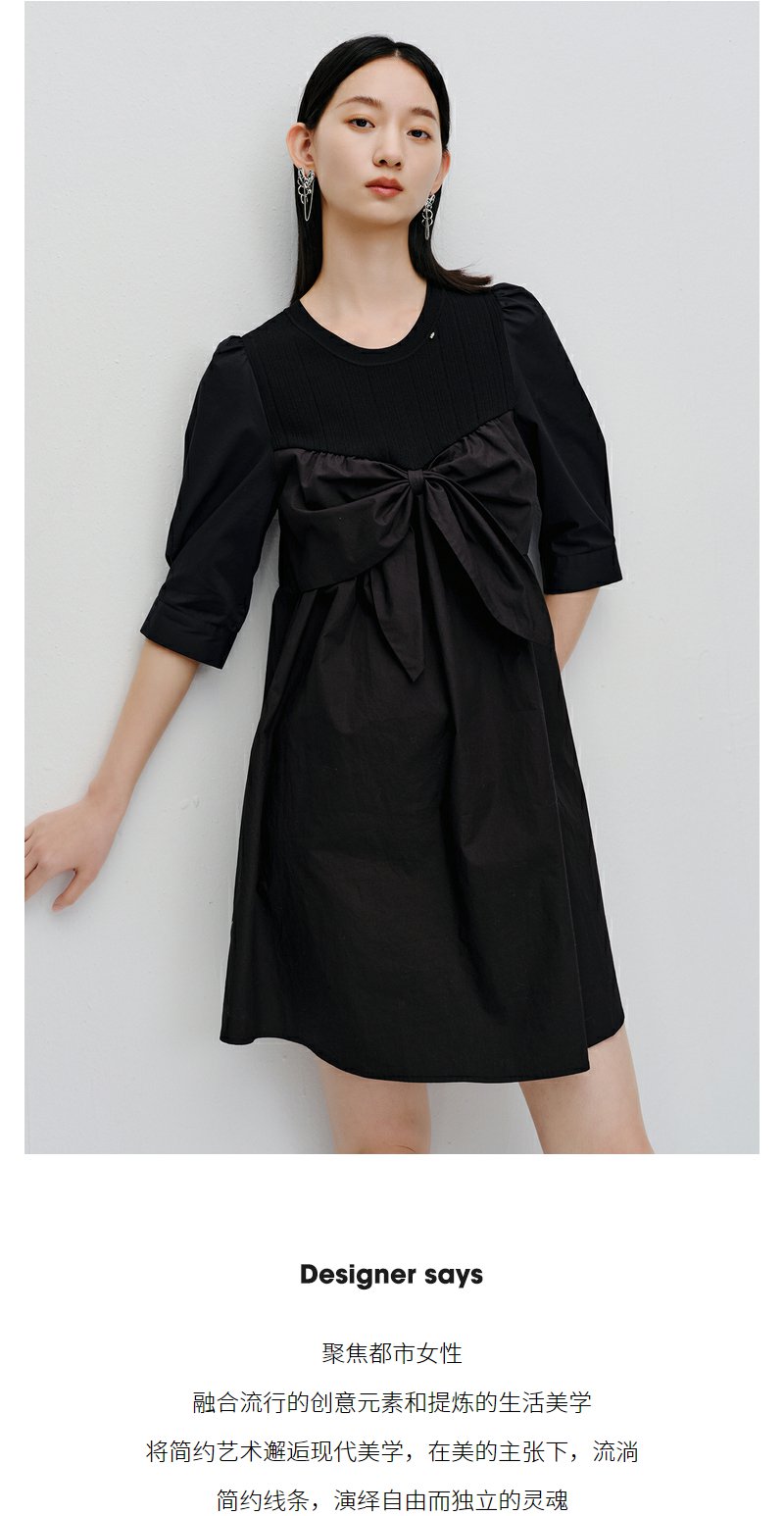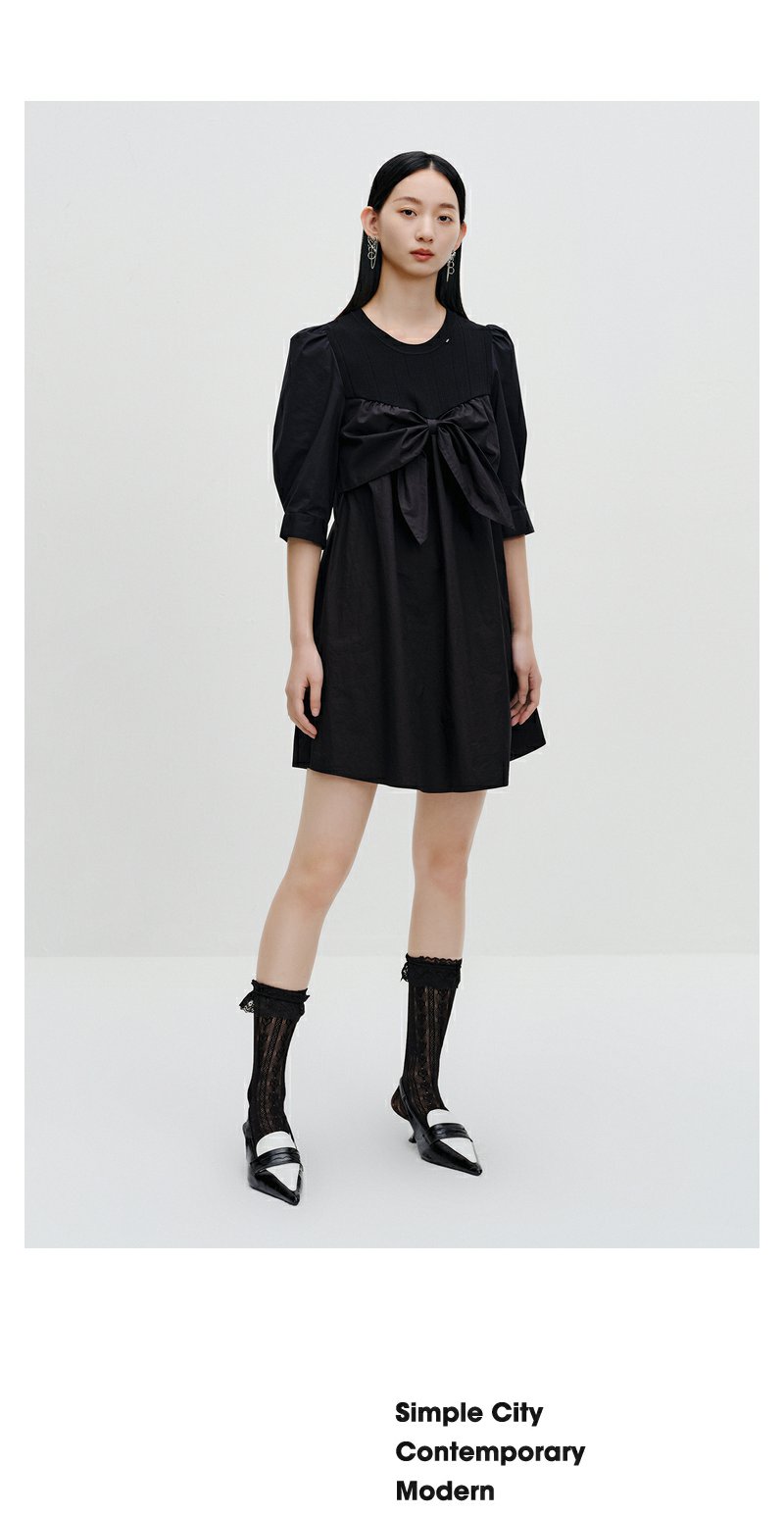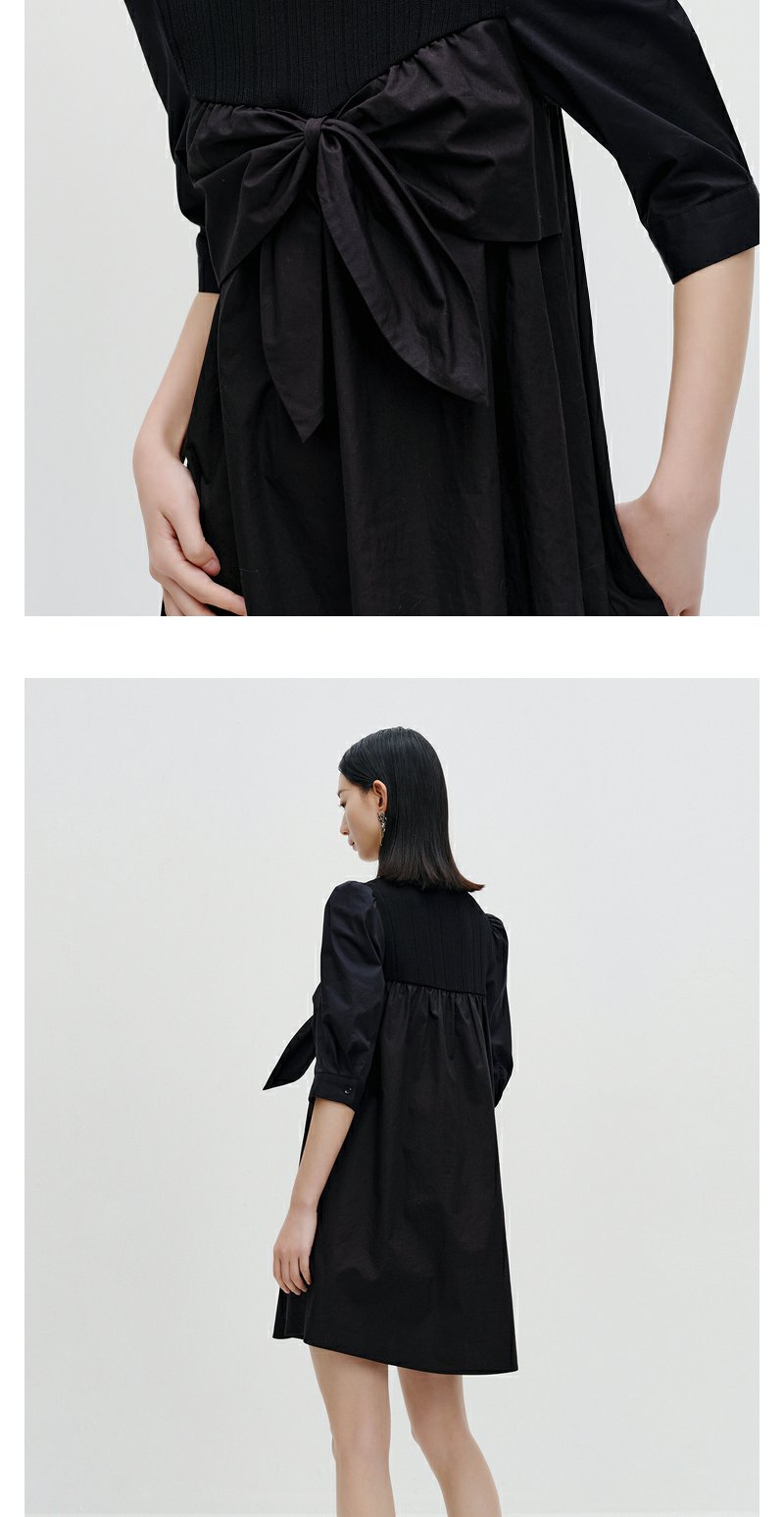 NEELLY纳俪商场同款针织拼接泡泡袖连衣裙女蝴蝶结装饰减龄娃娃裙N23072Y01049