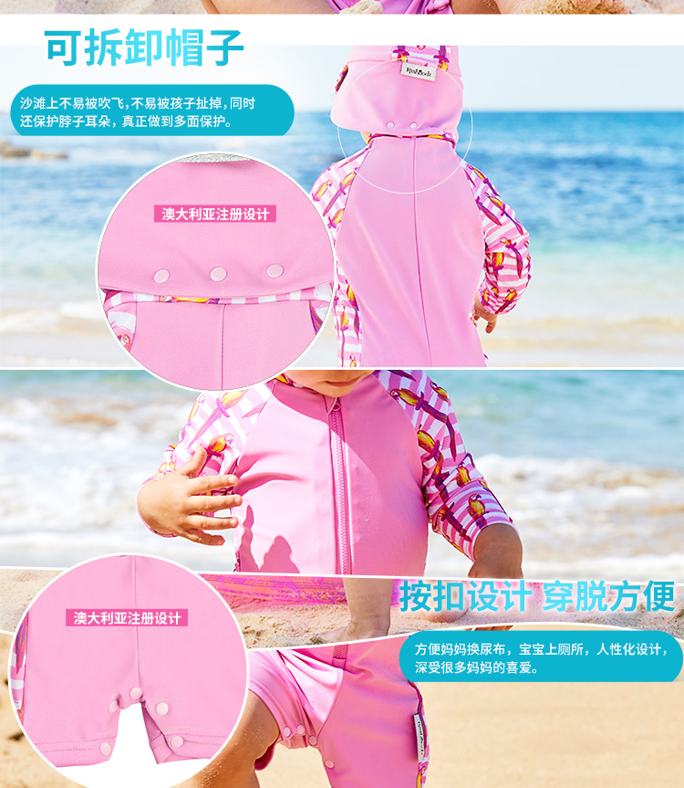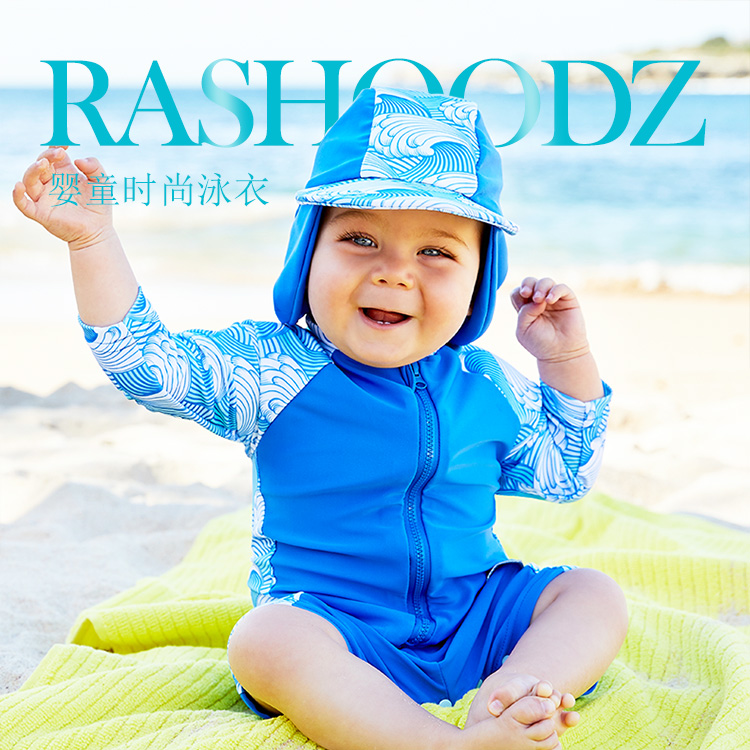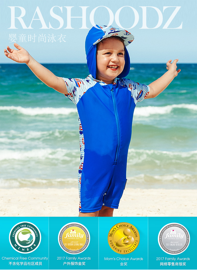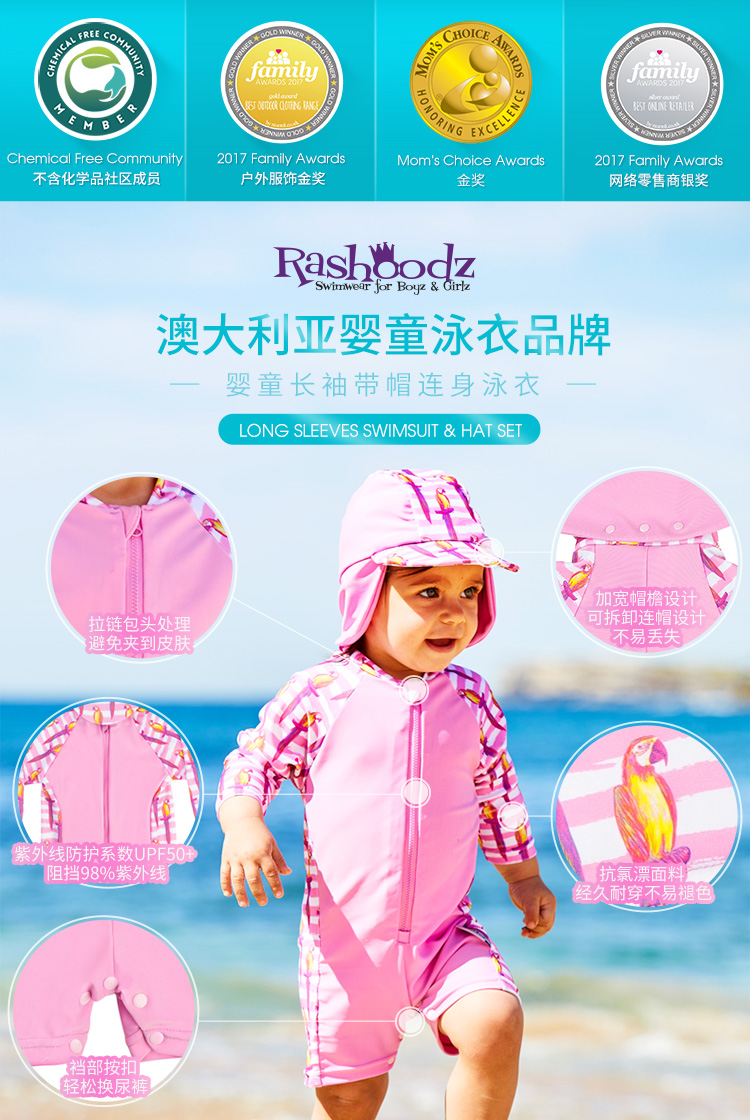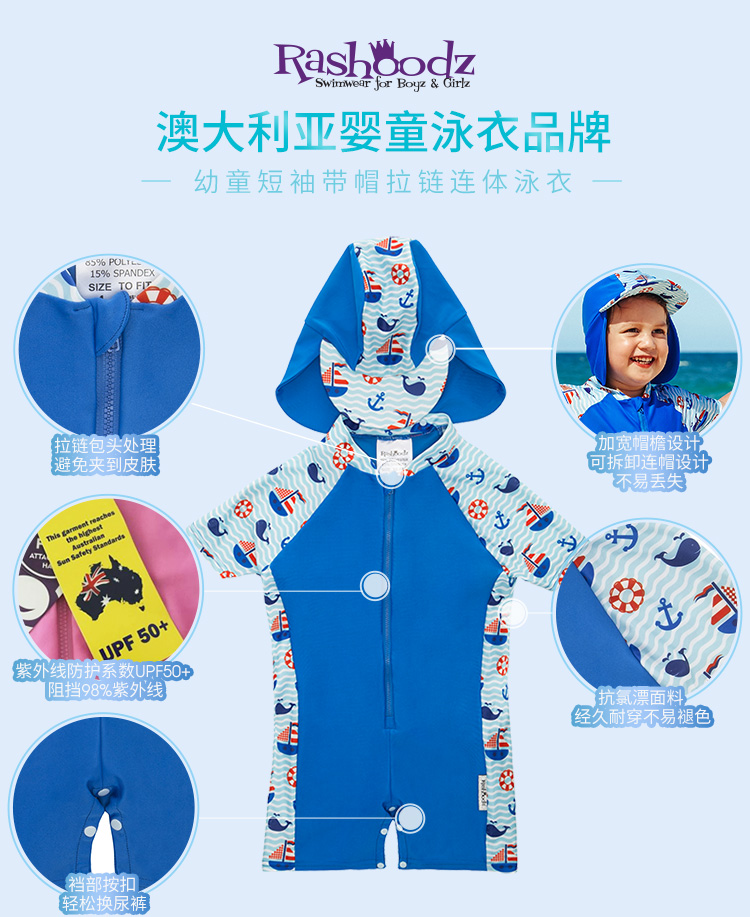 澳大利亚Rashoodz儿童长袖/短袖带帽连身泳衣拉链宝宝连体泳衣