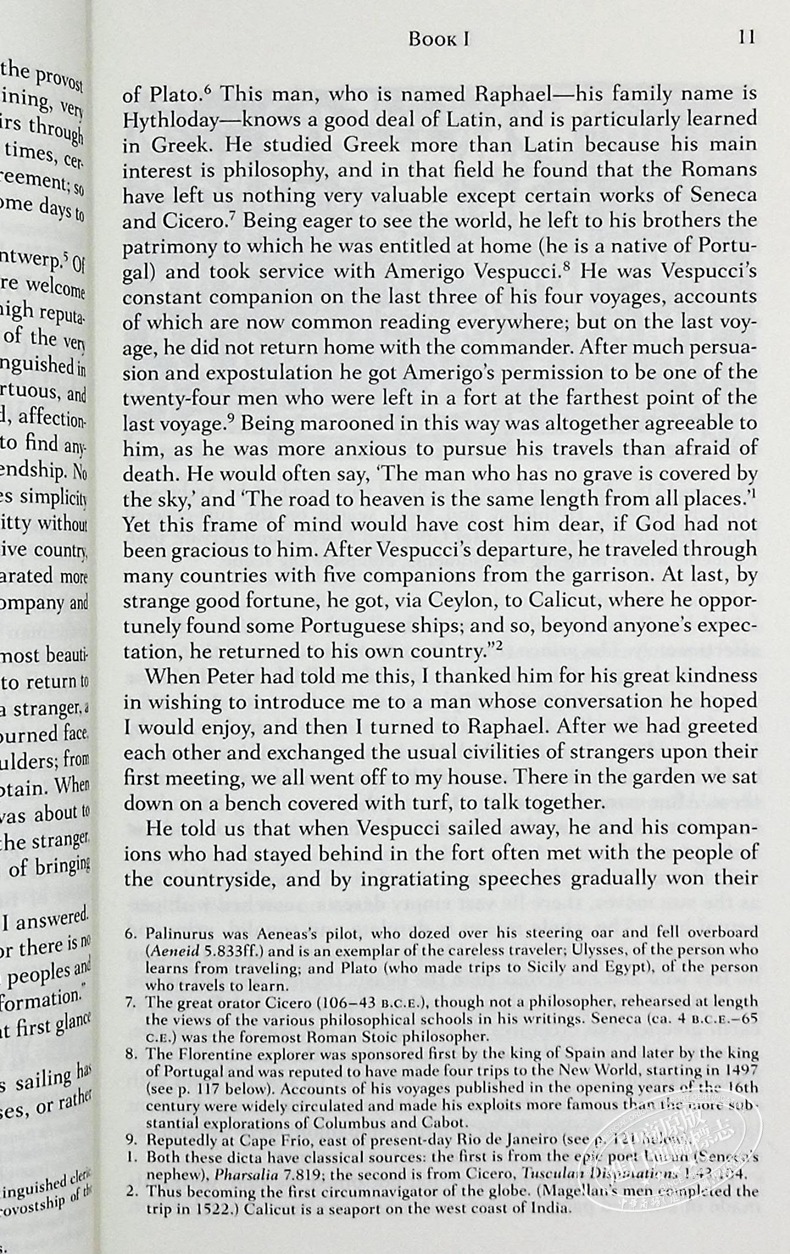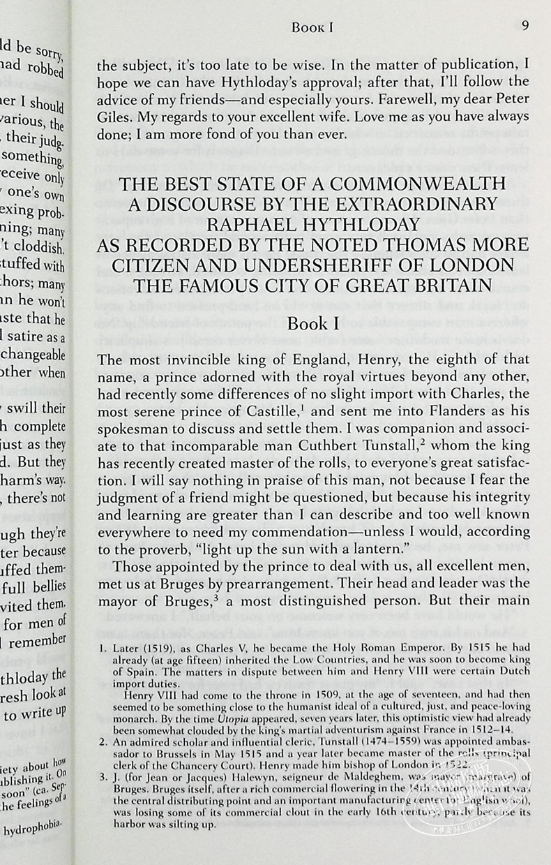 该书分两卷,第一卷借一位旅人之口,谈他周游列国所见,由此而导入对英国当时情况的观察与批判;第二卷才是对以“乌托邦”命名的一个想象的国家的描述。