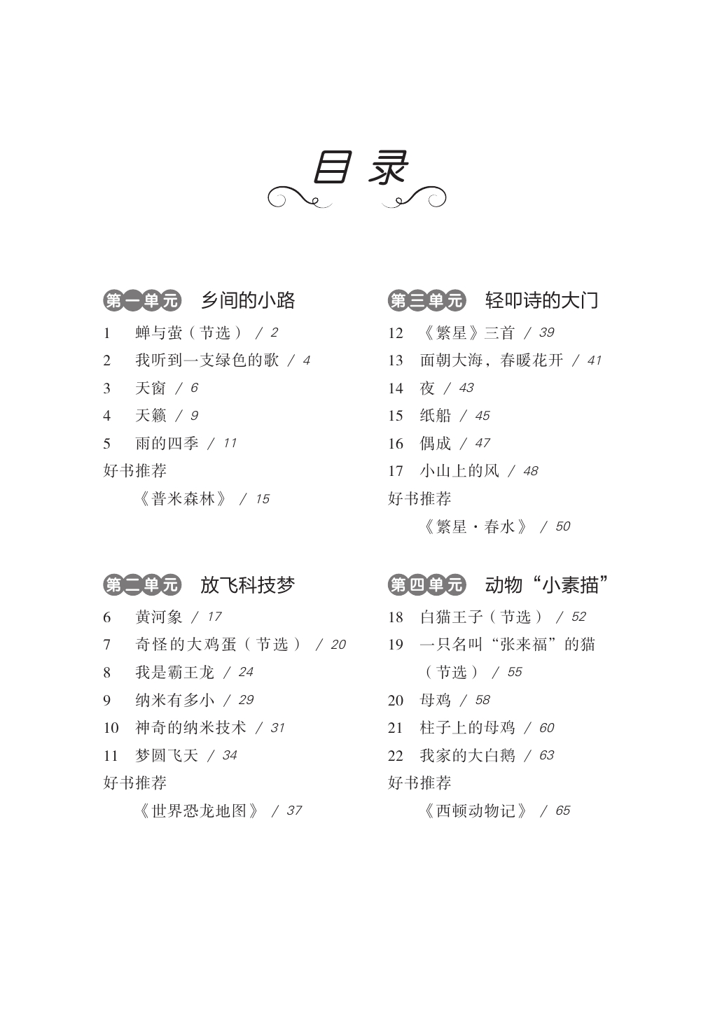 学完教材上的课文《猫》后,我们不妨借助老师的教学,来个“得法于课内,得益于课外”的练习——阅读本册第四单元中的《一