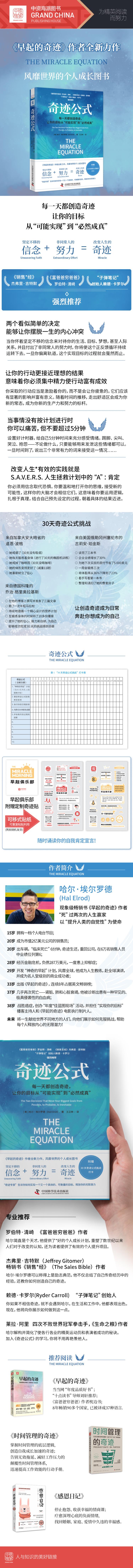 在人生的各个领域都迈向10级成功机会无处不在,你将找到成就感的真正源泉当你开始了新的一天,你要如何克服所有阻碍,奔赴你想要的一切?从实现财务自由到成就非凡事业,从战胜威胁生命的健康挑战到获得平和、富足的内心……《早起的奇迹》获得巨大成功后,哈尔·埃尔罗德意识到他还有更多东西与世界分享。哈尔总结了一个永恒成立但一直被忽视的成功公式,它由两个简单却颇具挑战的决定组成:坚定不移的信念+非同常人的努力=奇迹!事实上,各行各业的成就者一直都在践行“奇迹公式”,但普通人却难以坚持。如何才能正确理解并持续执行这两个决定,使你的“可能”变为“必然”?哈尔分享了重要的经验:利用每个具体的、可衡量的目标培养“奇迹专家”的品质;调整人生优先级,建立“使命安全网”,为梦想保驾护航;不再让“非理性恐惧”和“缺乏耐心”扼杀创造力;定期复盘和调整,更新“自我肯定宣言”,确保能够坚持到底;……哈尔还提供了立竿......