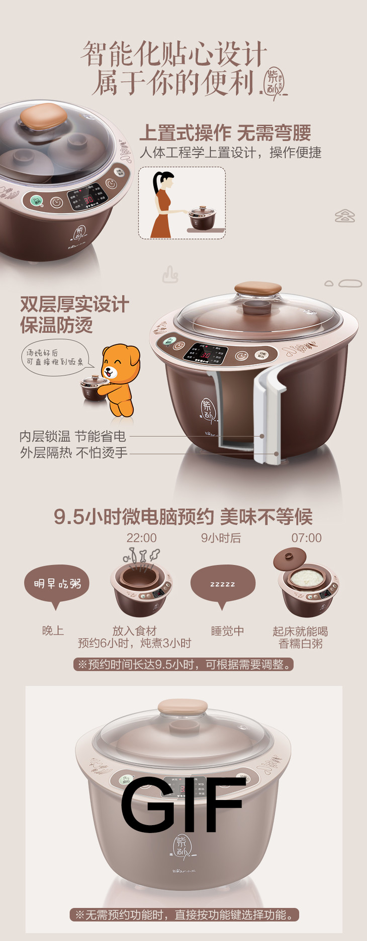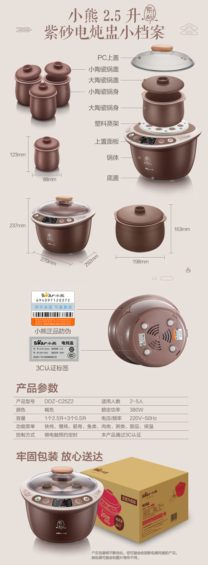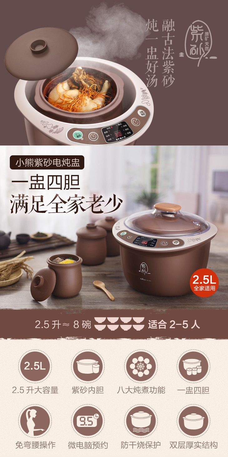 小熊(Bear) DDZ-C25Z2煲汤电炖锅 隔水炖电炖盅 煮粥紫砂炖锅 2.5升 褐色