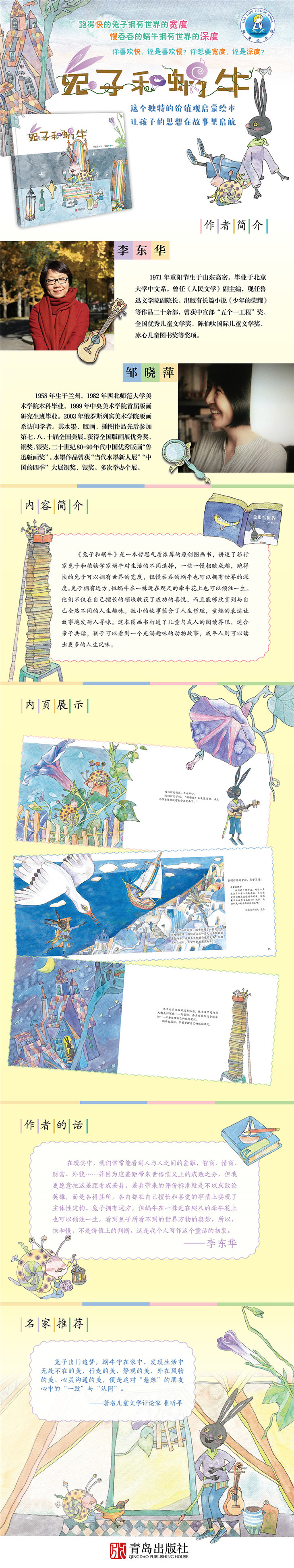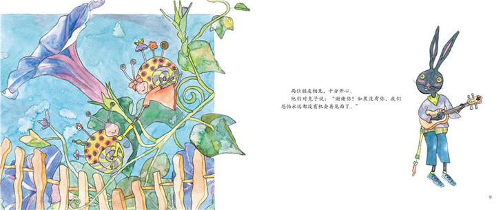 《兔子和蜗牛》是一本具有淡淡哲思气质的原创图画书,讲述了旅行家兔子和植物学家蜗牛对生活的不同选择,一快一慢相映成趣,跑得快的兔子可以拥有世界的宽度,但慢吞吞的蜗牛也可以拥有世界的深度。兔子拥有远方,但蜗牛在一株近在咫尺的牵牛花上也可以倾注一生。他们不仅在自己擅长的领域收获了成功的喜悦,而且能够欣赏到与自己全然不同的人生趣味。短小的故事蕴含了人生哲理,童趣的表达让故事越发耐人寻味。这本图画书打通了儿童与成人的阅读界限,适合亲子共读,孩子可以看到一个充满趣味的动物故事,成年人则可以读出更多的人生况味。