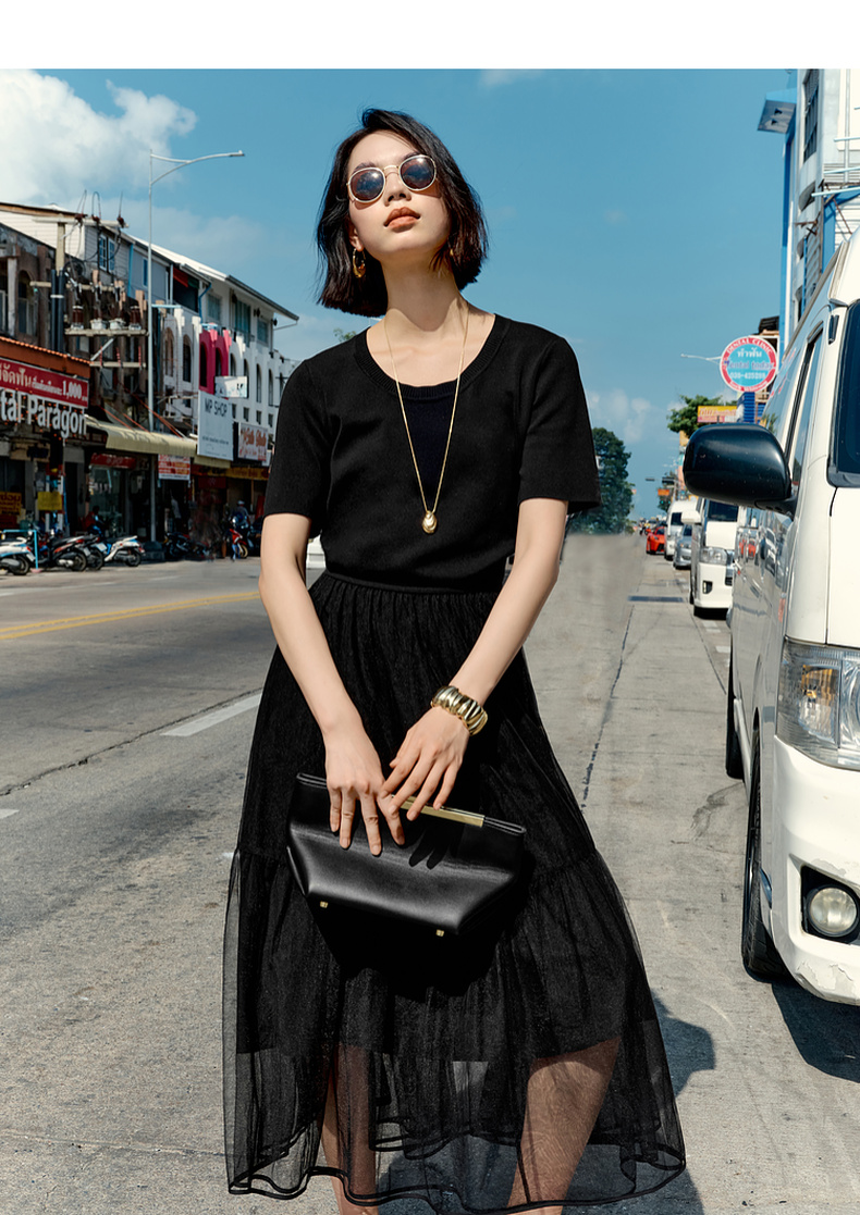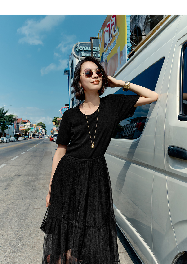 【严选】伊芙丽针梭拼接连衣裙女2024春装新款显瘦咖啡色轻熟风长款纱裙1F3994611