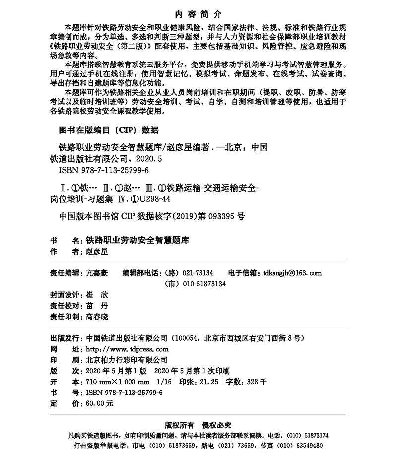 本题库针对铁路行业涉及的各项作业和季节性、临时性任务以及应急救援等劳动安全风险,结合国家法律、法规、标准和铁路行业最新规章编制而成,分为单选、多选和判断三种题型,共计1656道试题。