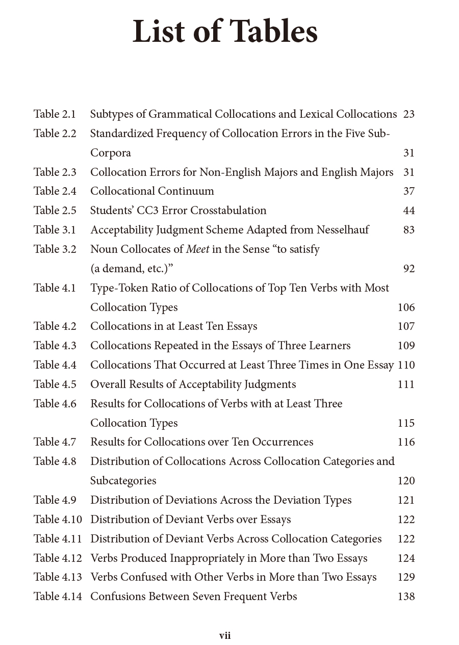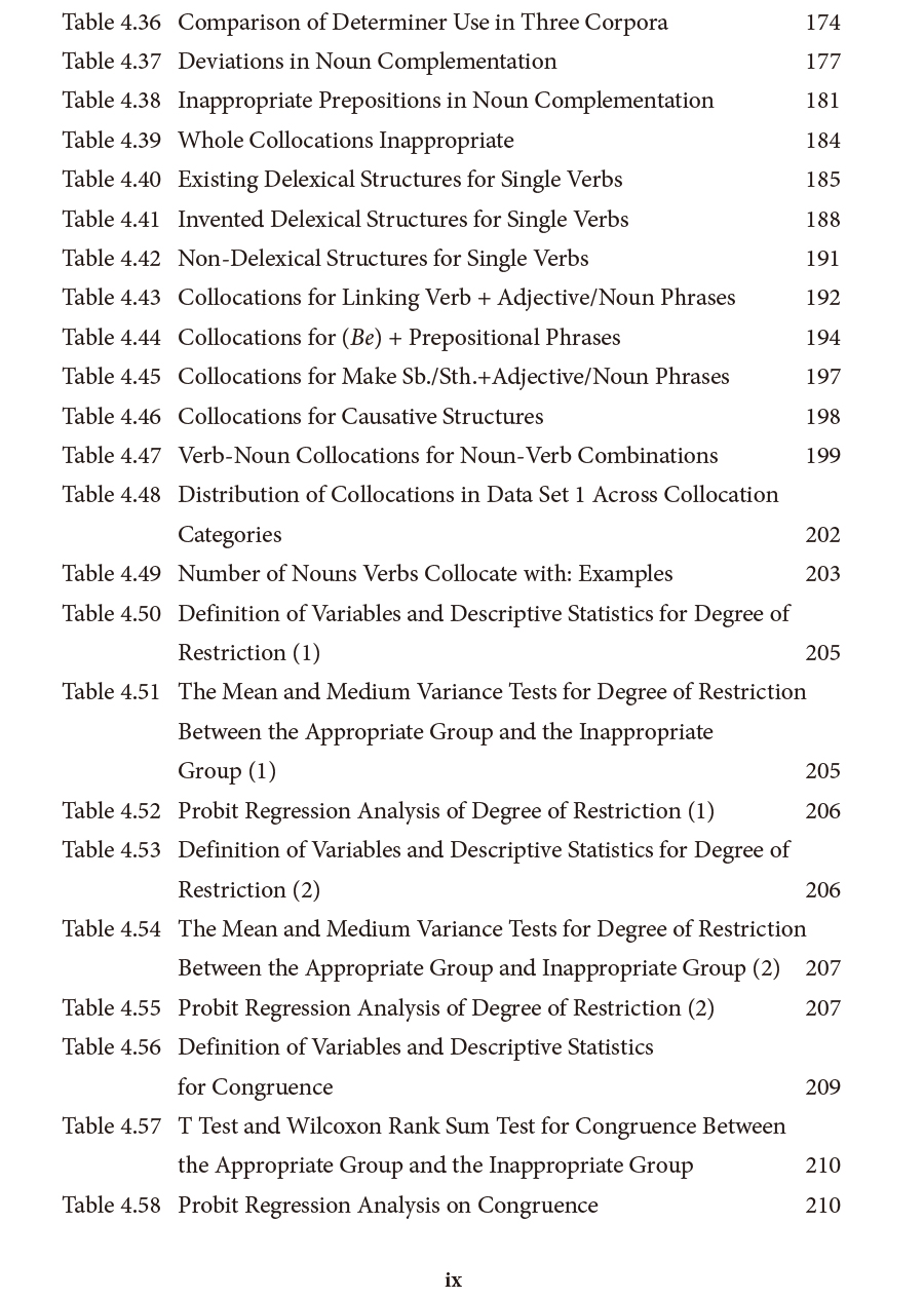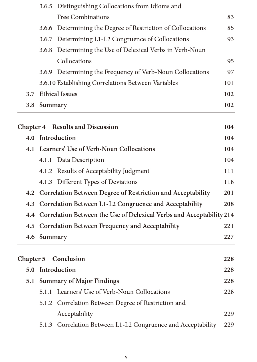 本书着重研究学习者对限制性搭配(restricted collocations)的使用。限制性搭配是Howarth提出的搭配连续体的四个类别之一,其他三个类别分别是自由组合(free combinations)、比喻性习语( figurative idioms)和纯习语(pure idioms)。本书有两个主要目的,个目的是尽可能完整、准确地呈现学习者在英语书面语中动名词搭配的使用情况;第二个目的是探究学习者动名词搭配的使用是否以及在何种程度上与四个语言因素相关。这四个语言因素分别是搭配的限制程度、搭配在学习者母语(即汉语)与英语中的一致性、搭配中虚化动词的使用以及搭配在英语本族语者语言中的出现频率。