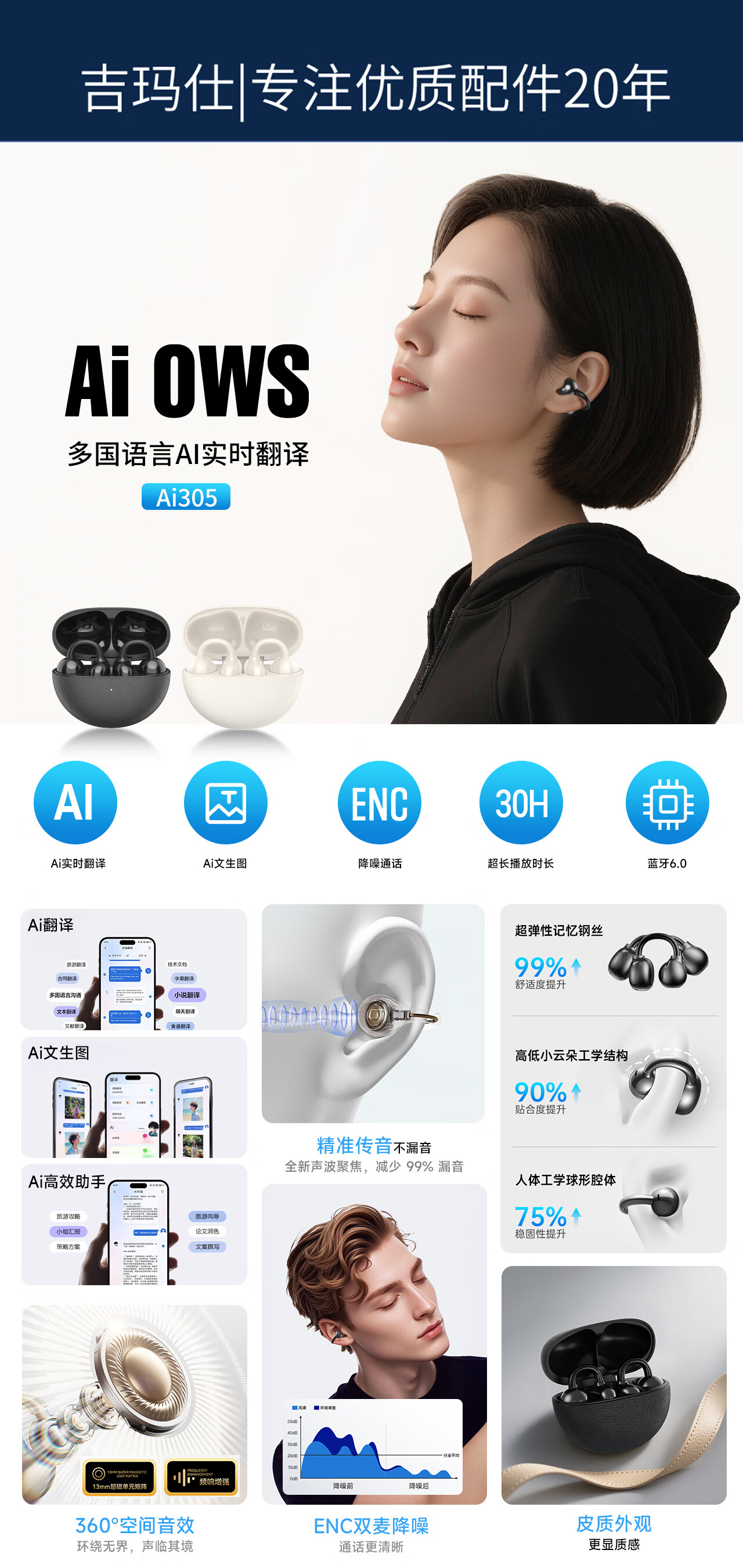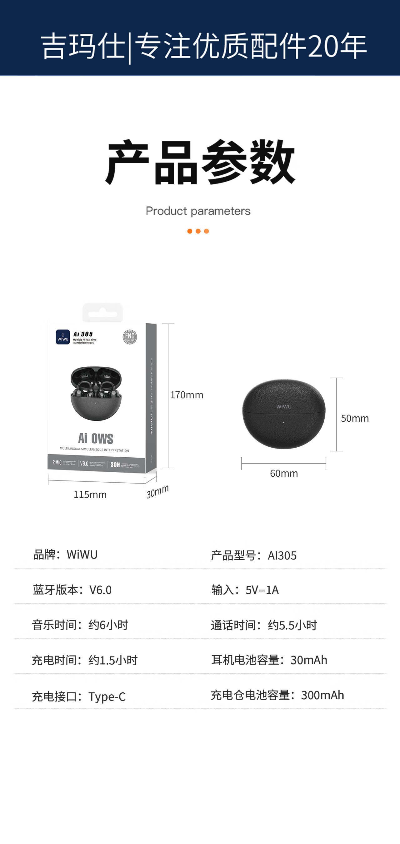 WIWU灵动Ai-305不入耳夹耳蓝牙耳机 米白色