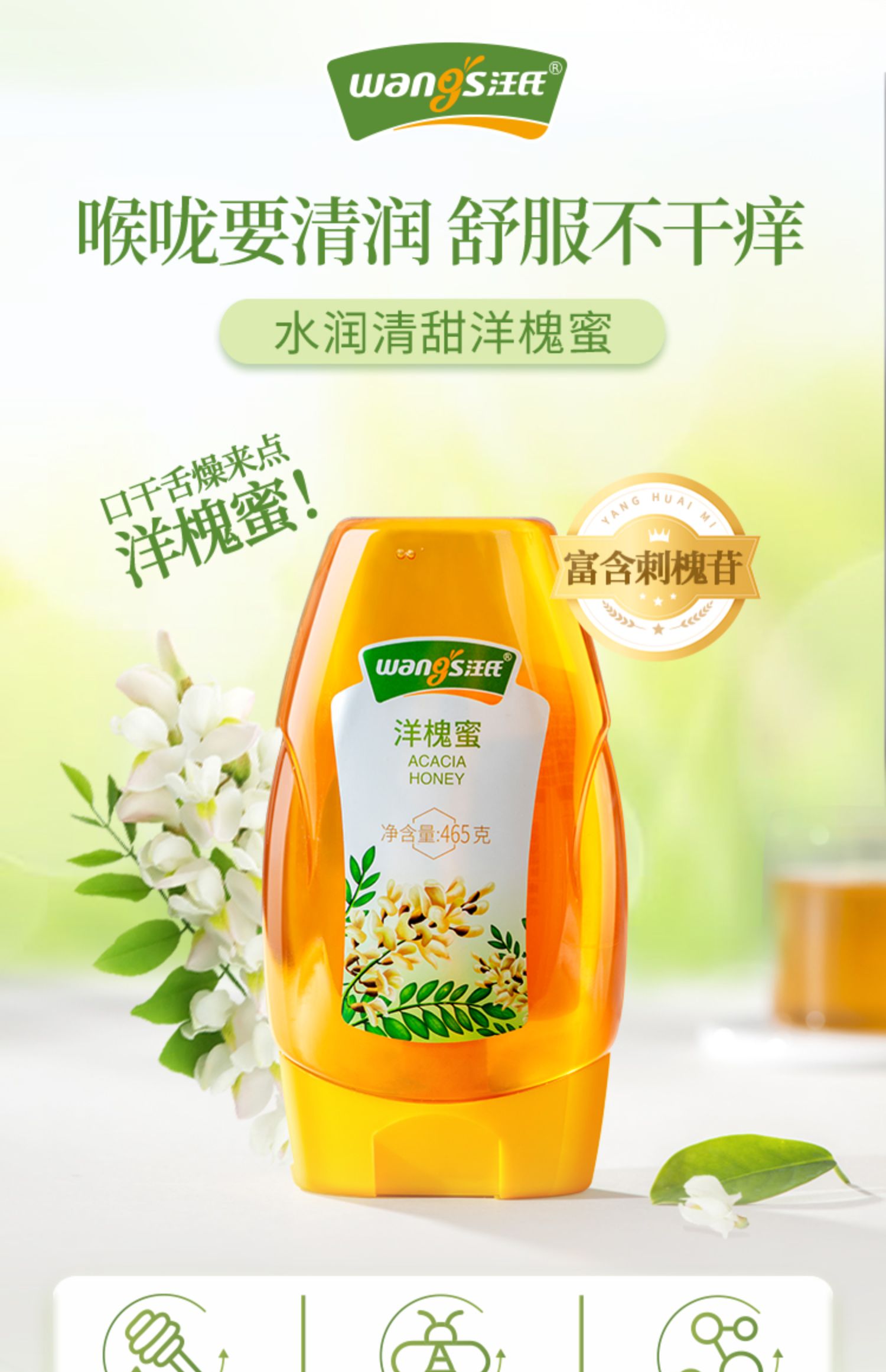 汪氏天然洋槐蜜品牌健康食用液态秦岭深山槐花蜜清甜美味蜂蜜465g