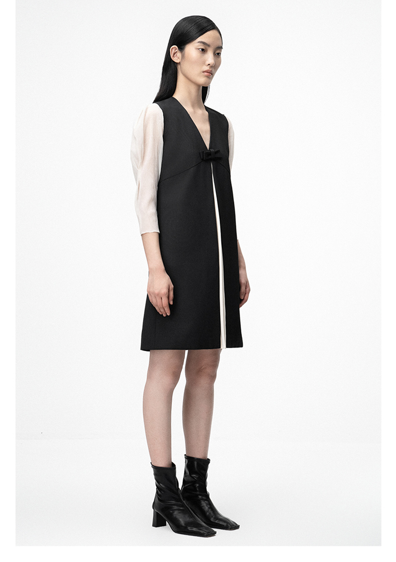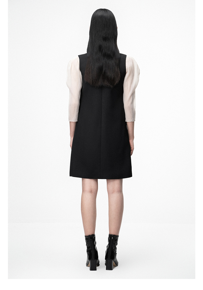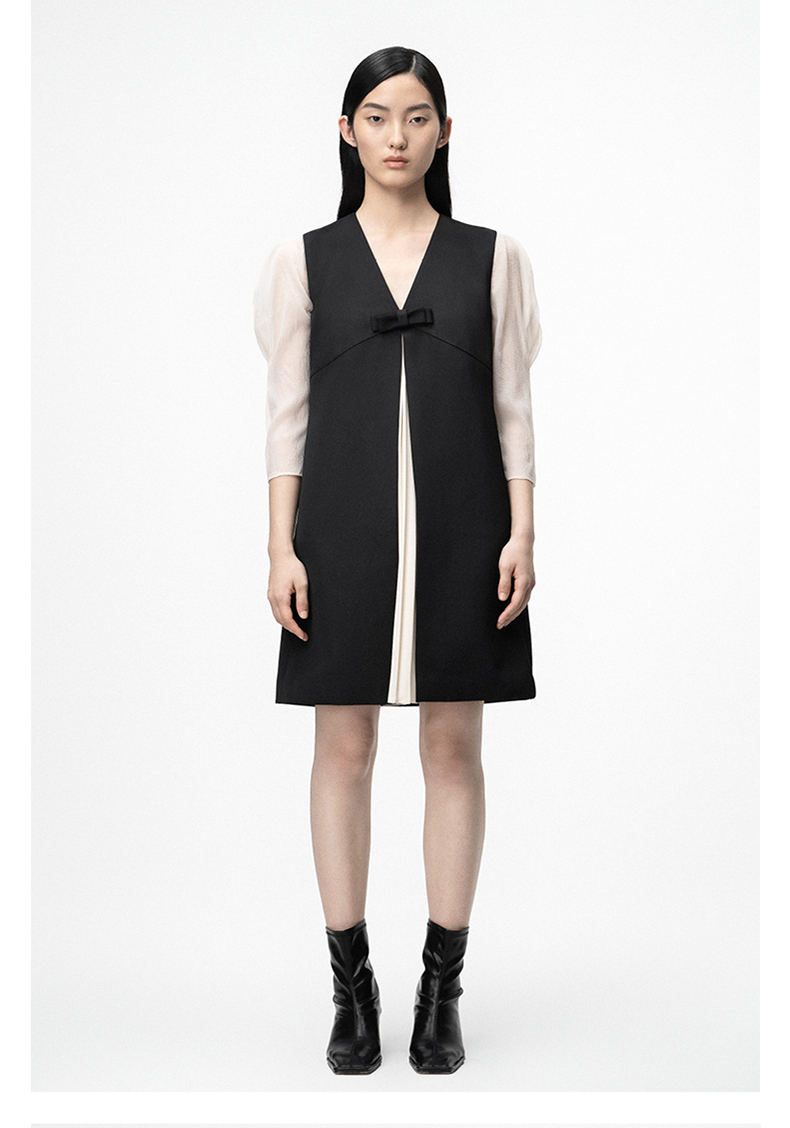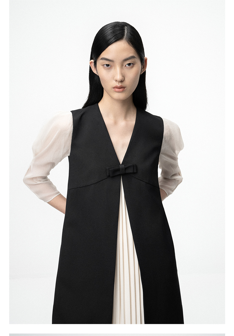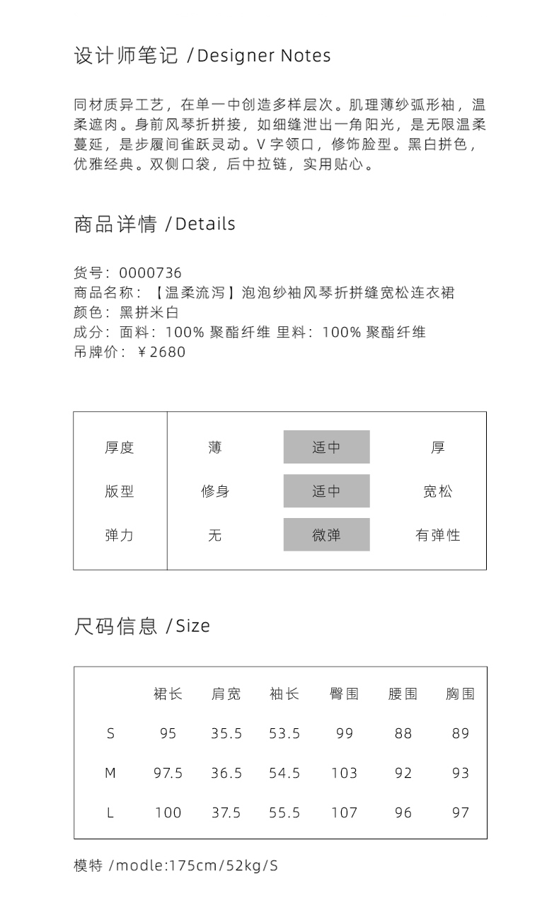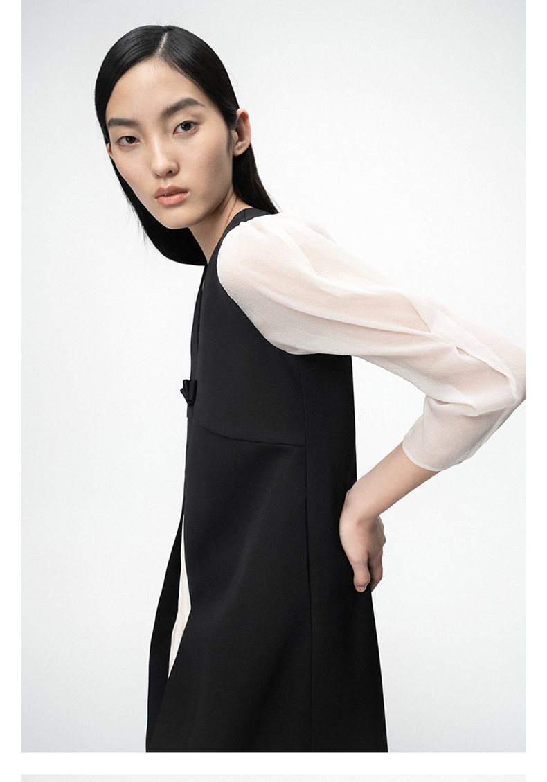 【温柔流泻】黑拼米白泡泡纱袖风琴折拼缝宽松连衣裙/0000736