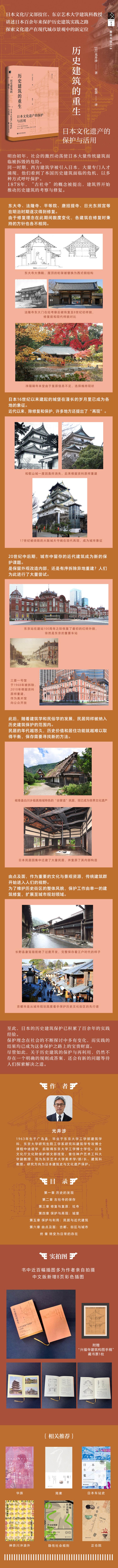 历史建筑是人类重要的文化遗产之一。显著的空间属性与公共属性,使得它们总是处在公众的目光注视之下。正因如此,历史建筑在保护与修缮方面始终面临着诸多难题。日本对历史建筑的保护始于近代化之初的拆毁和破坏。大量历史建筑的急速消失,催生了人们心中的保护意识。从古老的寺院与神社,到作为城市象征的城堡与近代建筑,再到构筑了日常生活的民居与传统街区,对历史建筑的评判标准在探索中不断变化,保护对象随之变得多元。百余年来,以此为基础,日本完成了大量关于历史建筑修缮与传统景观维护的实践。本书聚焦日本建立历史建筑相关保护制度的过程,并尝试以复原为焦点,回顾关于历史建筑公共价值的讨论。在保护历史建筑时,如何令“历史文化价值”“建筑艺术价值”“实用经济价值”达到平衡,一直是需要我们共同思考的问题。