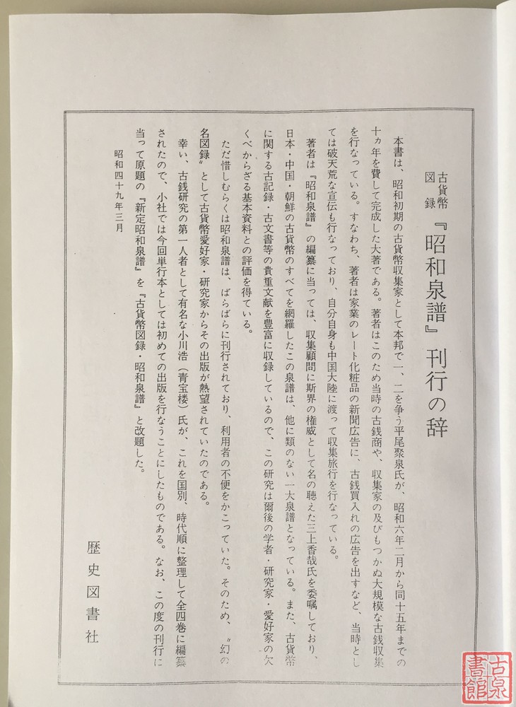 原书分为四卷,分别为日本钱、中国古文钱,中国历代钱上、中国历代钱下、朝鲜钱。该谱始刊于昭和六年(1931),基本成于昭和九年之冬,昭和十二年夏复益明钱,昭和十三年再增印少量清钱之编。共阅八寒暑,全谱始成。