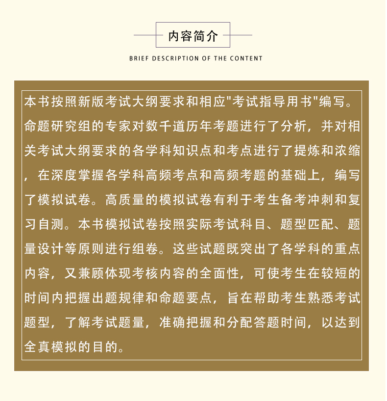 本书按照新版考试大纲要求和相应"考试指导用书"编写。命题研究组的专家对数千道历年考题进行了分析,并对相关考试大纲要求的各学科知识点和考点进行了提炼和浓缩,在深度掌握各学科高频考点和高频考题的基础上,编写了模拟试卷。高质量的模拟试卷有利于考生备考冲刺和复习自测。本书模拟试卷按照实际考试科目、题型匹配、题量设计等原则进行组卷。这些试题既突出了各学科的重点内容,又兼顾体现考核内容的全面性,可使考生在较短的时间内把握出题规律和命题要点,旨在帮助考生熟悉考试题型,了解考试题量,准确把握和分配答题时间,以达到全真模拟的目的。