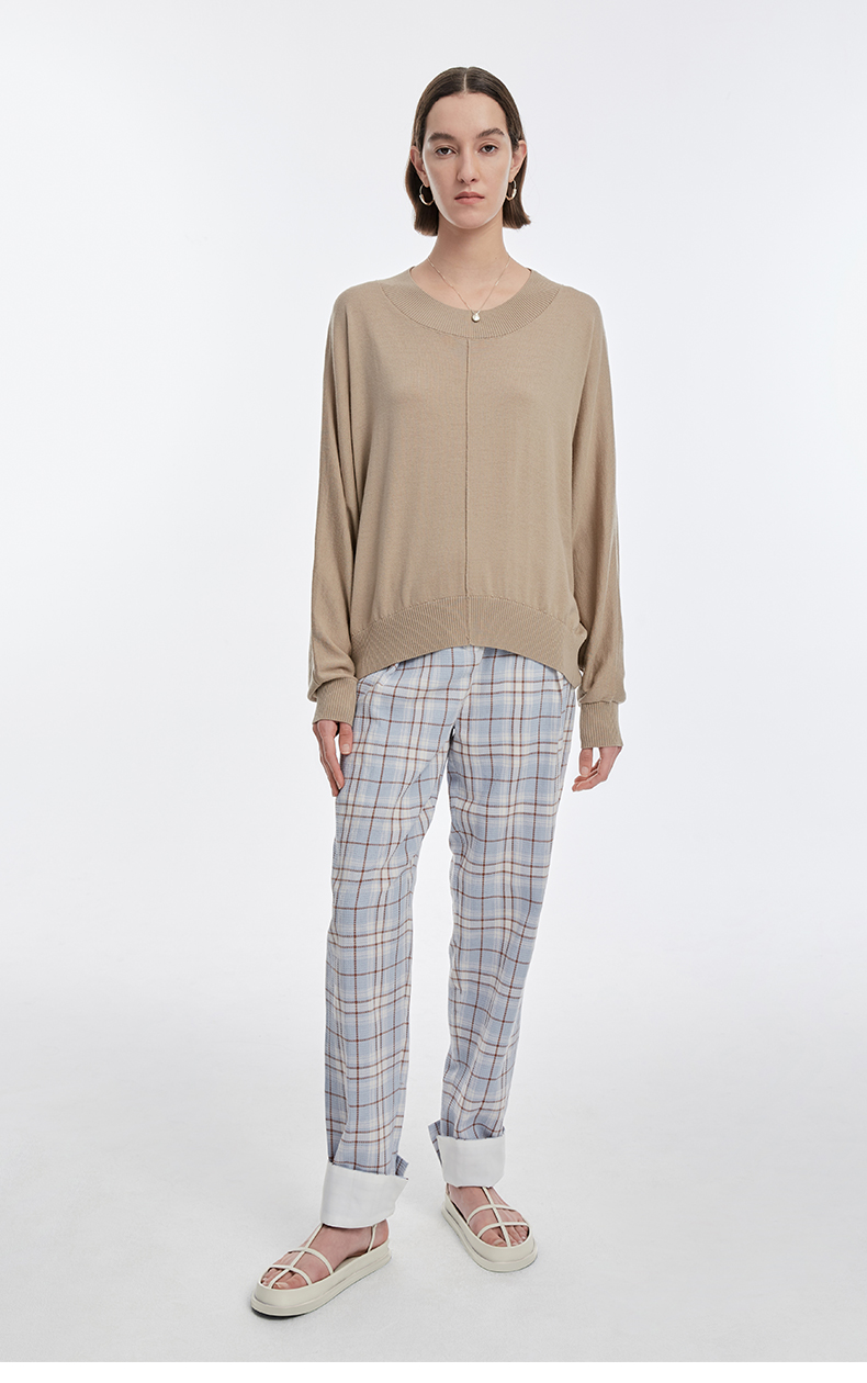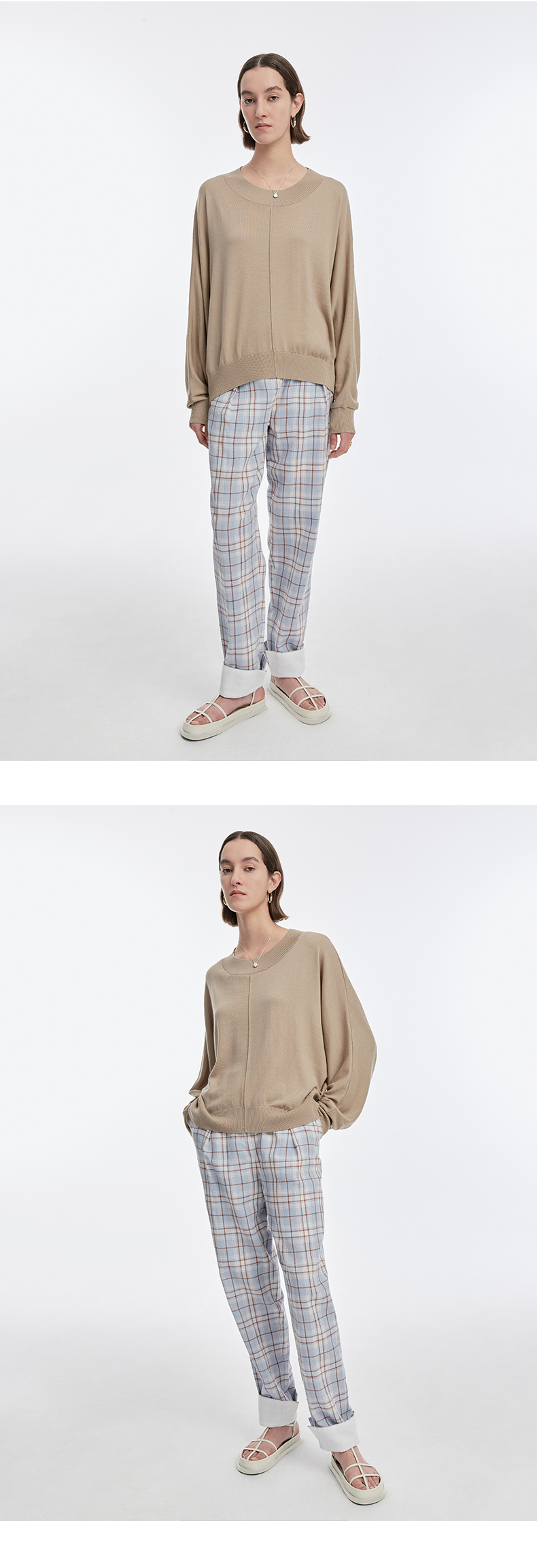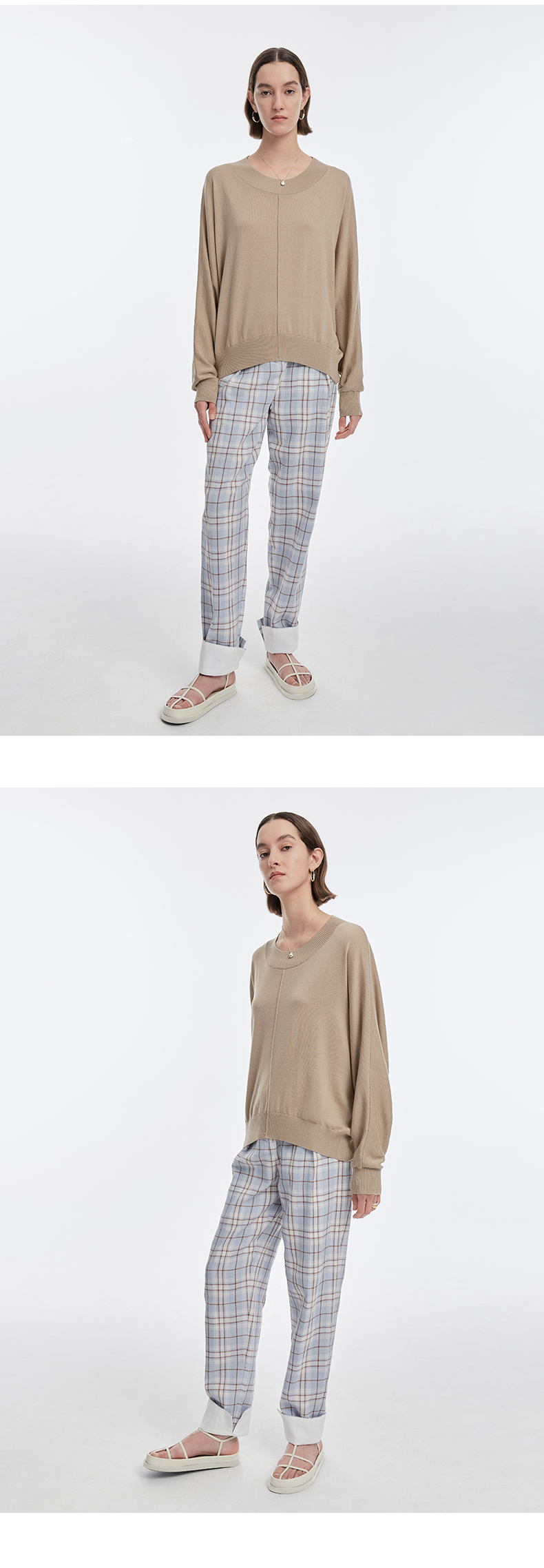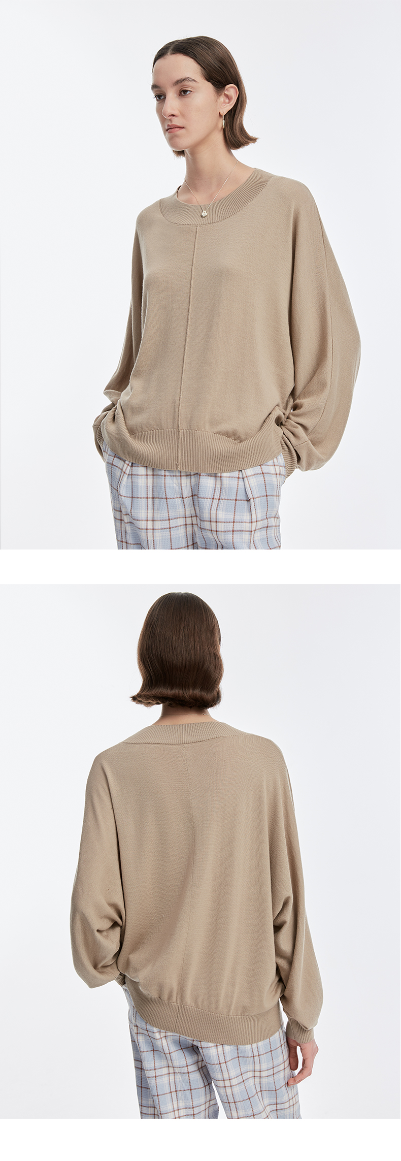 HIDEMI 美利奴羊毛廓形落肩宽松毛衣/奶茶色/香芋粉紫