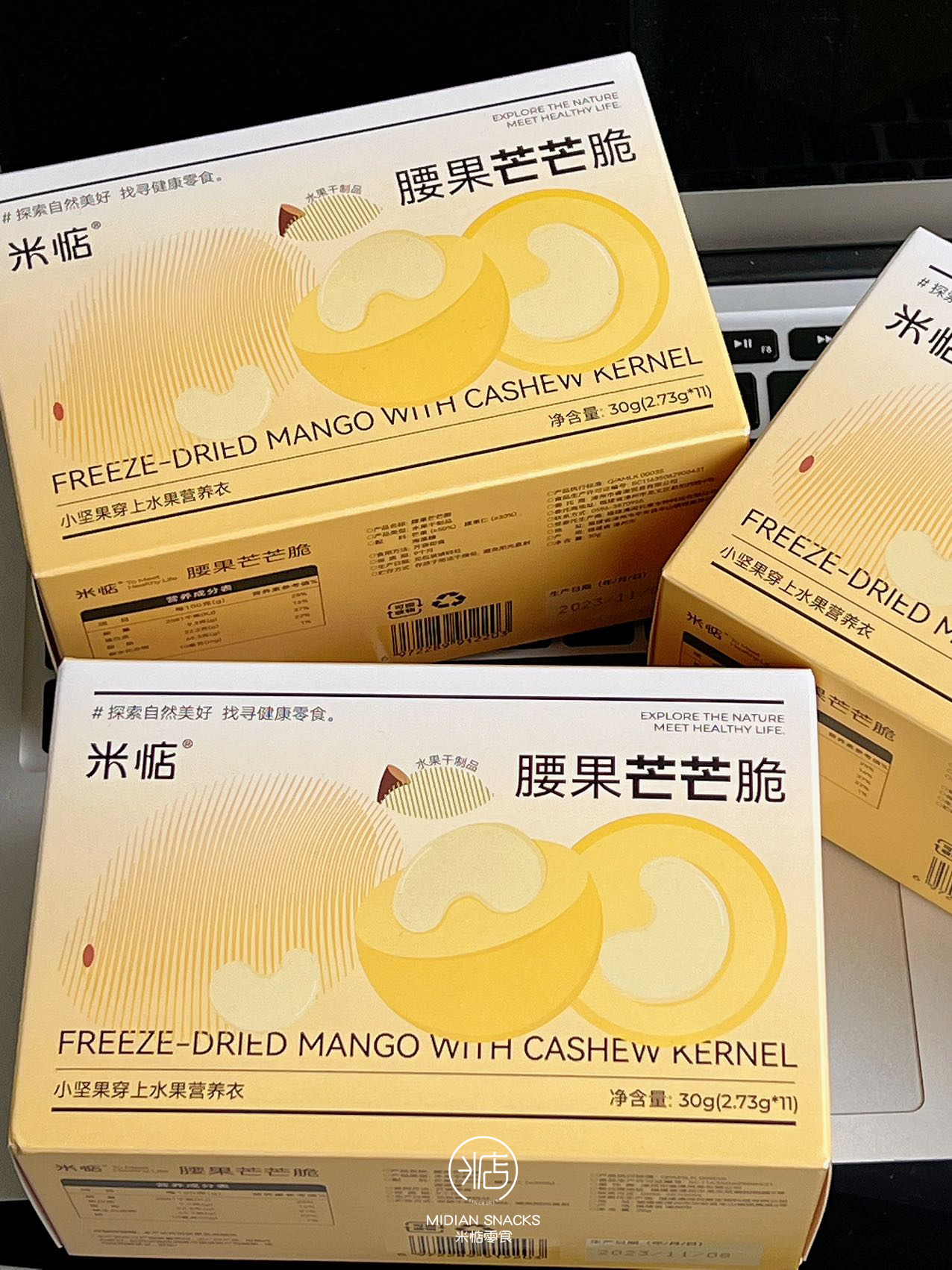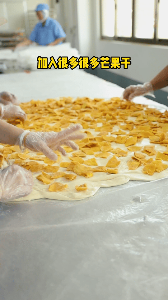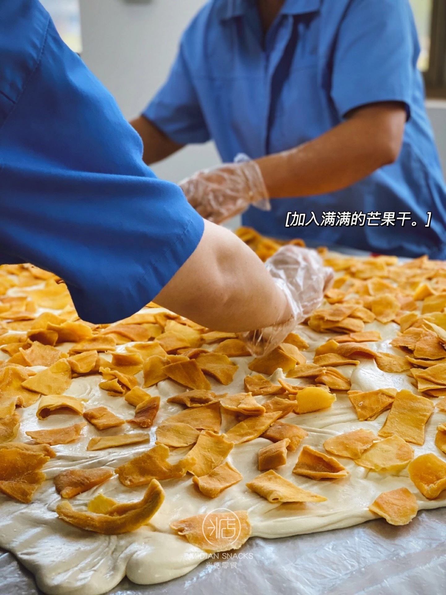 芒果打浆铺盘,加入腰果仁后快速冻干