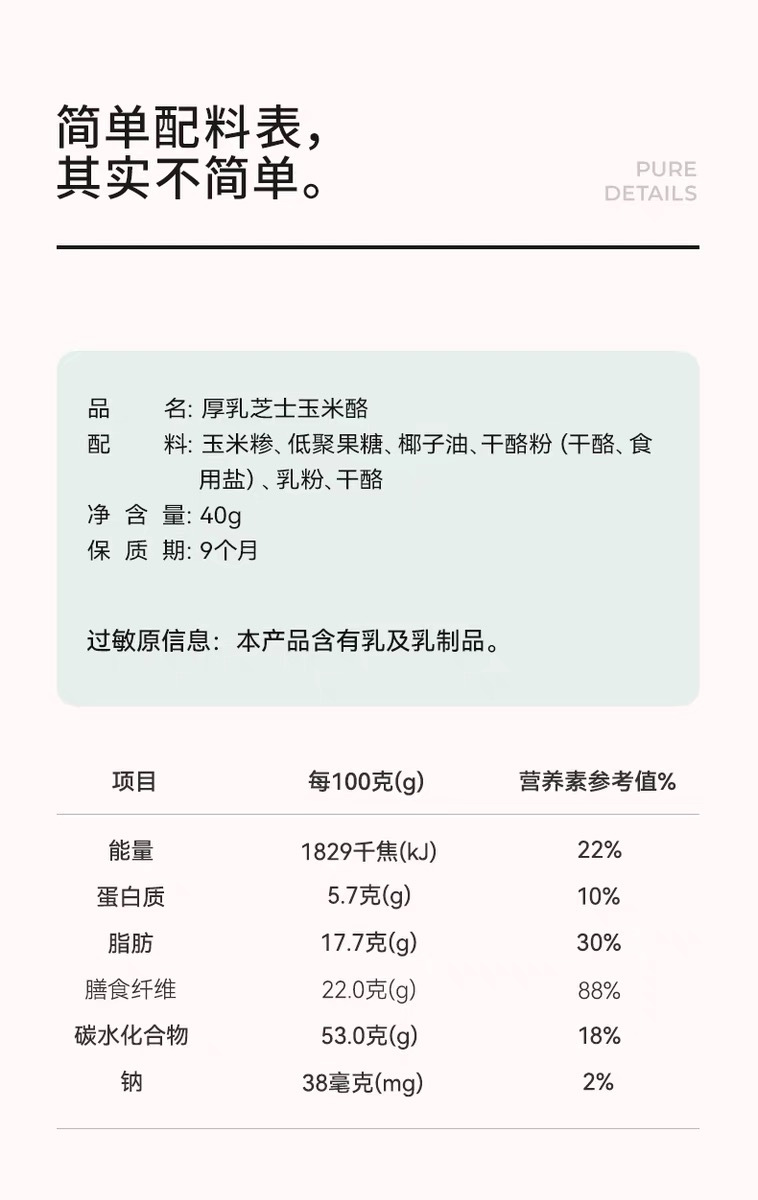 【配料表】:玉米糁、低聚果糖、椰子油、干酪粉