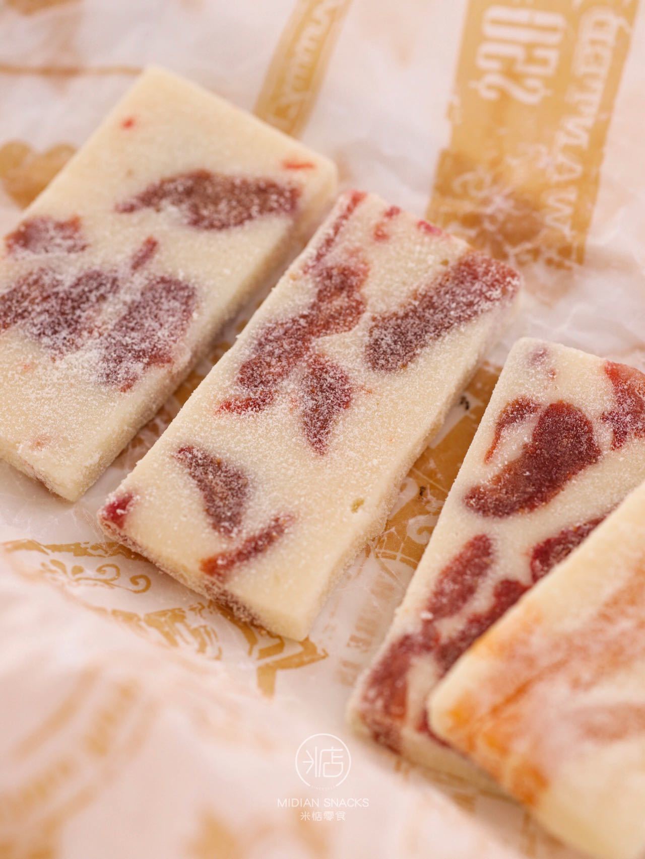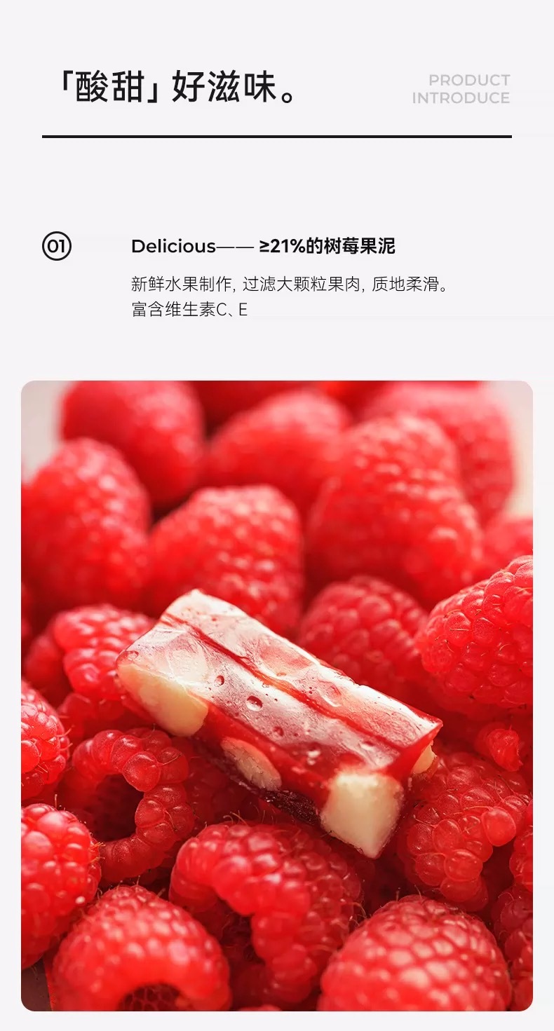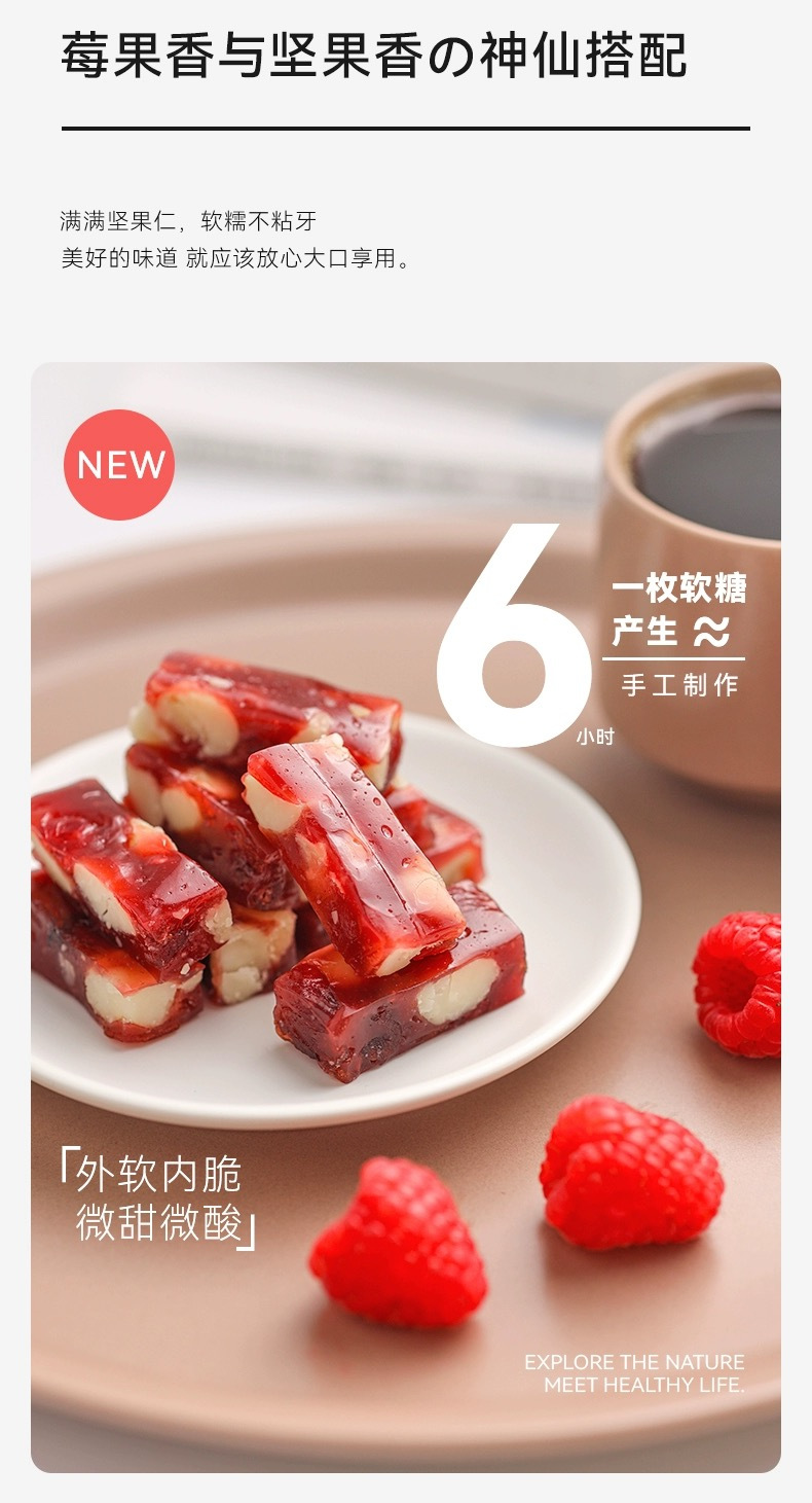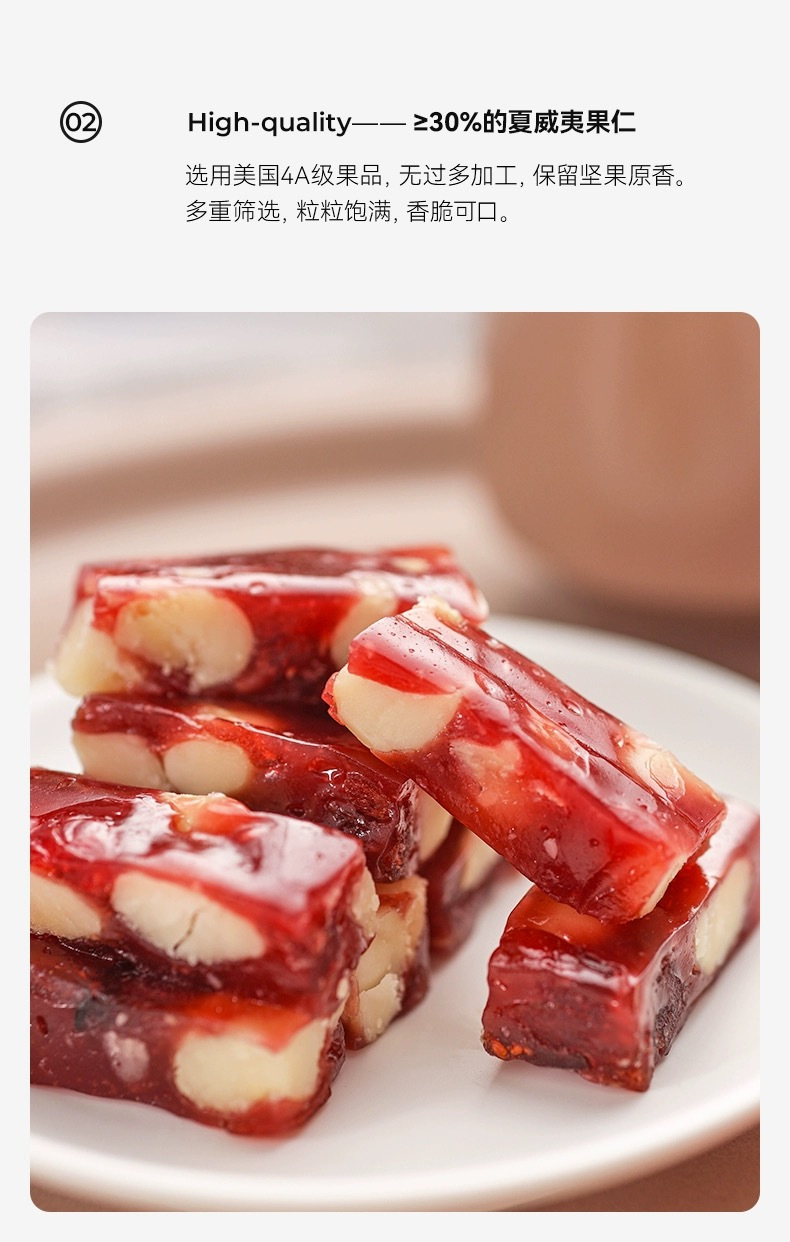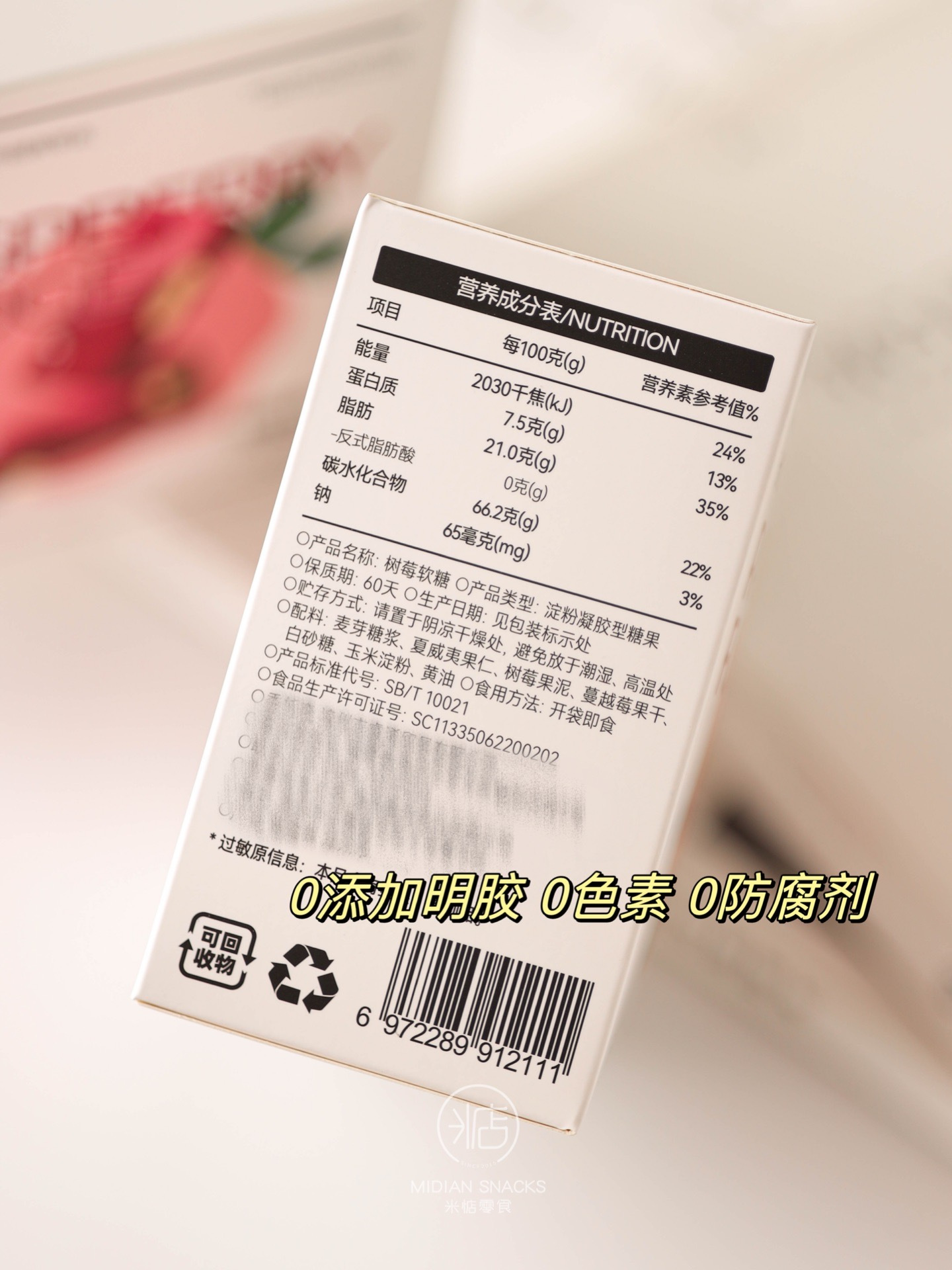 【配料表】:麦芽糖浆、夏威夷果仁、树莓果茸、蔓越莓果干、白砂糖、玉米淀粉、黄油