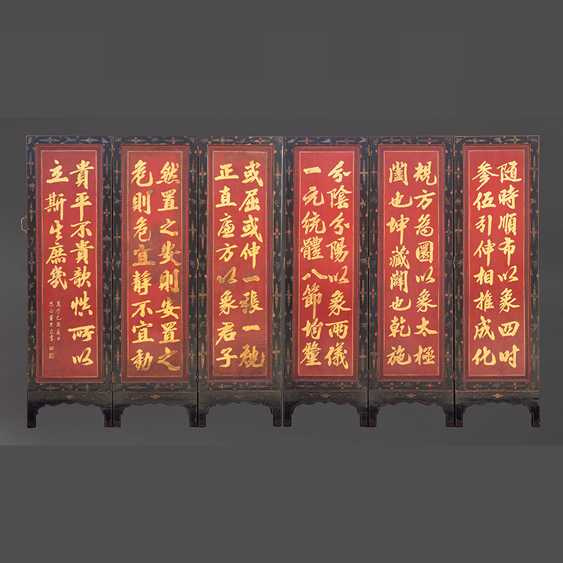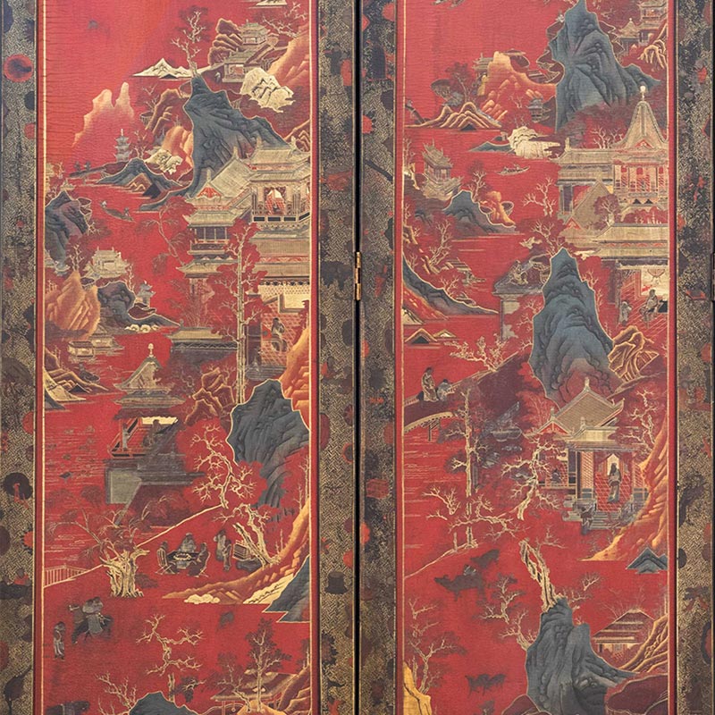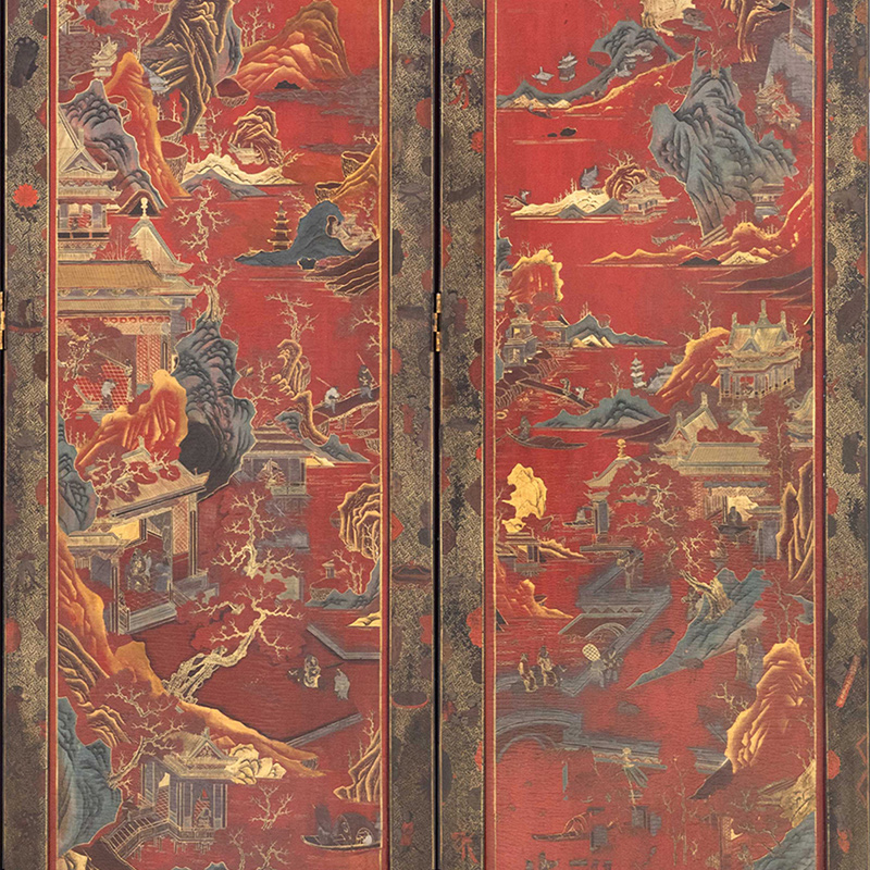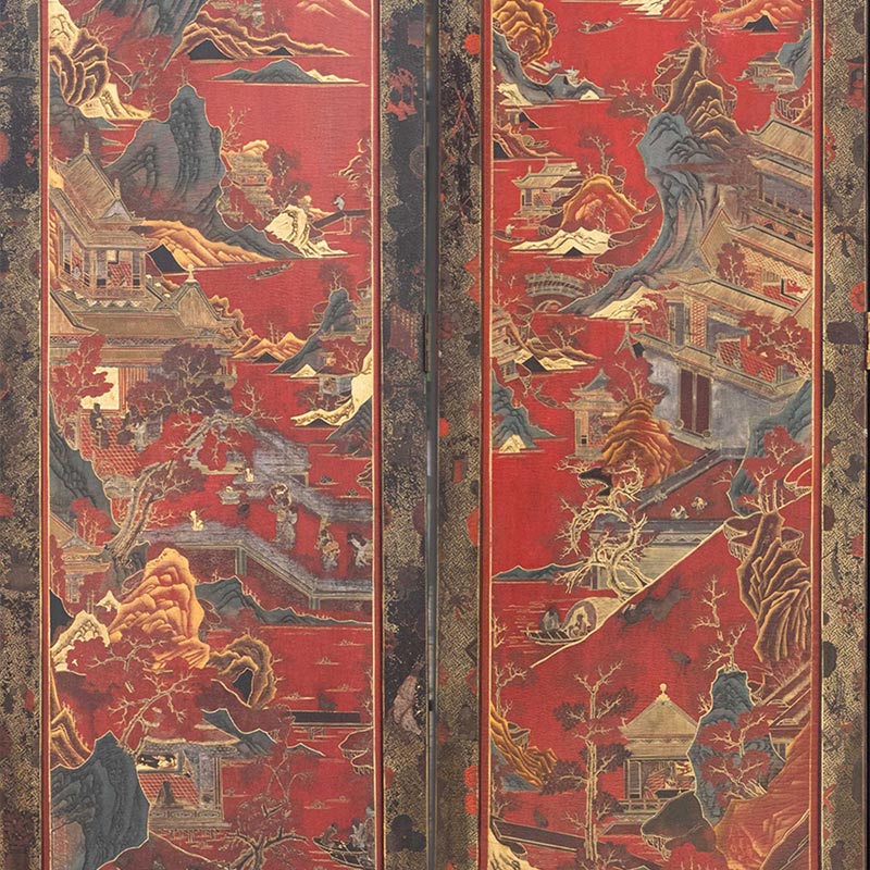 19世纪中国出品山水亭台主题描金装饰红漆地款彩双面六曲屏风