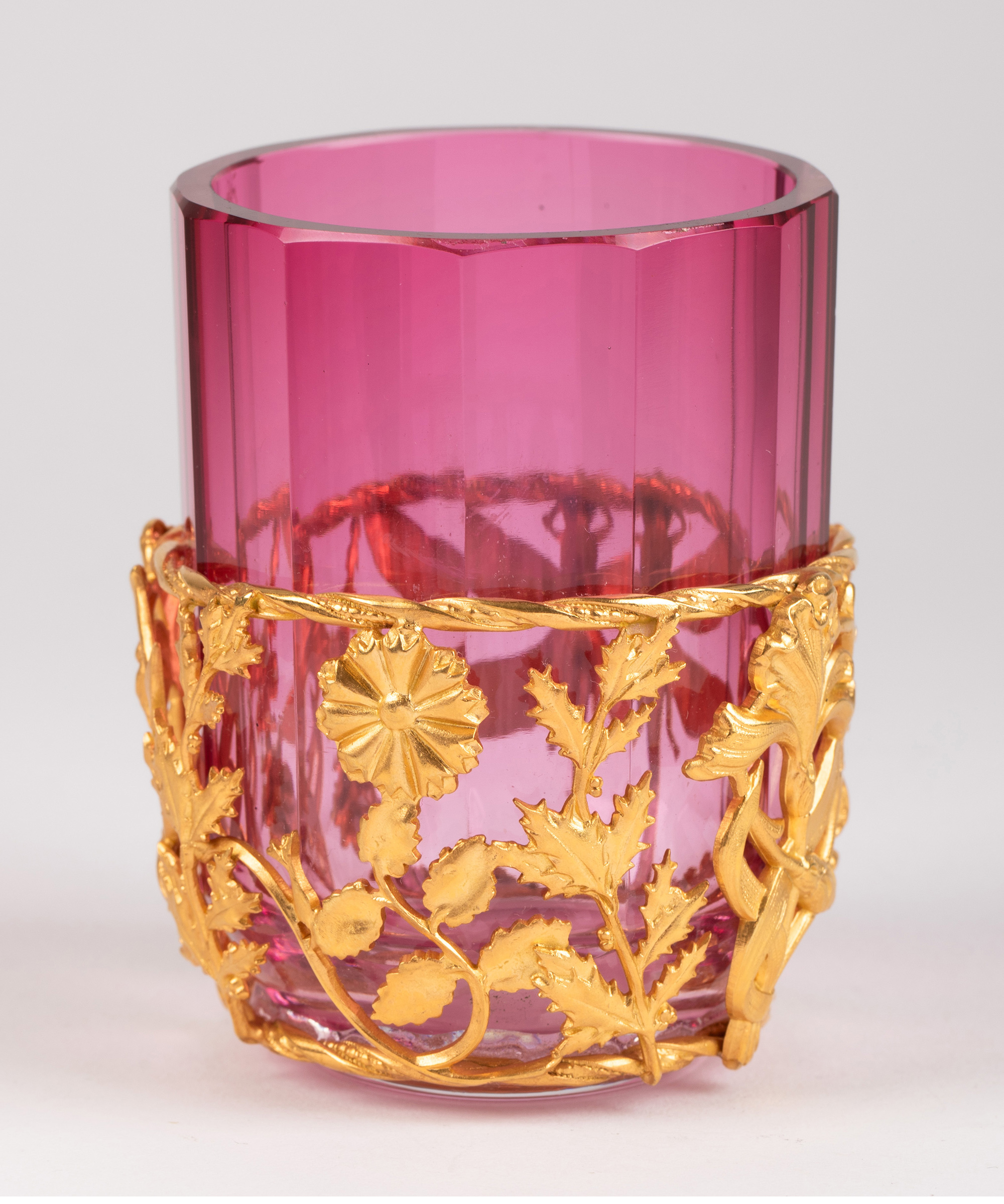 19世纪末法国出品新艺术风格蜻蜓主题铜鎏金雕饰玫粉色水晶梳洗套件