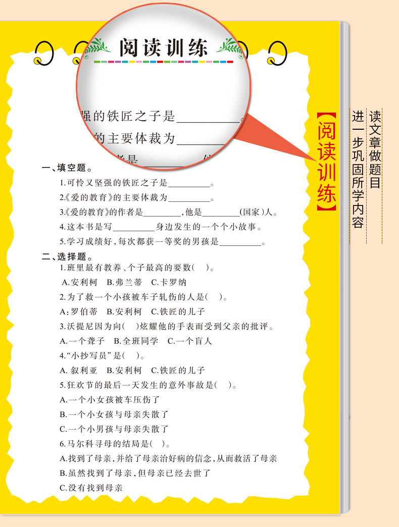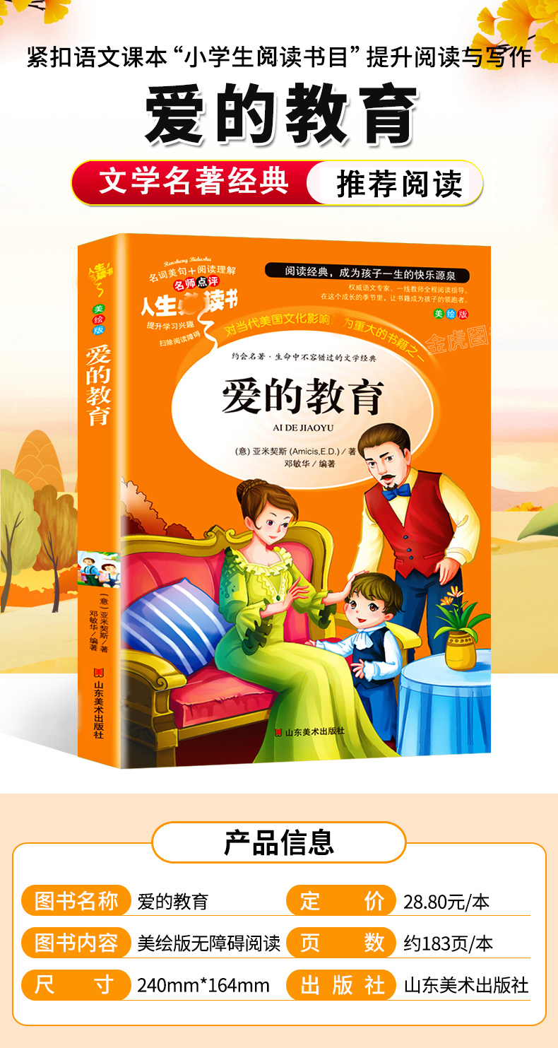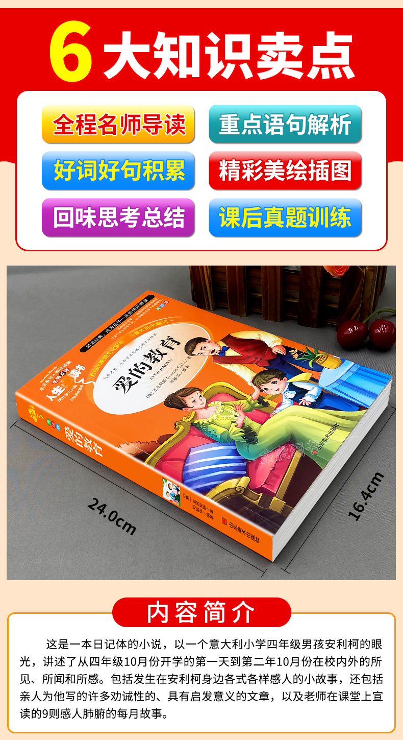 亚米契斯编著的《爱的教育》是一本日记体的小说,以一个意大利小学四年级男孩安利柯的眼光,讲述了从四年级10月份开学的第一天到第二年10月份在校内外的所见、所闻和所感。包括发生在安利柯身边各式各样感人的小故事,还包括亲人为他写的许多劝诫性的、具有启发意义的文章,以及老师在课堂上宣读的9则感人肺腑的每月故事。