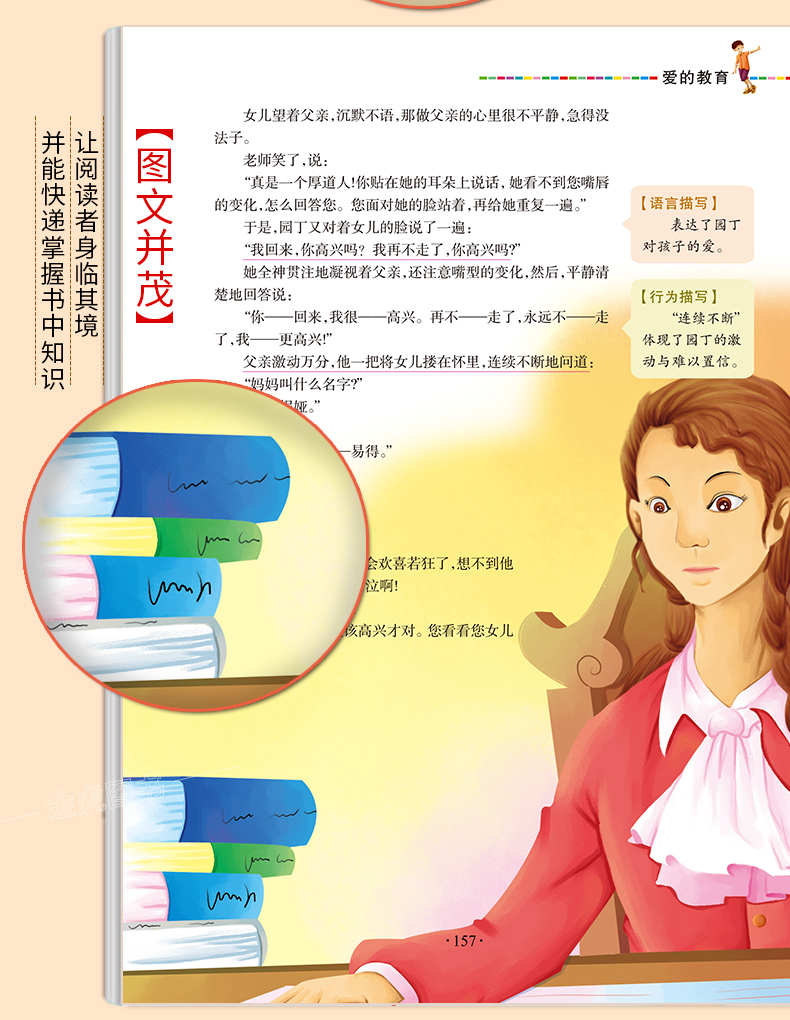 通过塑造一个个看似渺小,实则不凡的人物形象,在读者心中荡起一阵阵情感的波澜,使爱的美德永驻读者心中。整部小说以一个小学生的眼光审视着身边的美与丑、善与恶,完全在用爱去感受生活中的点点滴滴。