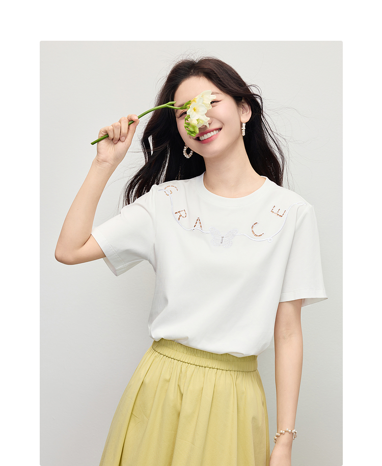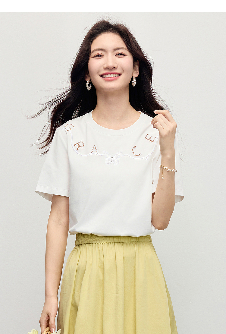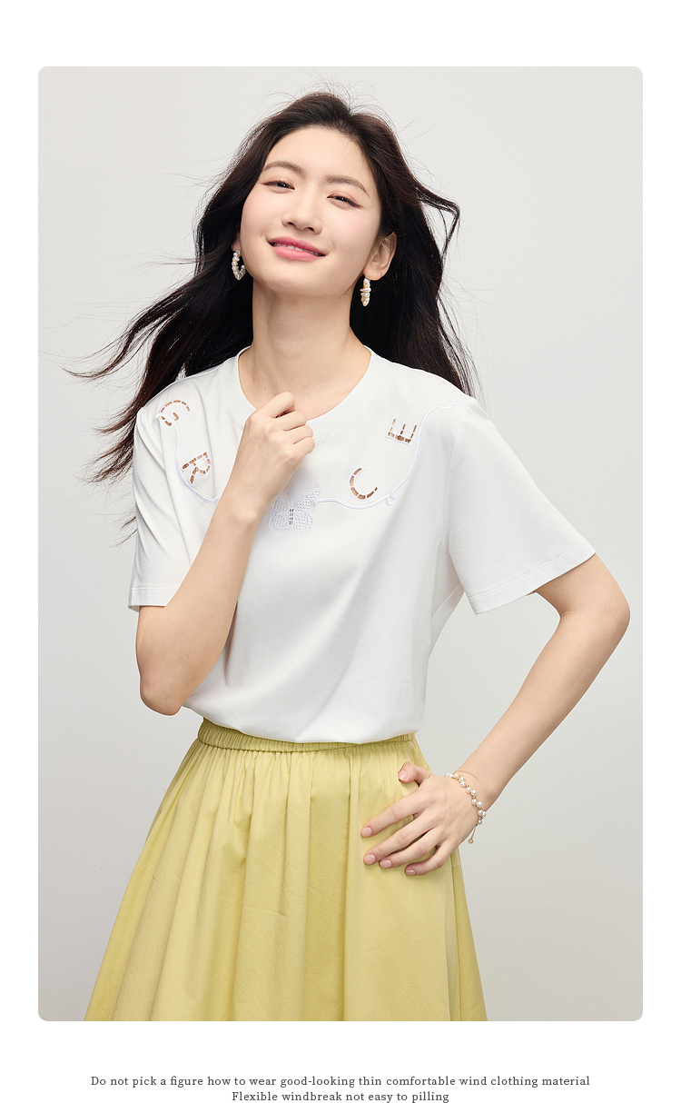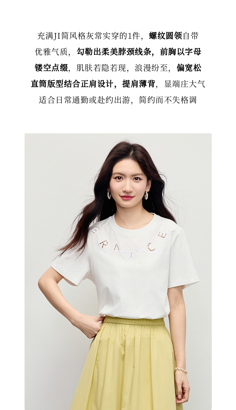 【五折购】熙世界镂空字母白色T恤短袖女2025夏季新款通勤休闲宽松显瘦上衣