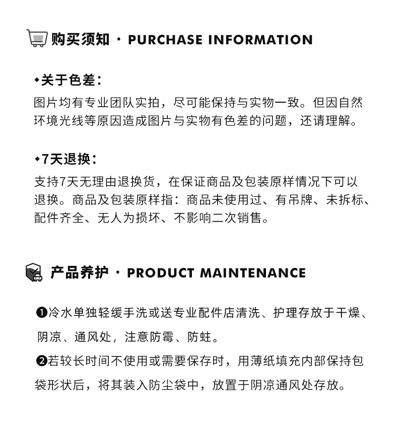 退换货原则:包内填充物都在,包包保护膜未撕,包内锁扣、内胆产品无遗失,不影响二次销售情况下可退 是否支持7天无理由退换货:支持