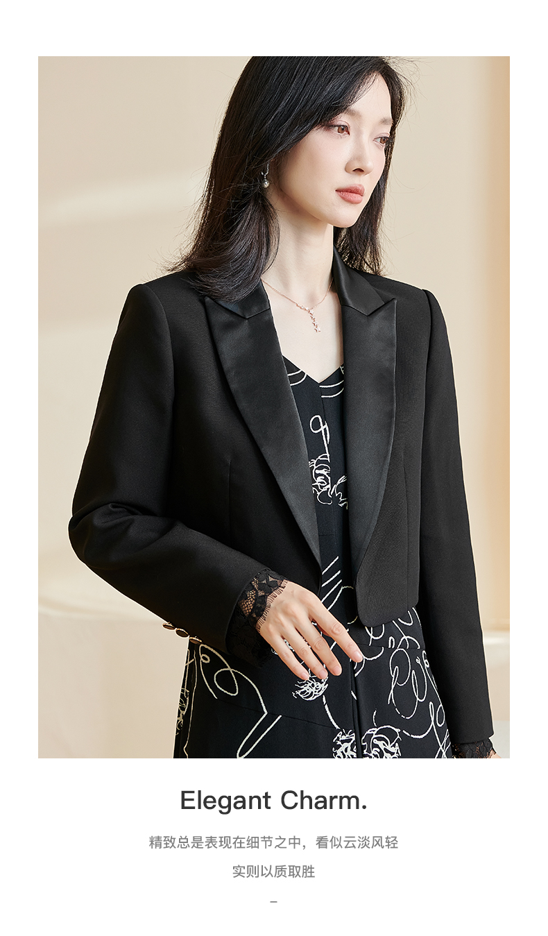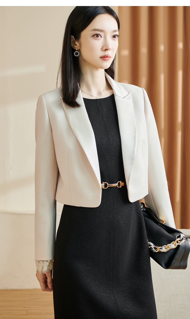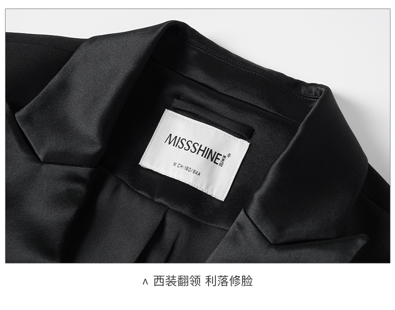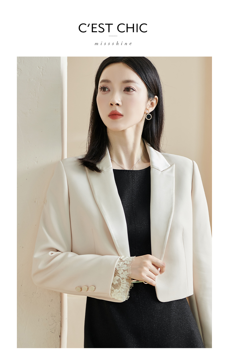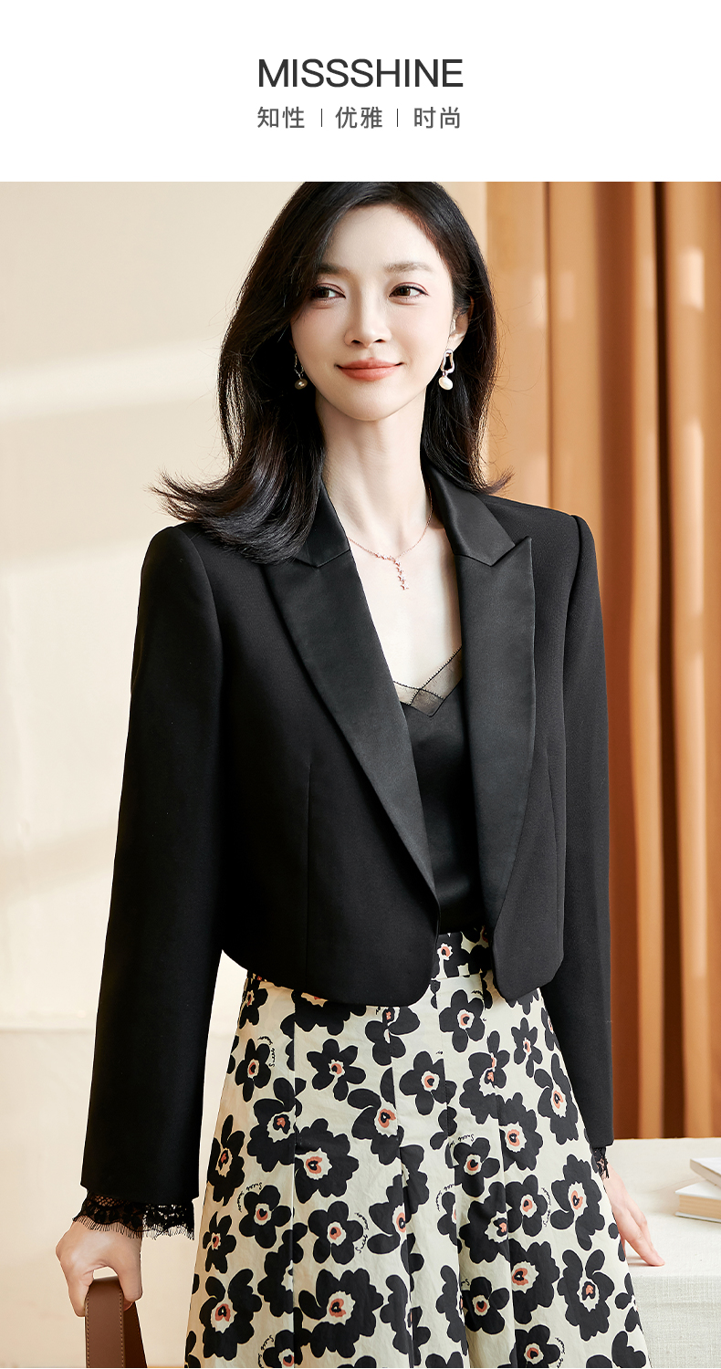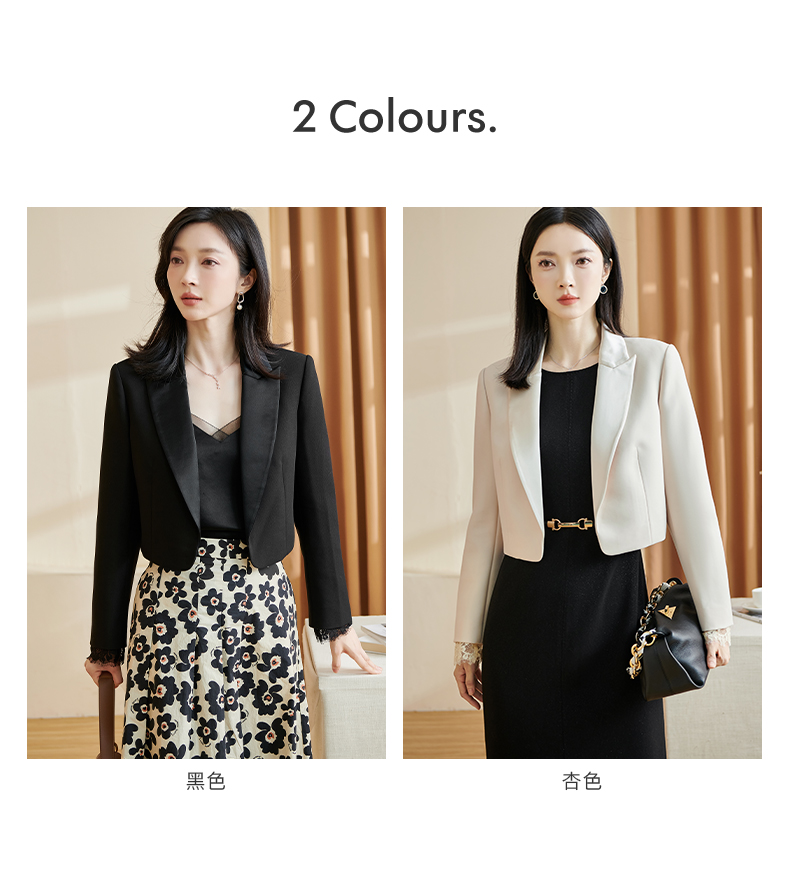 米思阳2026春季新款通勤杏色西装戗驳领拼接醋酸短款外套2597