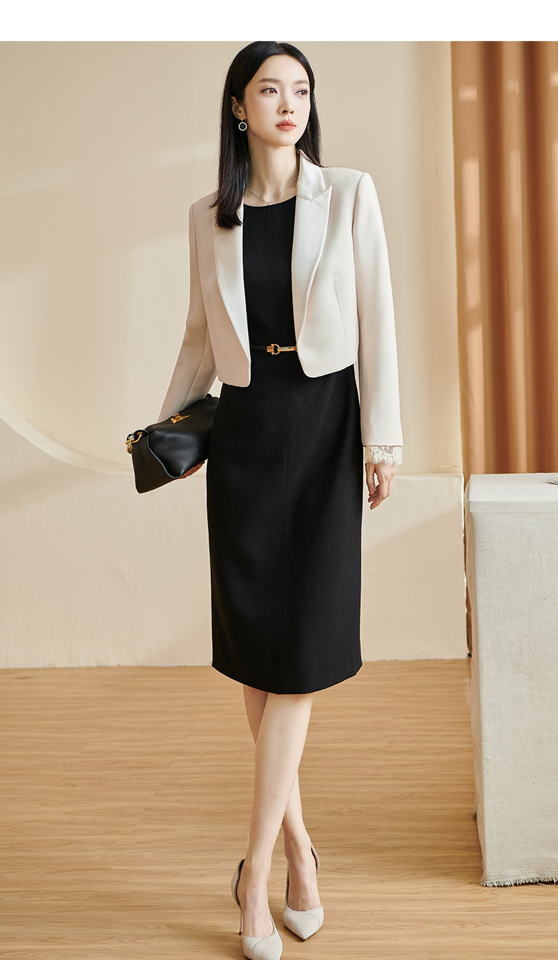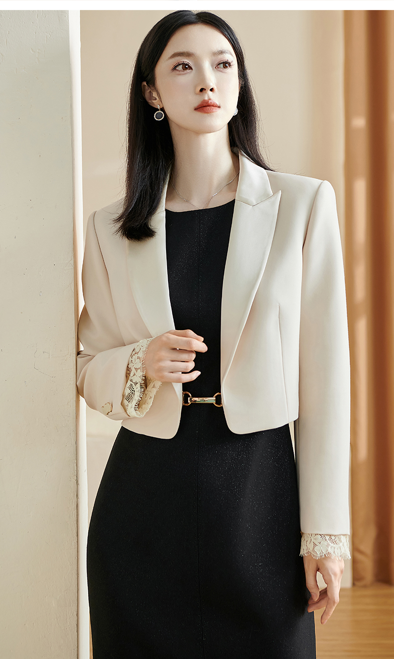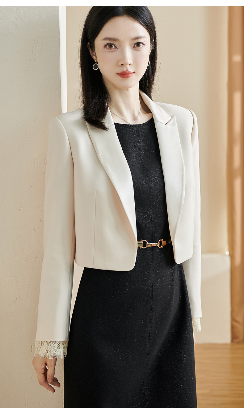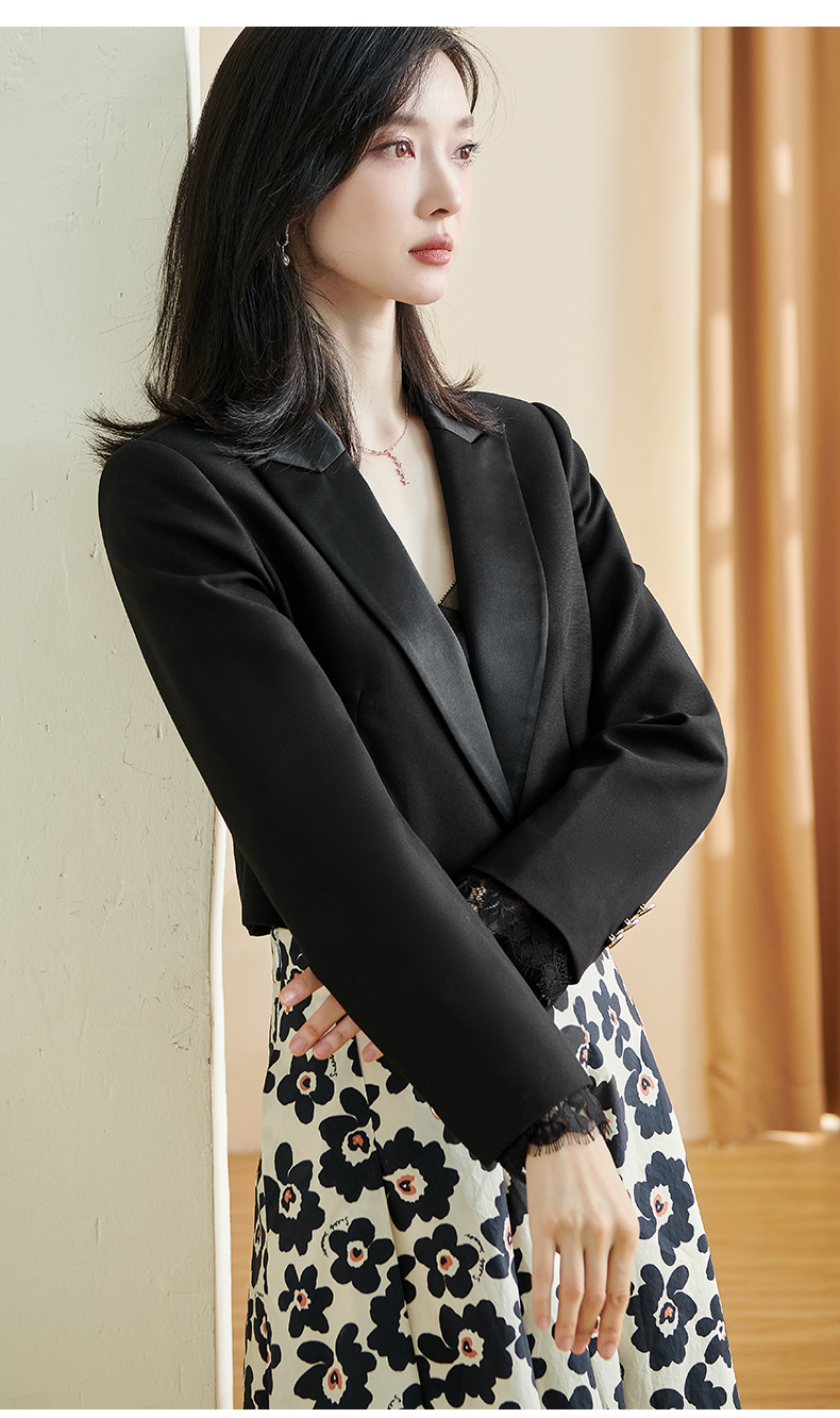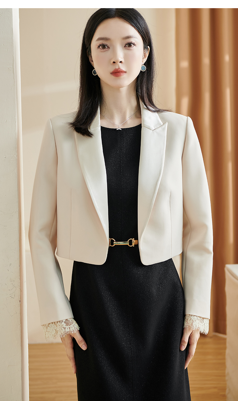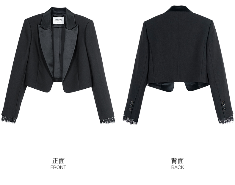 米思阳2026春季新款通勤杏色西装戗驳领拼接醋酸短款外套2597