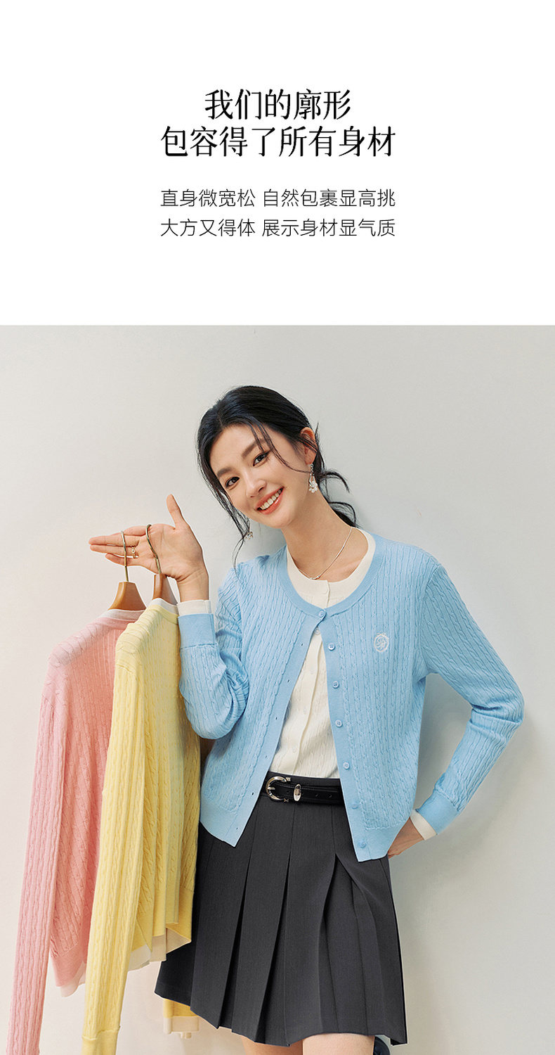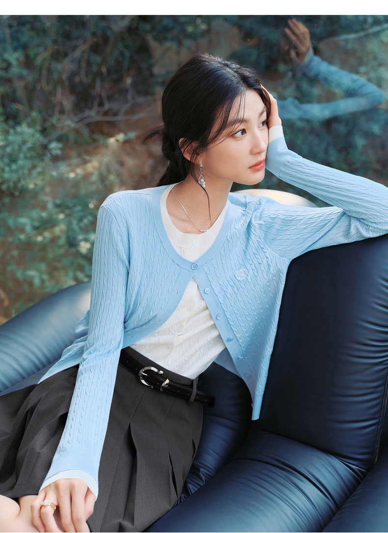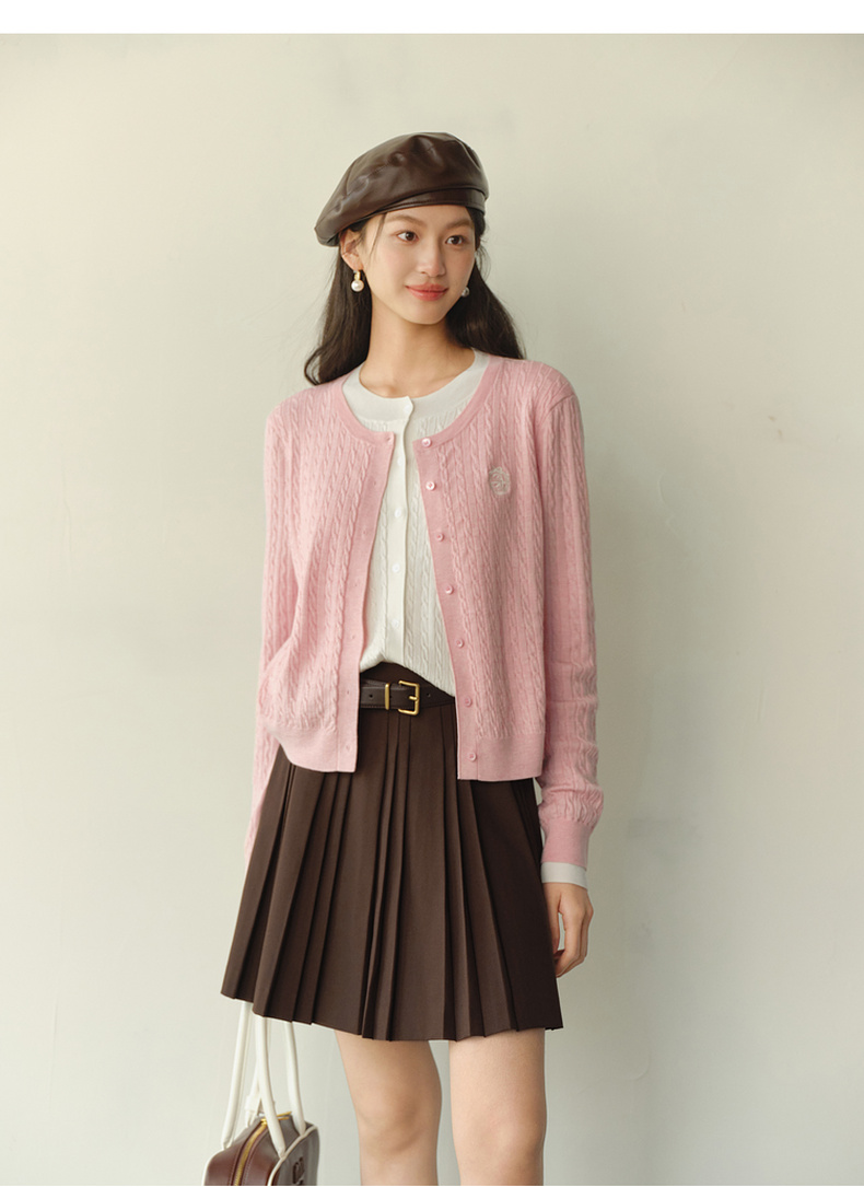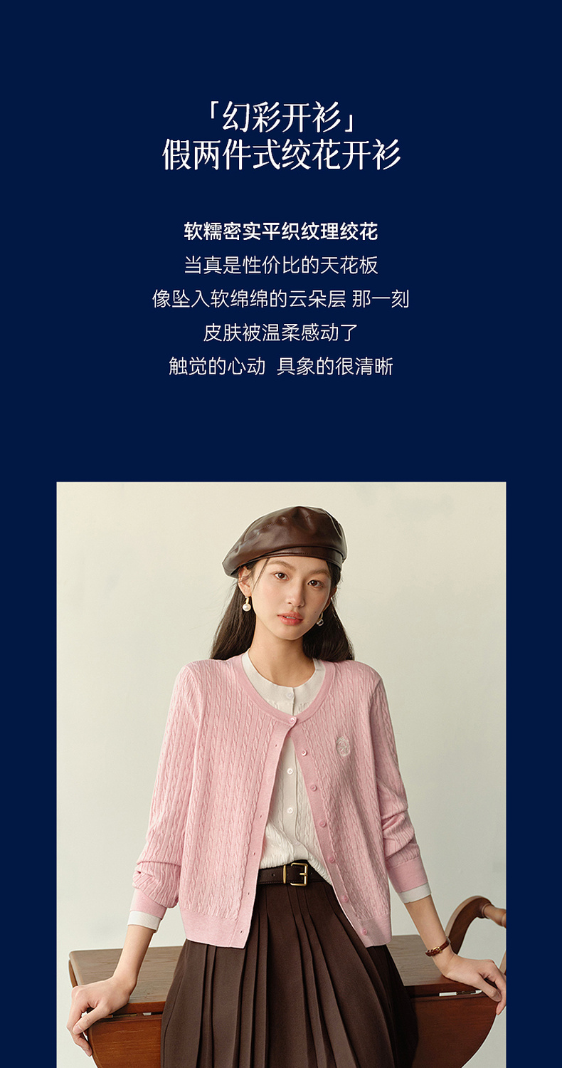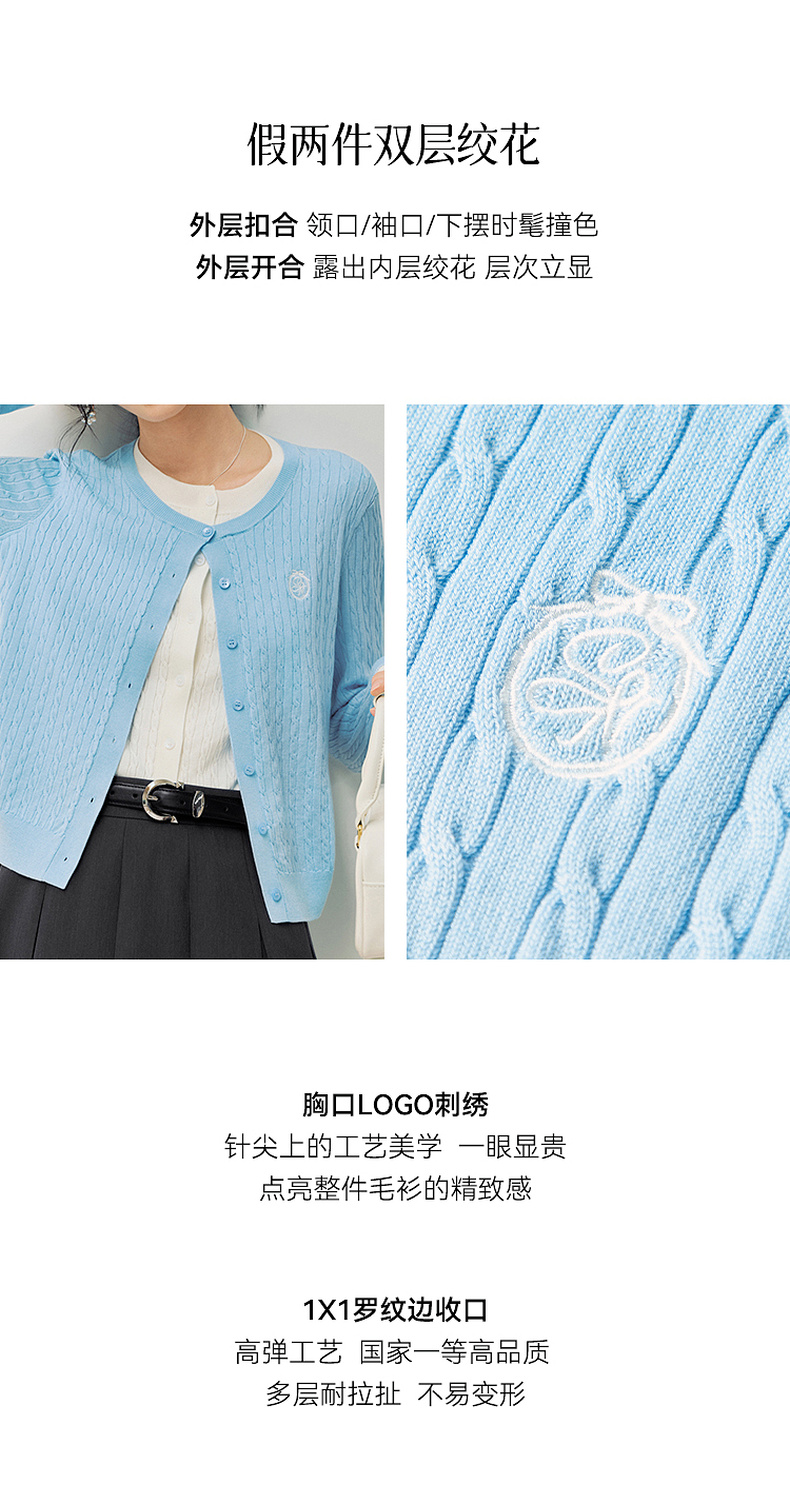 【严选】诗凡黎撞色假两件绞花针织开衫2026春新款刺绣圆领拼接设计感毛衣7HC430541
