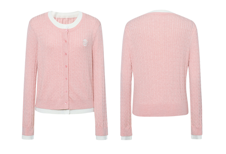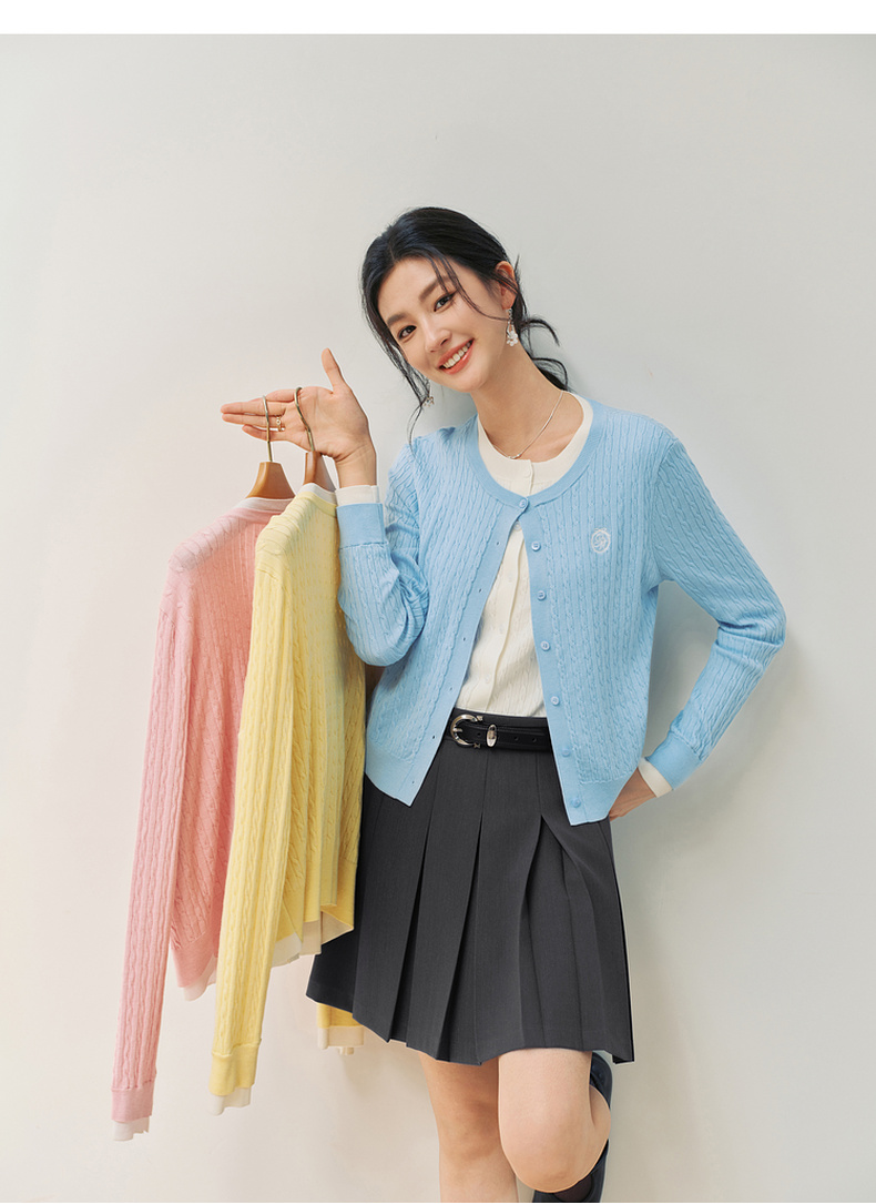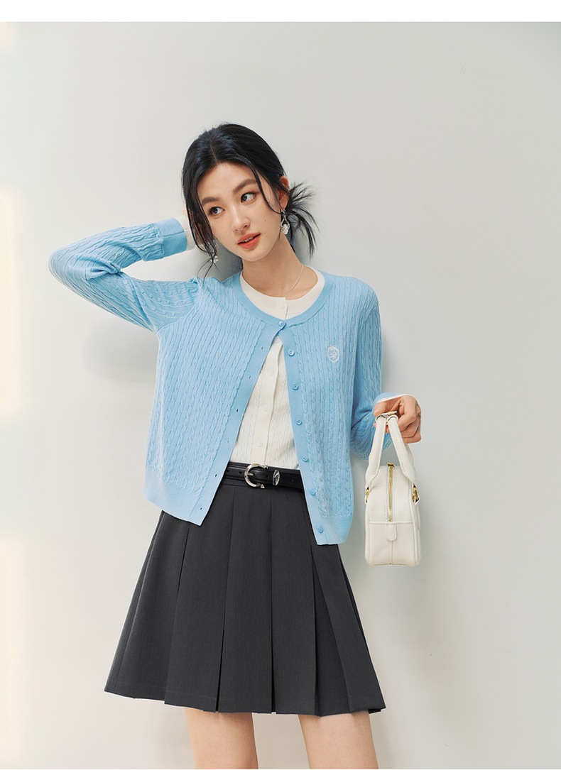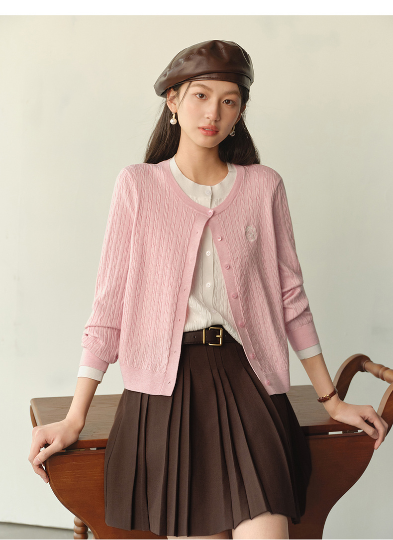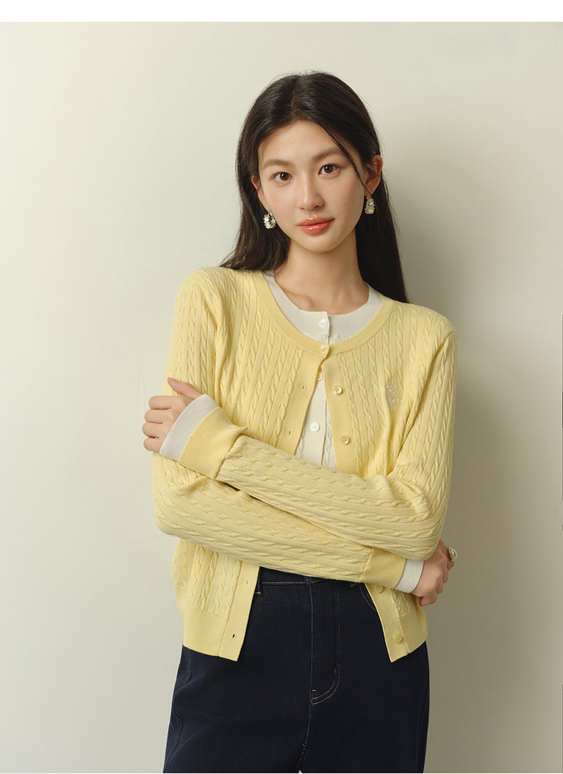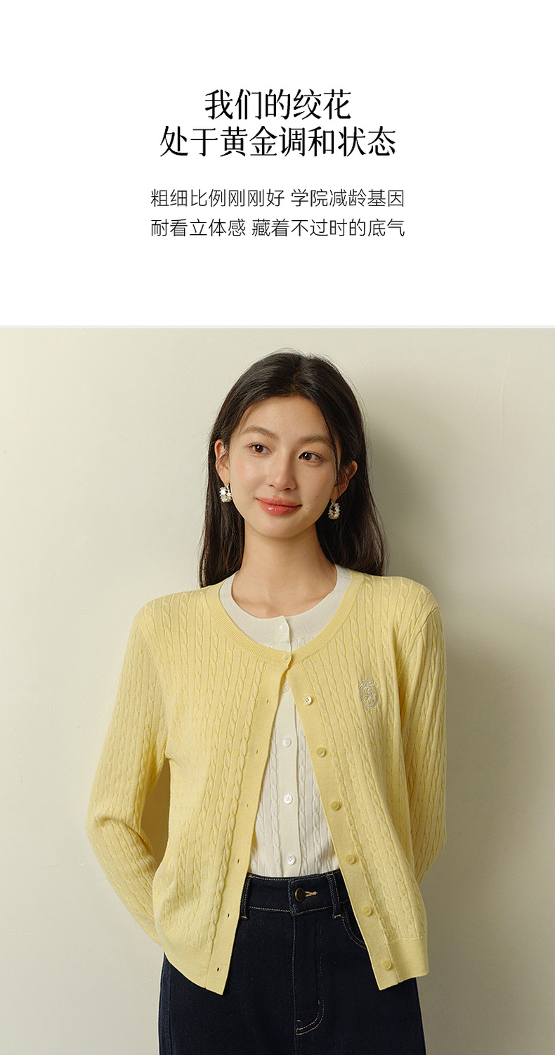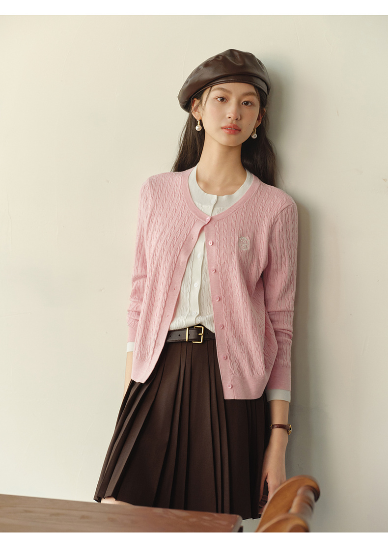 【严选】诗凡黎撞色假两件绞花针织开衫2026春新款刺绣圆领拼接设计感毛衣7HC430541