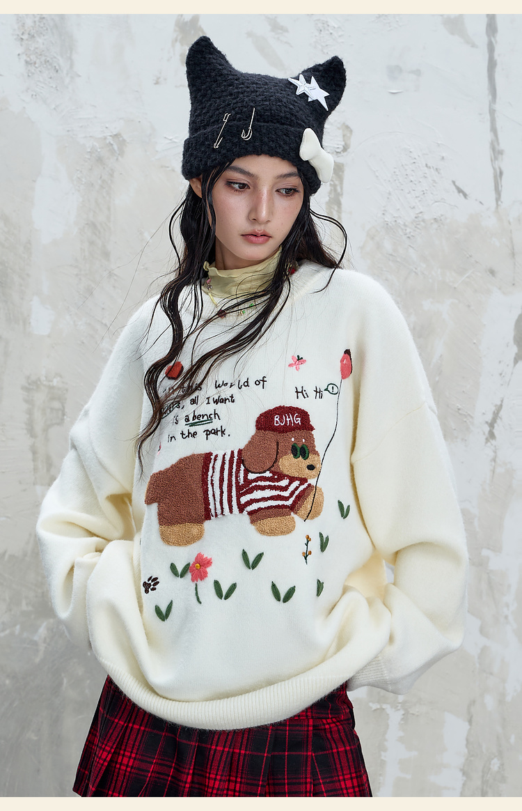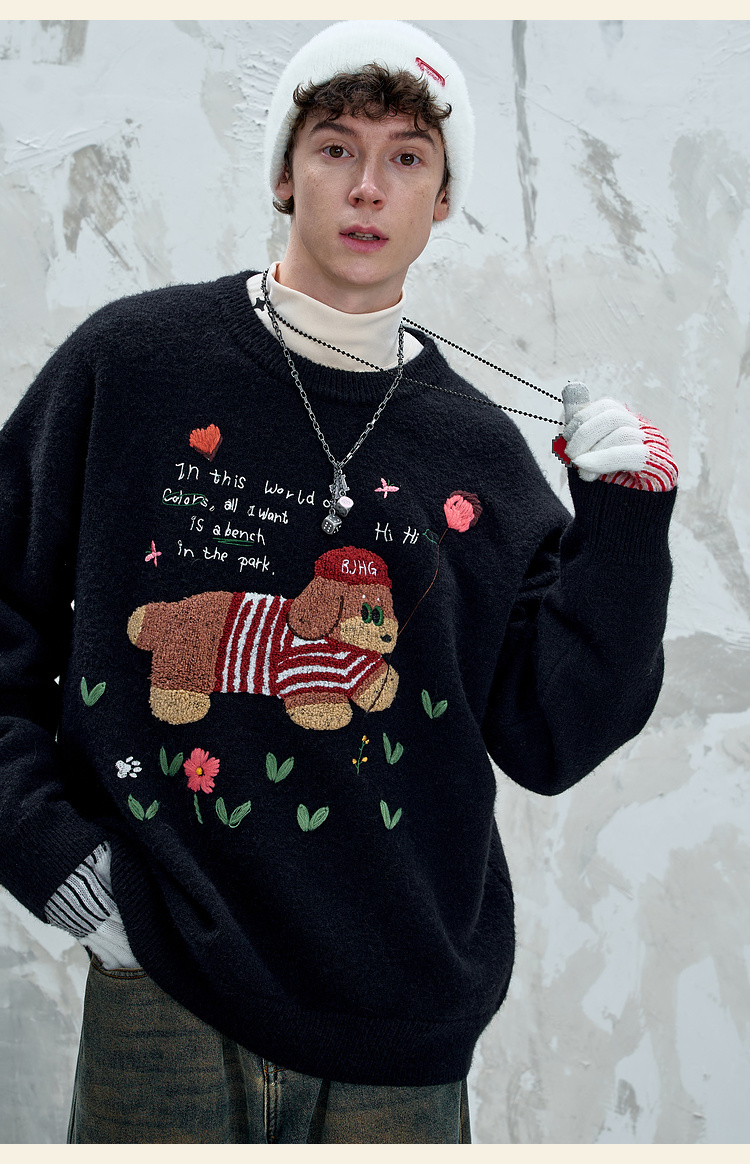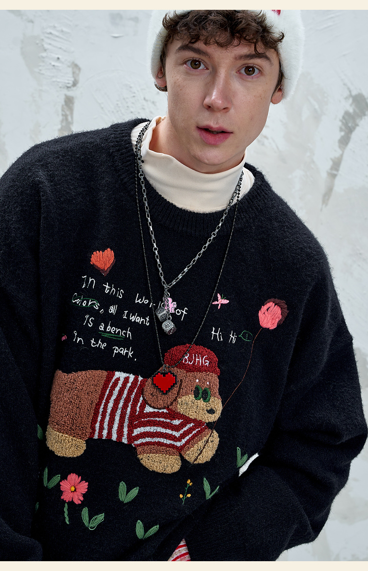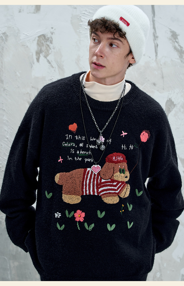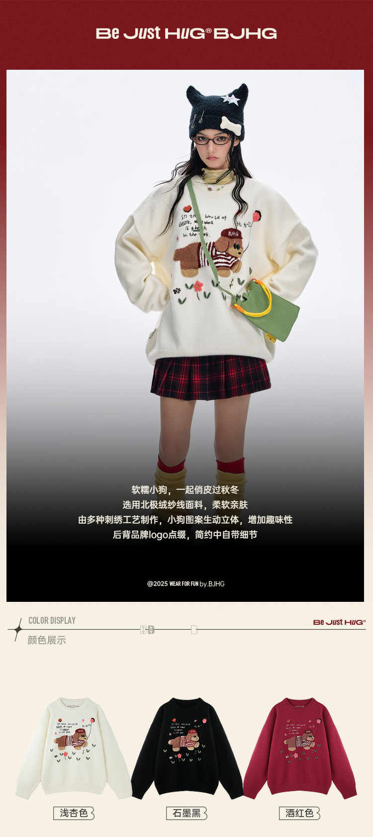 BJHG不计后果新款小狗毛衣男款秋季复古撞色圆领套头针织衫毛衣女