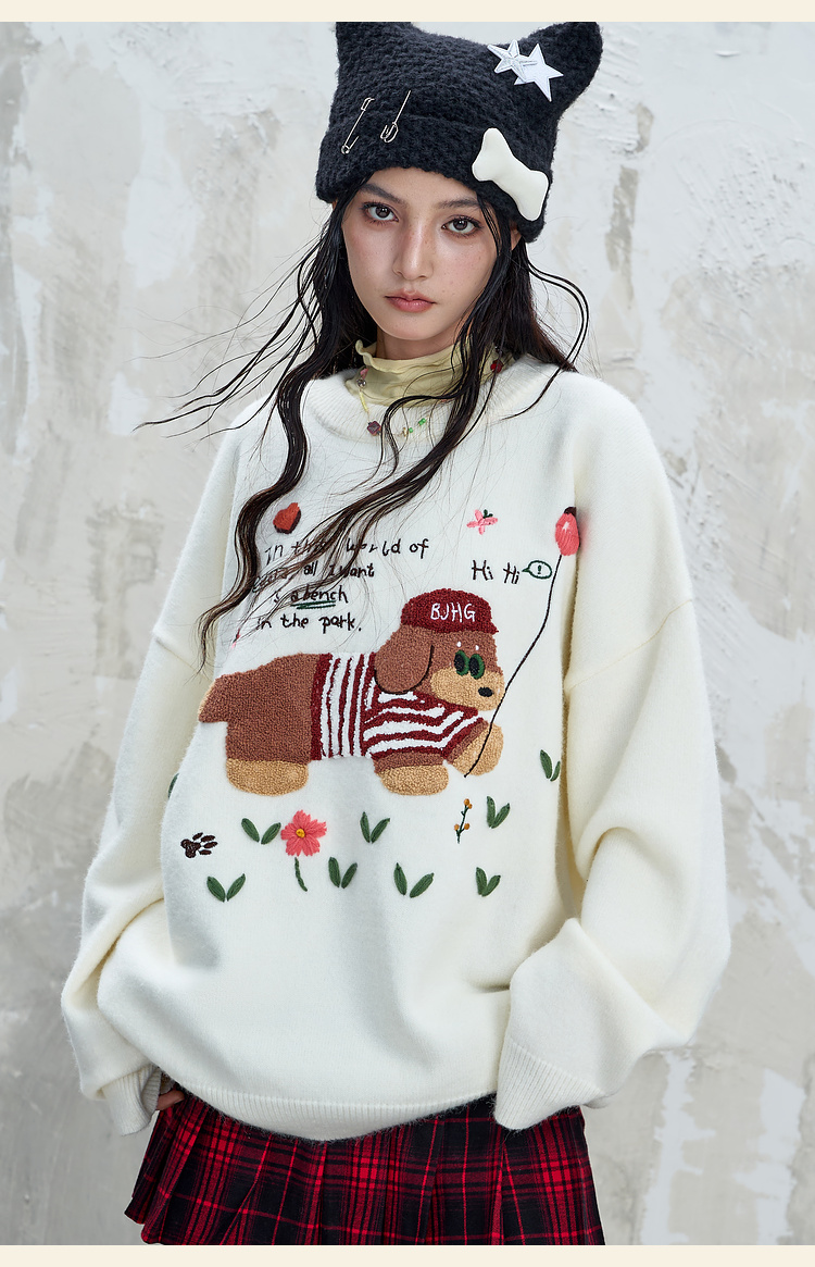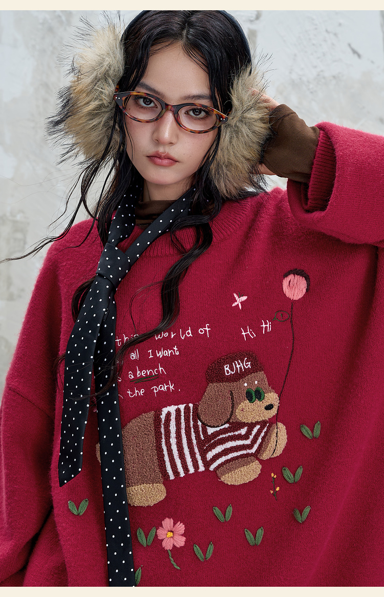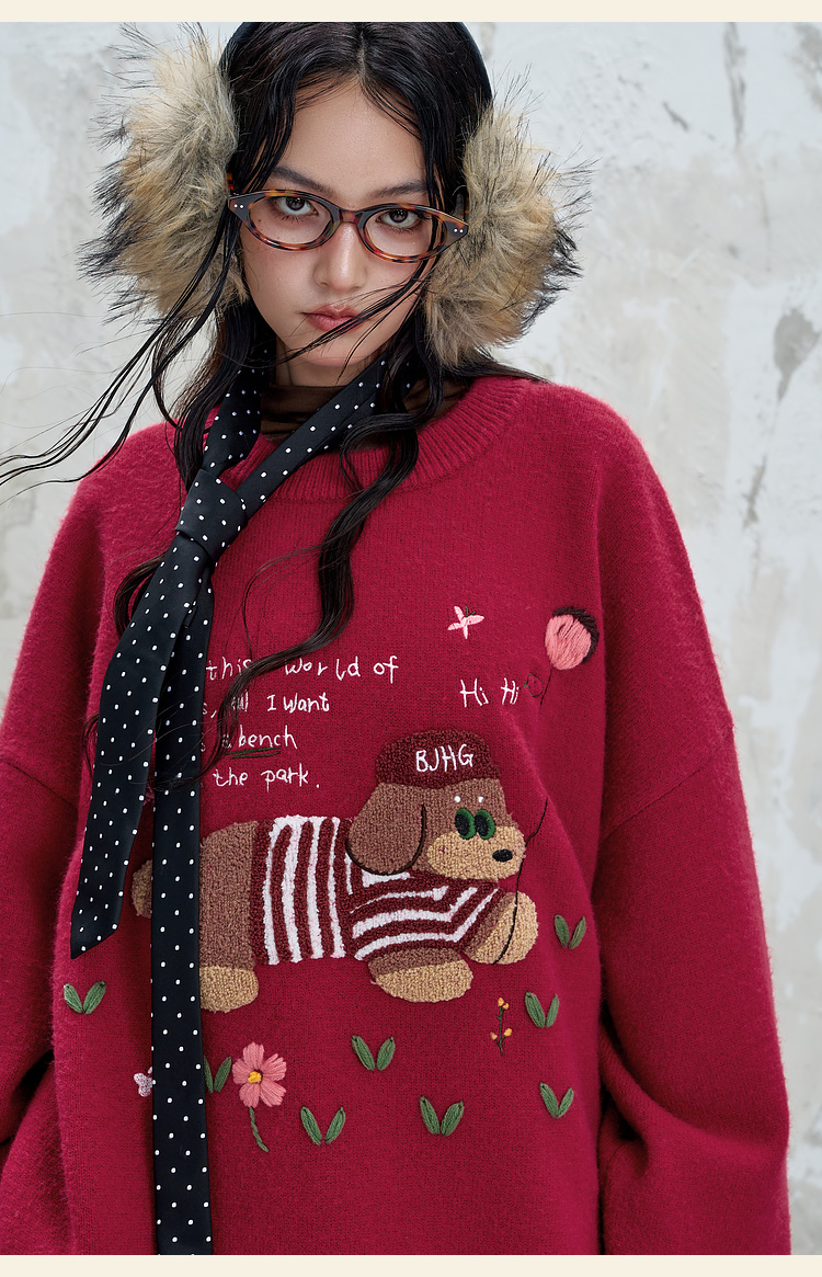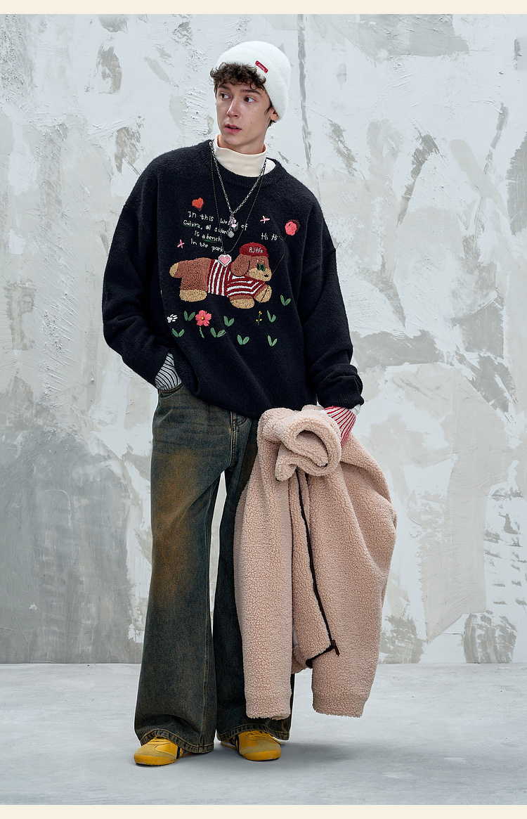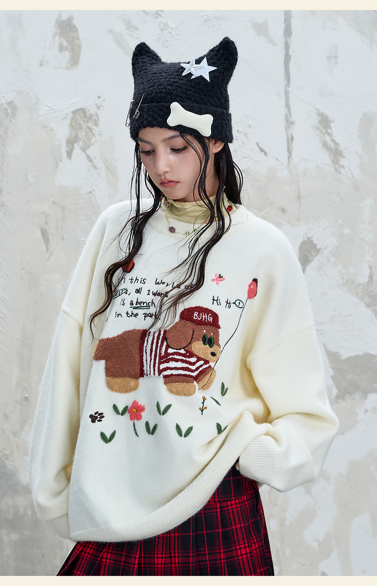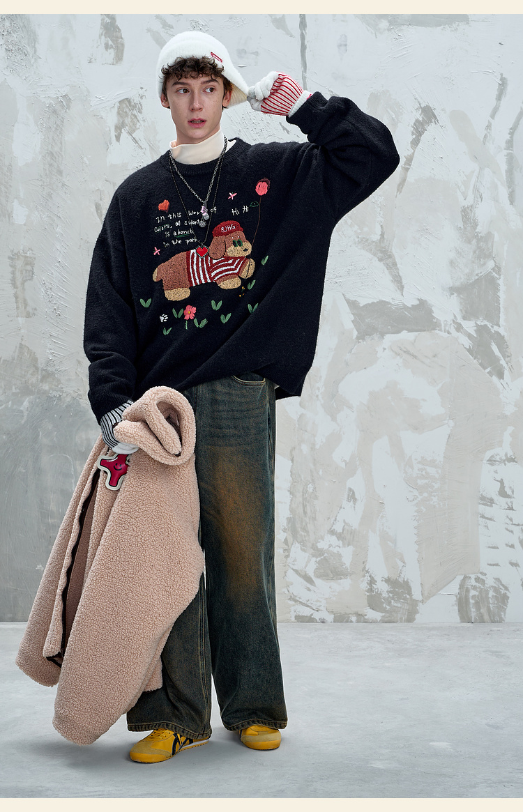 BJHG不计后果新款小狗毛衣男款秋季复古撞色圆领套头针织衫毛衣女