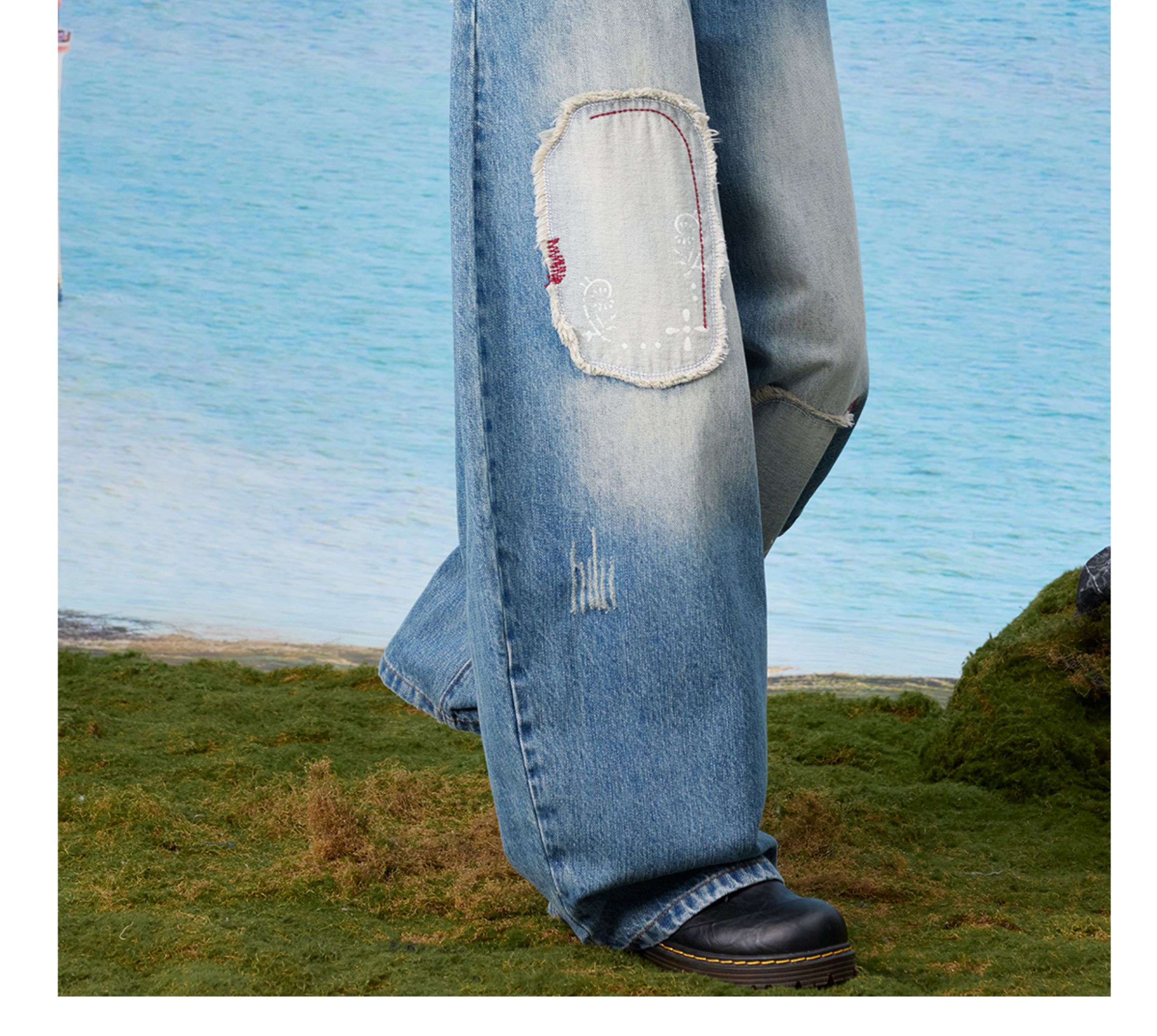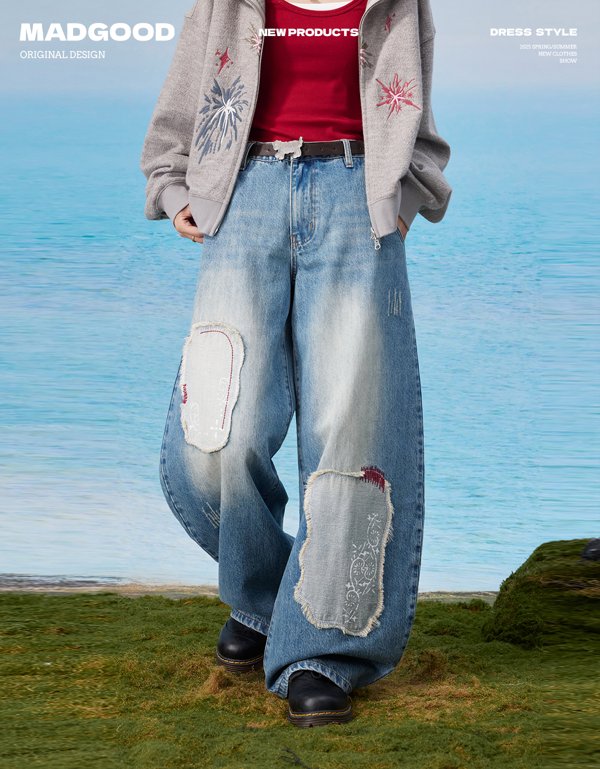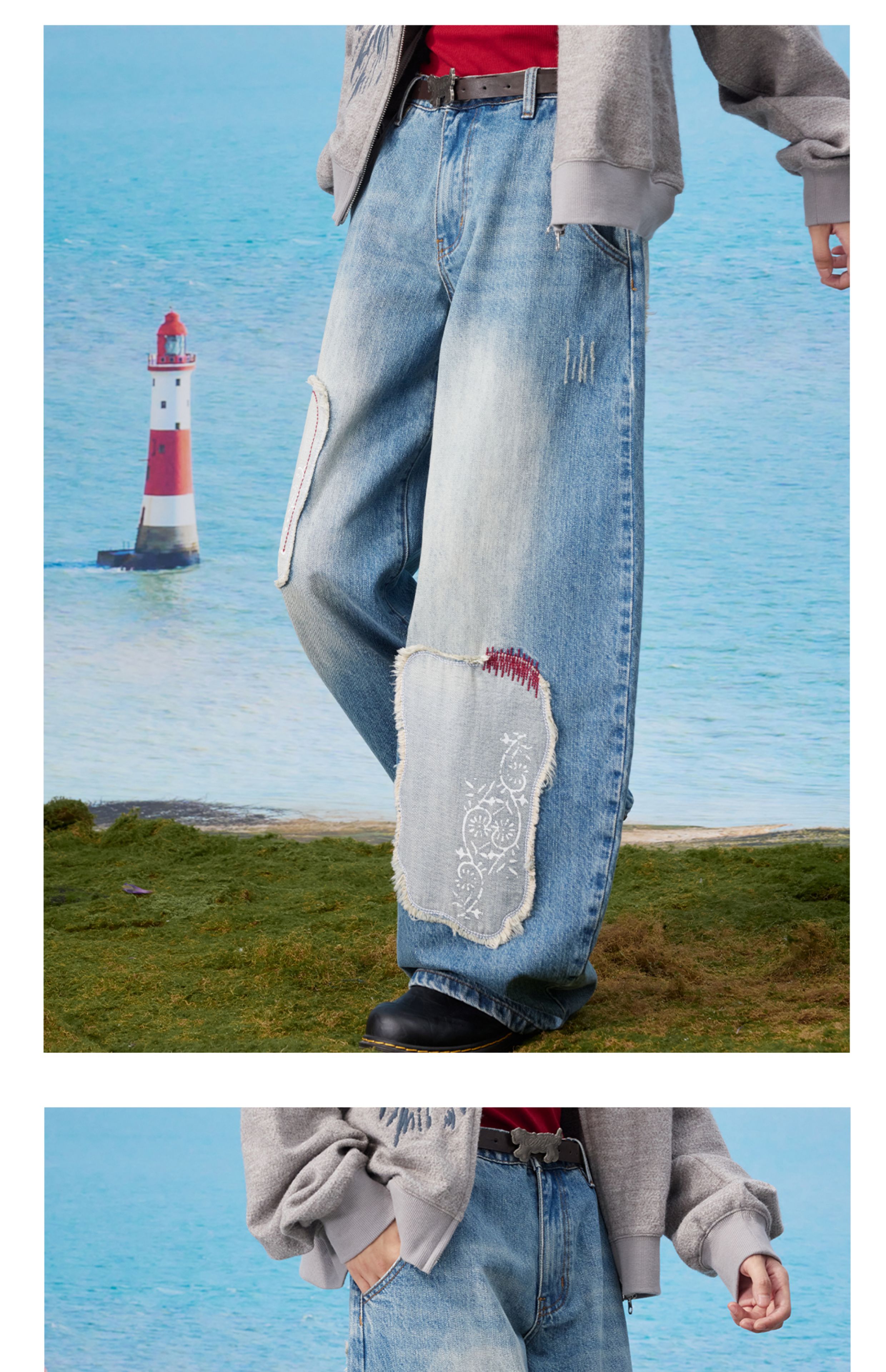 马得工地/MDGDKZ13250/反贴布毛边走线绣花弯刀牛仔裤