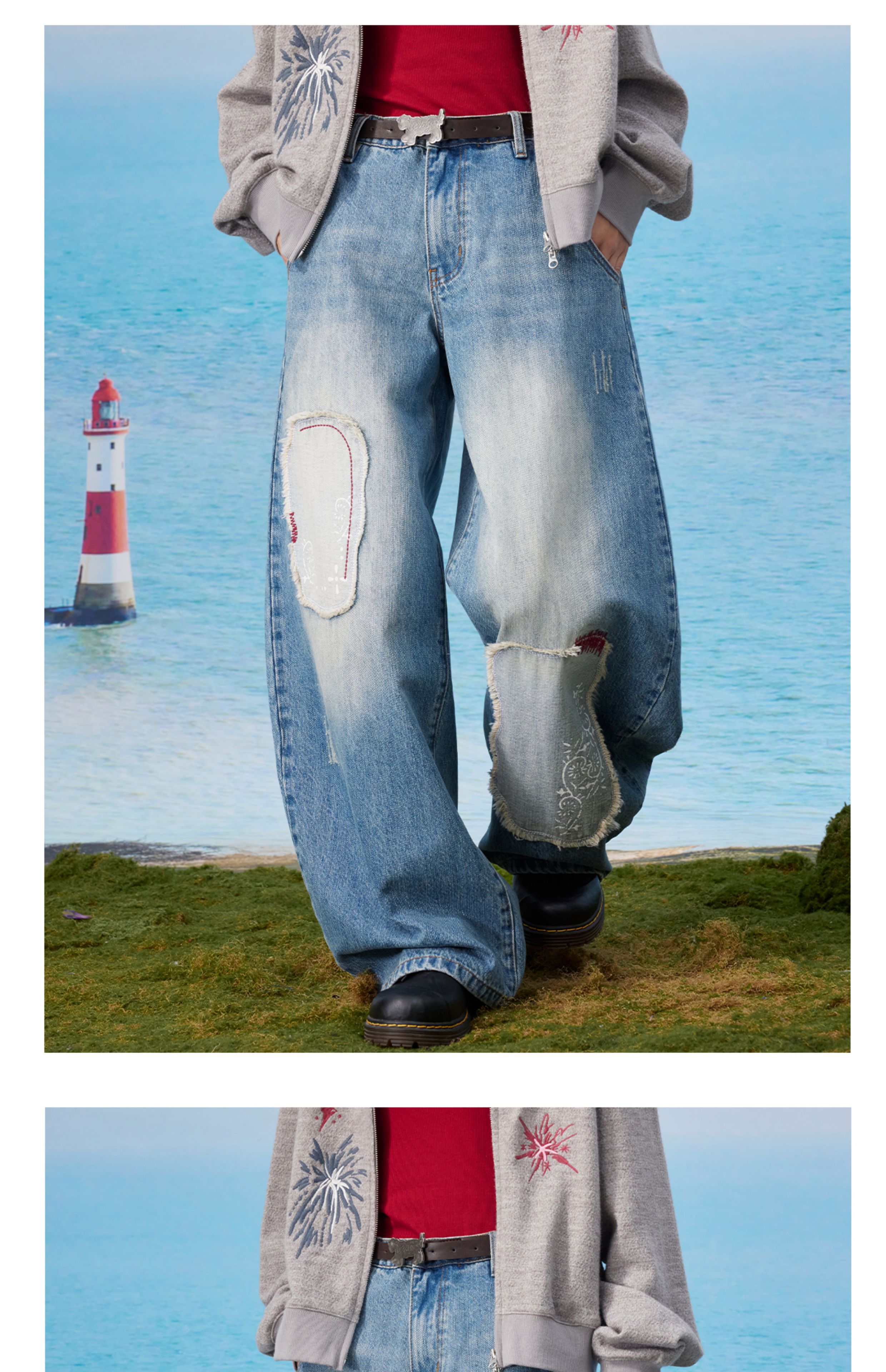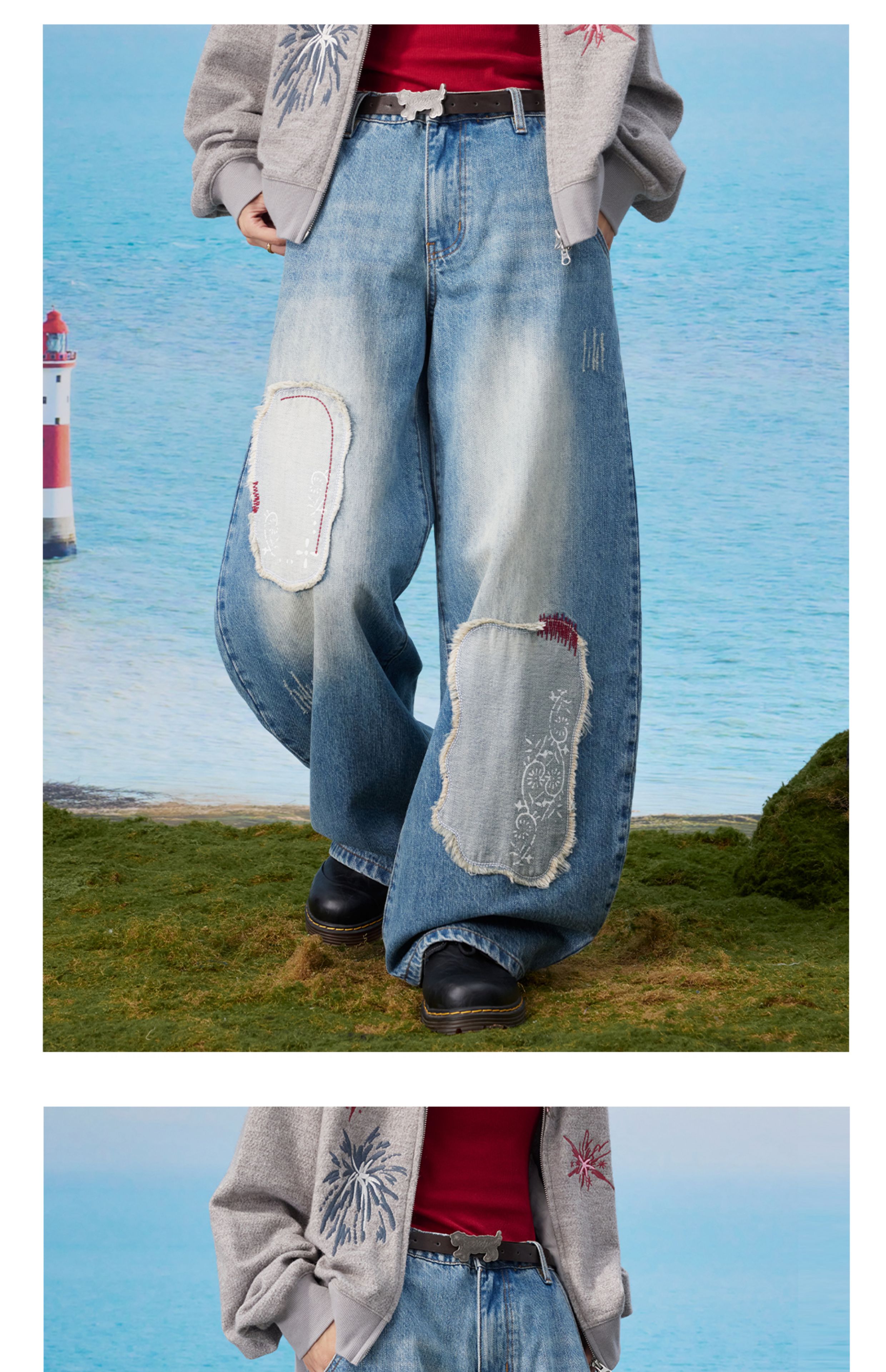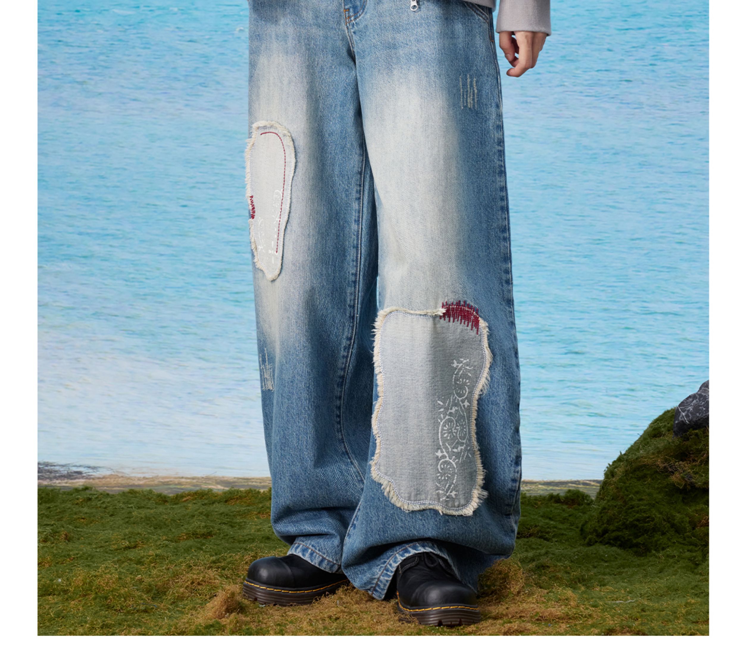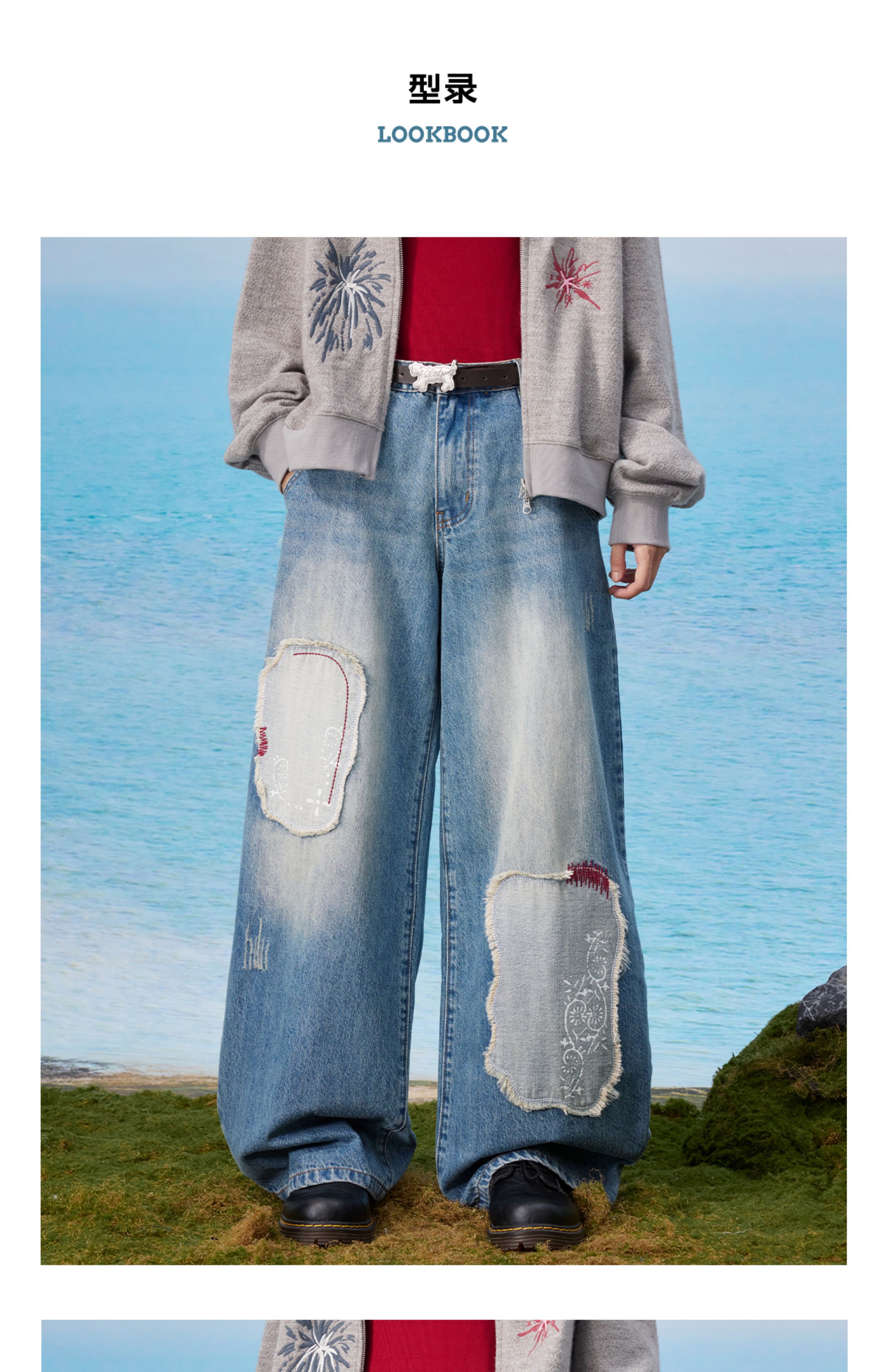 马得工地/MDGDKZ13250/反贴布毛边走线绣花弯刀牛仔裤