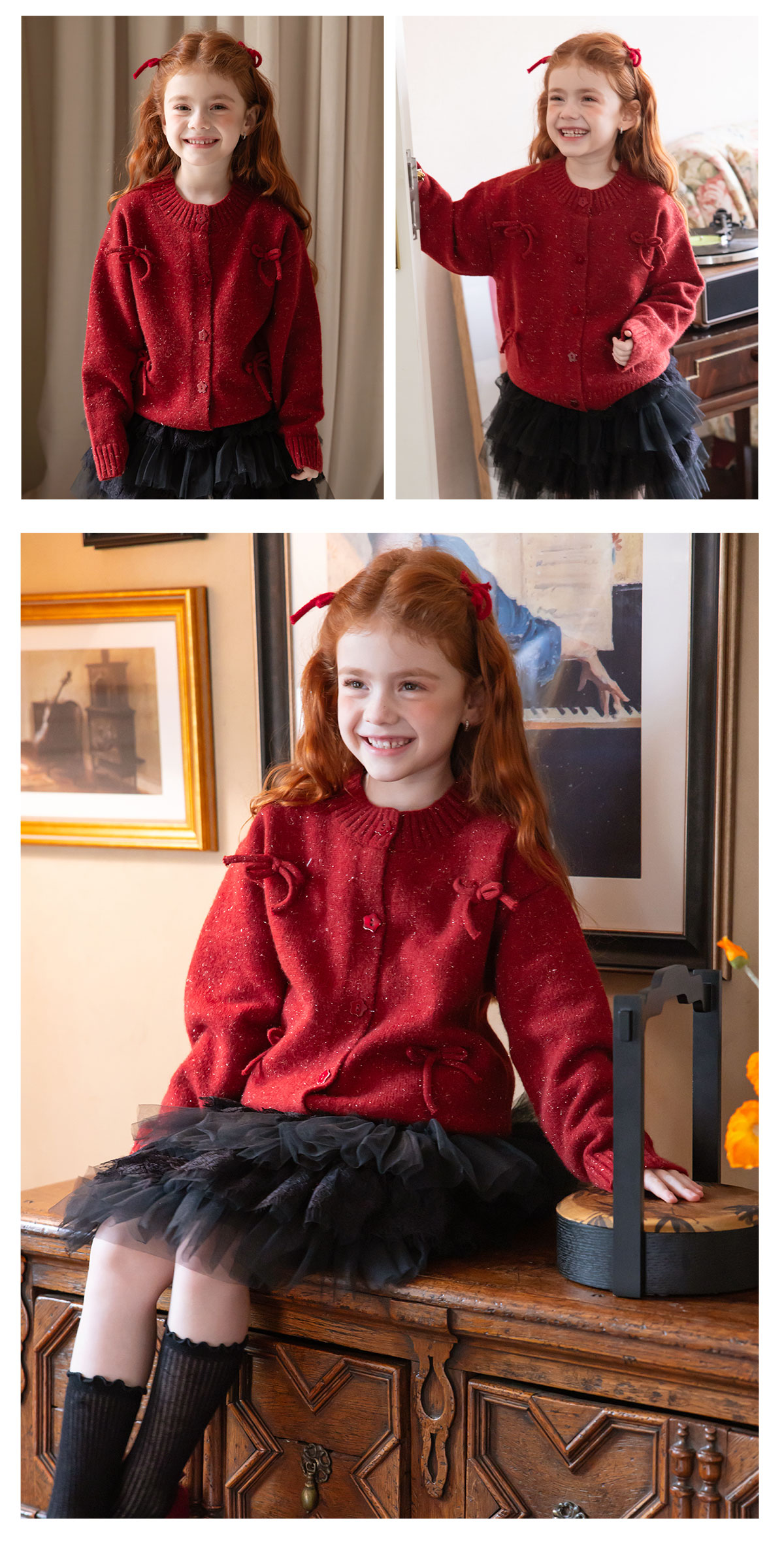littletime女童开衫2025秋冬新款蝴蝶结针织红色新年红毛衣外套