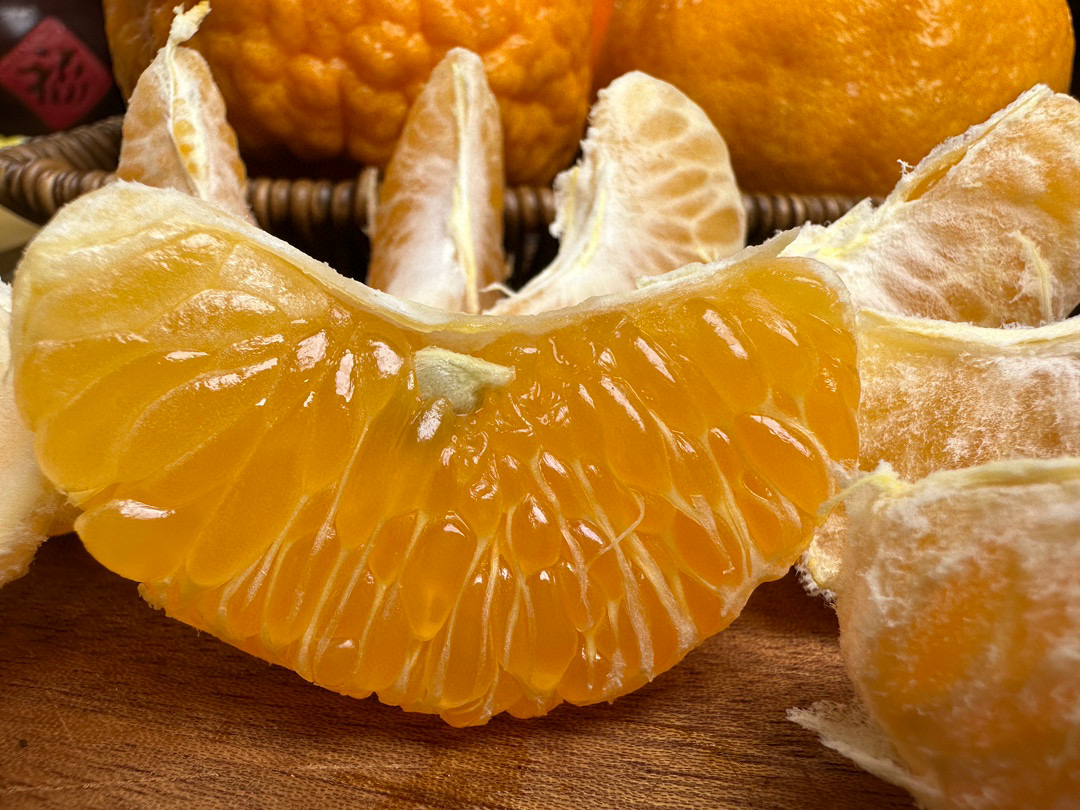 4、云南大理宾川的椪柑,属于一颗留级的晚熟大王,平均生长周期比其他普通柑橘长60-90天,非常容易剥皮,果肉入口化渣、味甜。由于宾川冬季日照长,昼夜温差大,