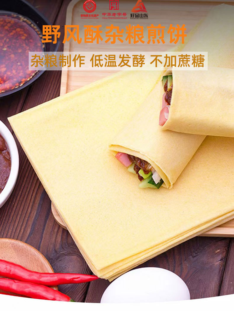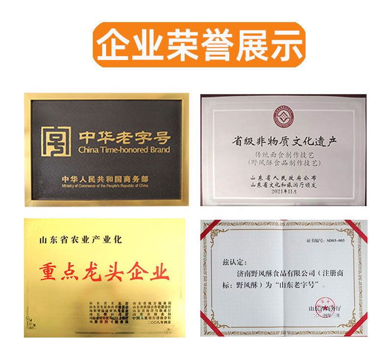 - 济南野风酥食品有限公司是一家从事绿色无公害农产品深加工,生产山东特产食品的企业。职工总人数586人,其中高中级技术人员56人。2007年济南野风酥食品有限公司被山东省人民政府授予省级农业产业化经营重点龙头企业。我公司生产的糖酥煎饼等系列产品曾连续获农业部、山东省优质产品奖,被人民大会堂定为国宴用品。“九顶塔”牌商标获得“省优”“部优”商标称号。全国著名的营养学家于若木曾来厂视察并亲笔题词,姜春云、苏毅然等国家、省级领导先后来厂视察。“野风酥”被中国食品协会评为“优秀民族食品”,获得“中华名吃”称号。产品连续获得国家级食品展销会的畅销产品奖,成为山东省的特色食品,省、市旅游局的十佳旅游商品。“山东煎饼”和“山东烧饼” 被认证为绿色食品。