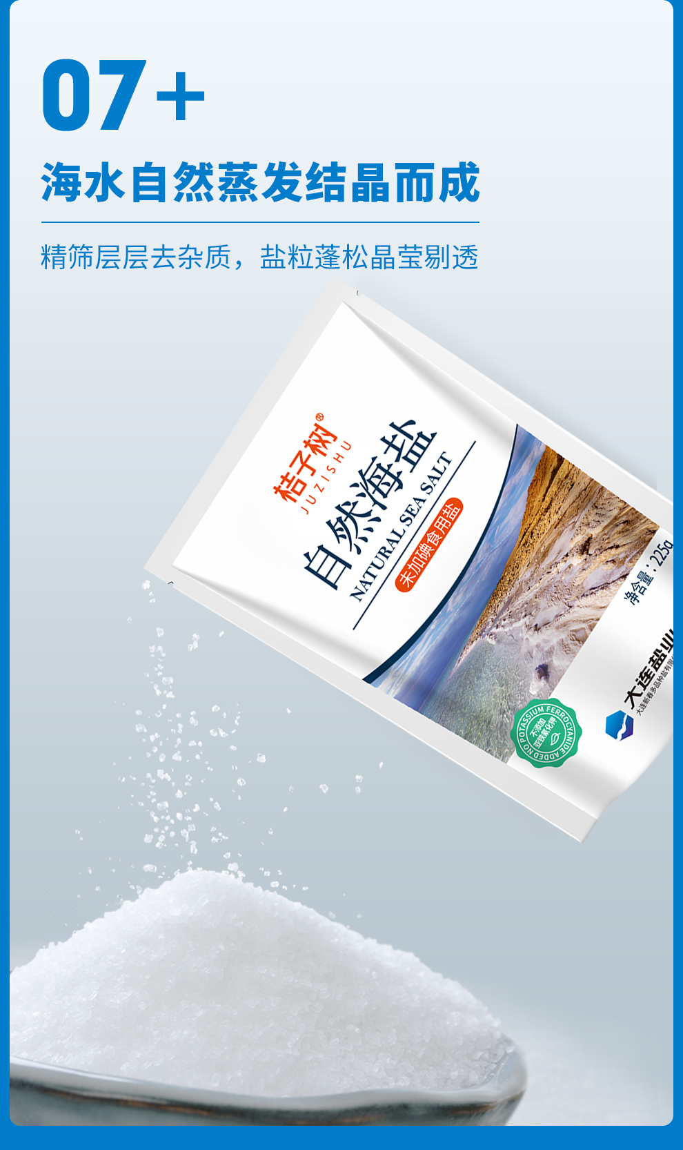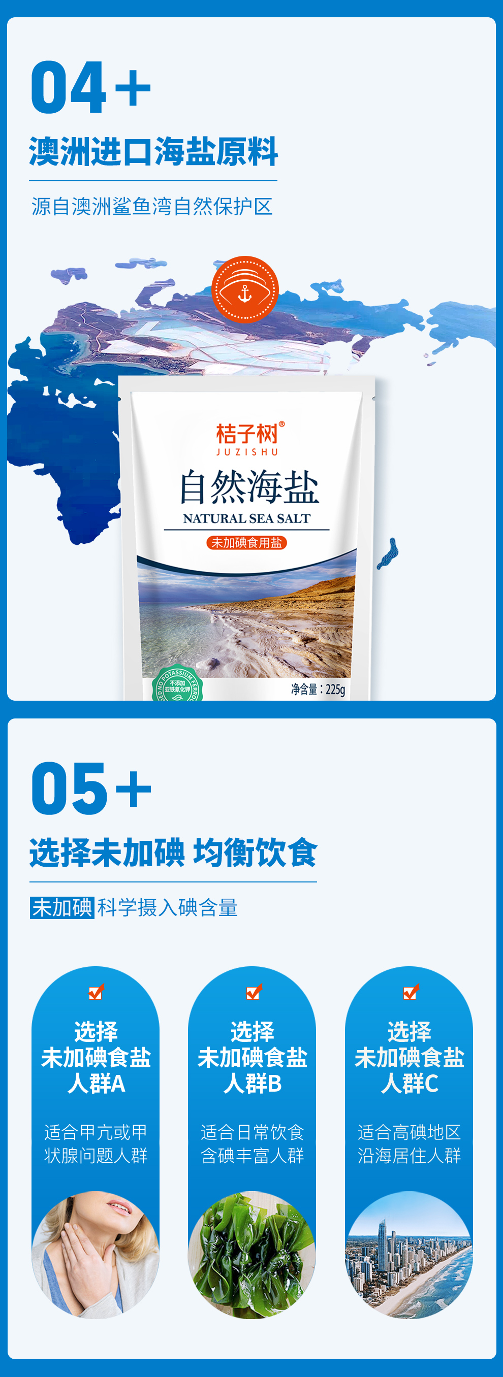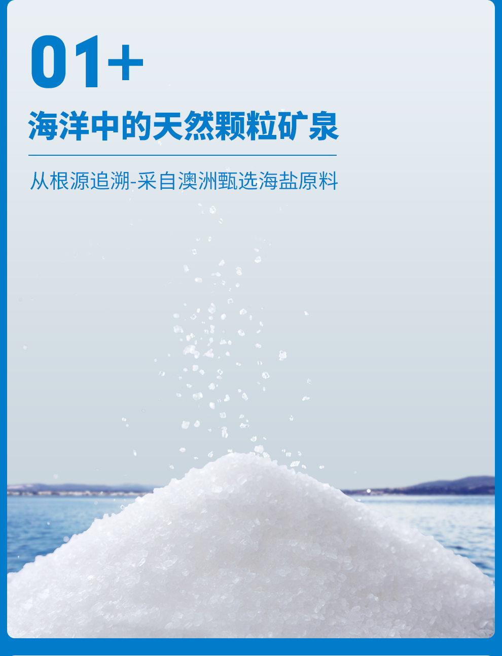 【特点】澳洲进口原盐,天然海水在阳光、风力作用下自然蒸发结晶海盐,层层过滤。盐粒纯度高、杂质少,口感温和有回甘,特别鲜美。不加碘、不加抗结剂,天然风味,健康纯正。