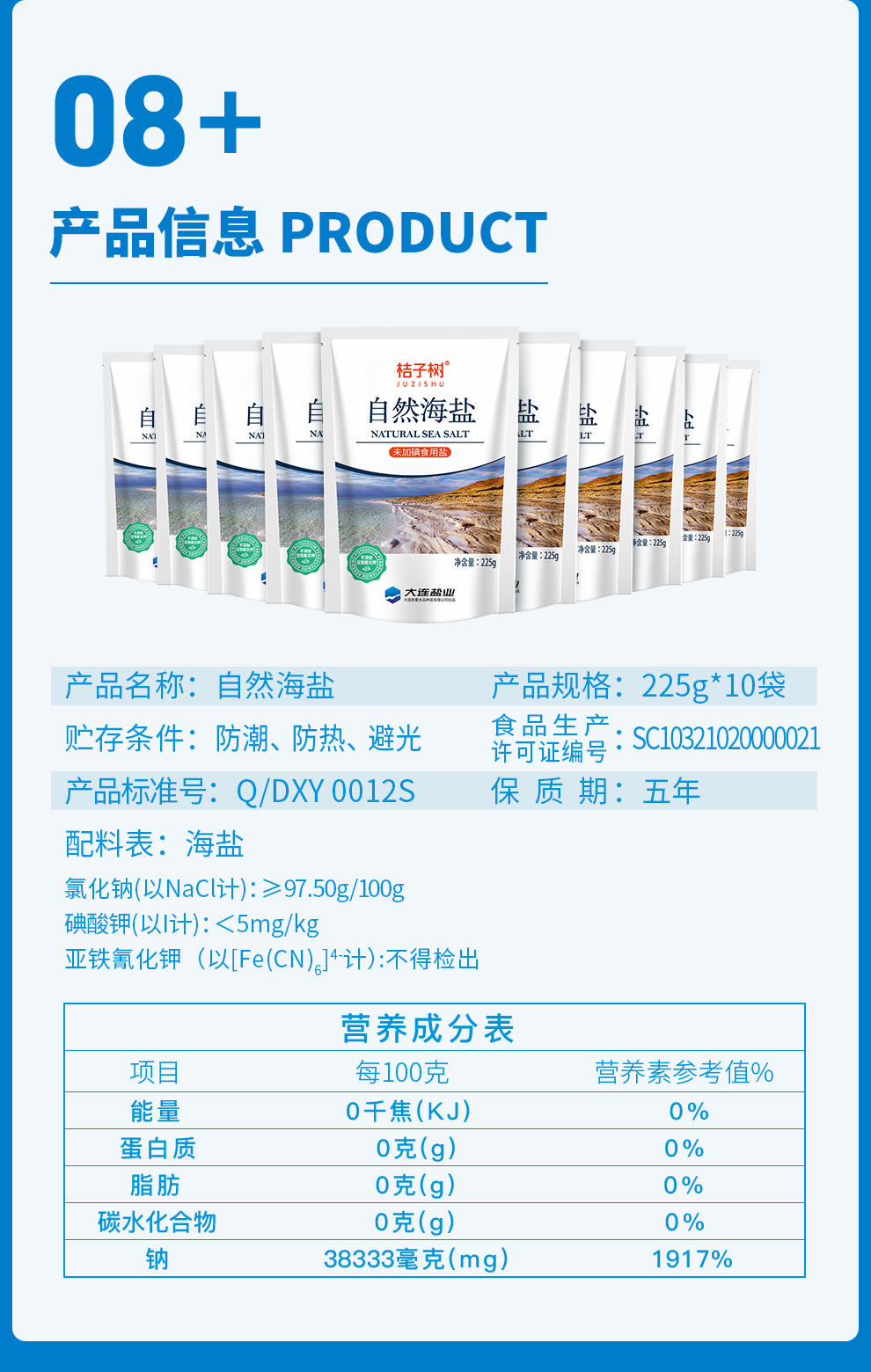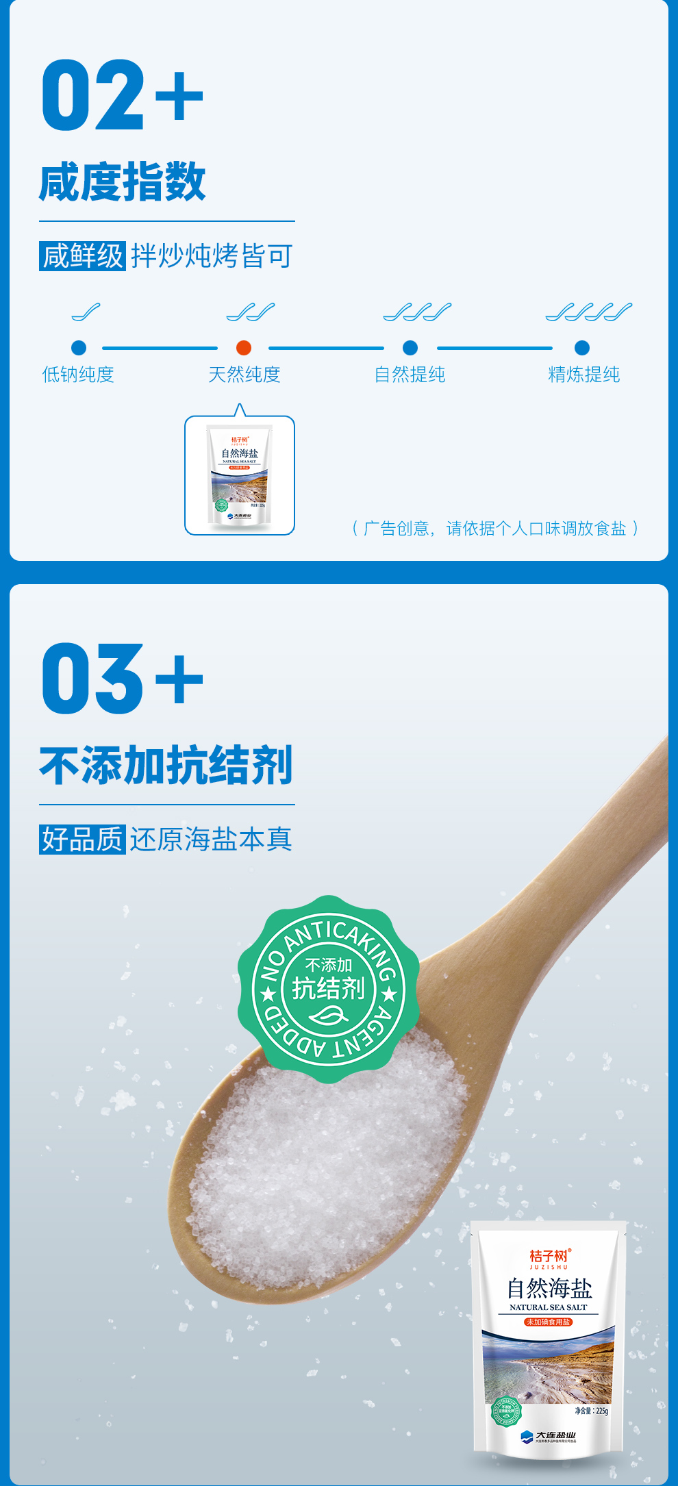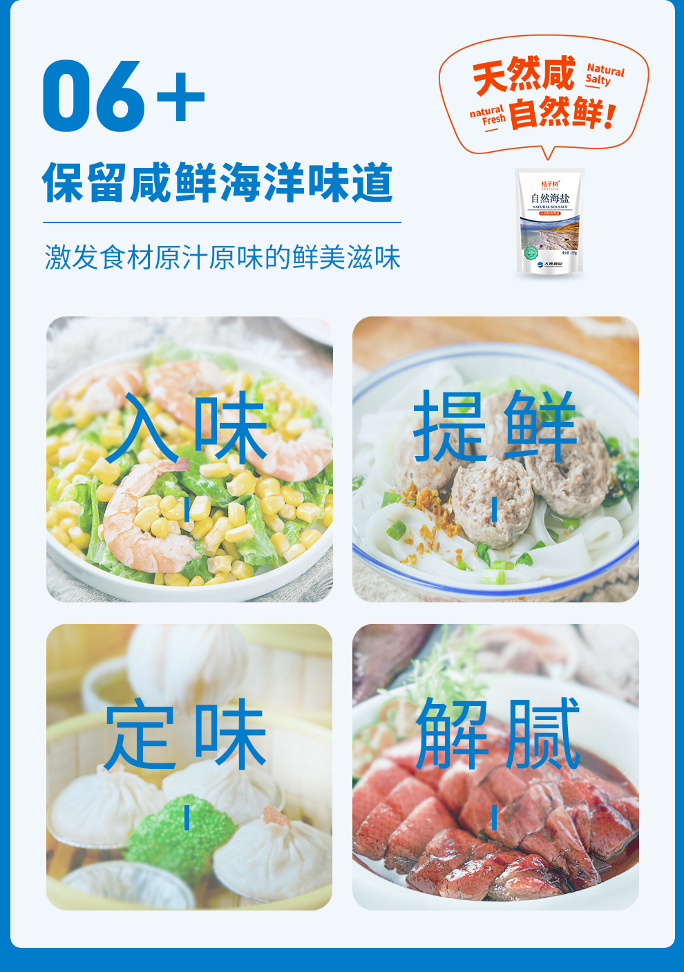 【特点】澳洲进口原盐,天然海水在阳光、风力作用下自然蒸发结晶海盐,层层过滤。盐粒纯度高、杂质少,口感温和有回甘,特别鲜美。不加碘、不加抗结剂,天然风味,健康纯正。