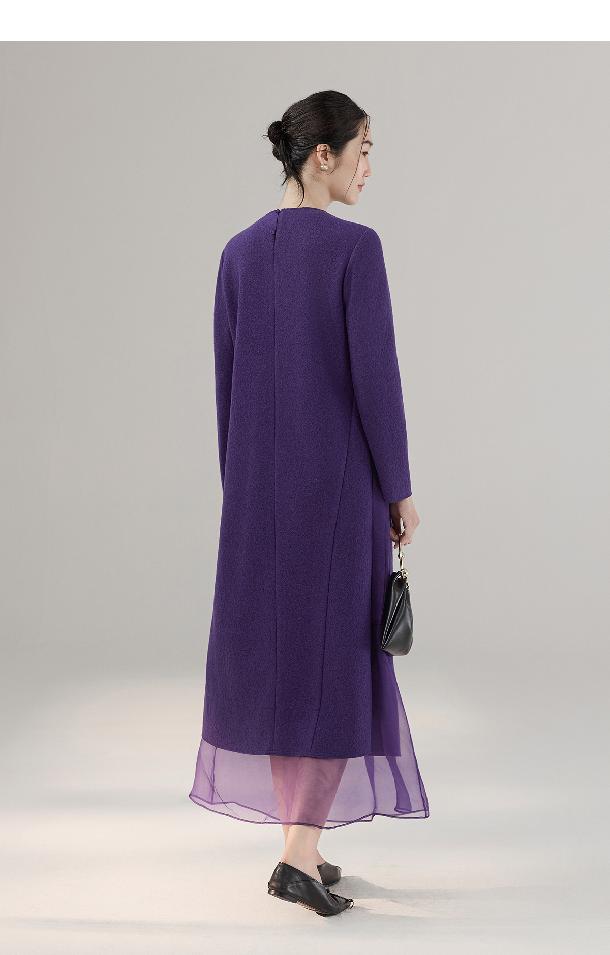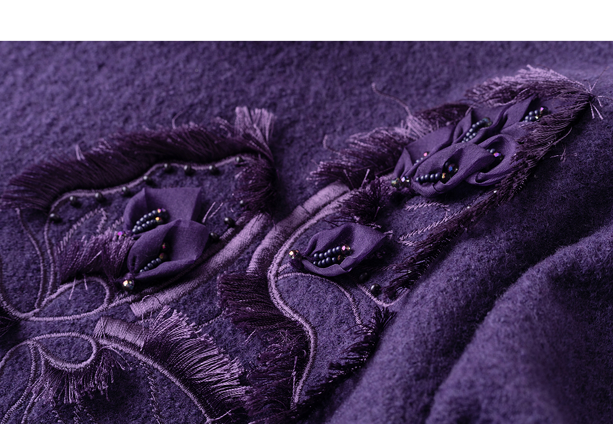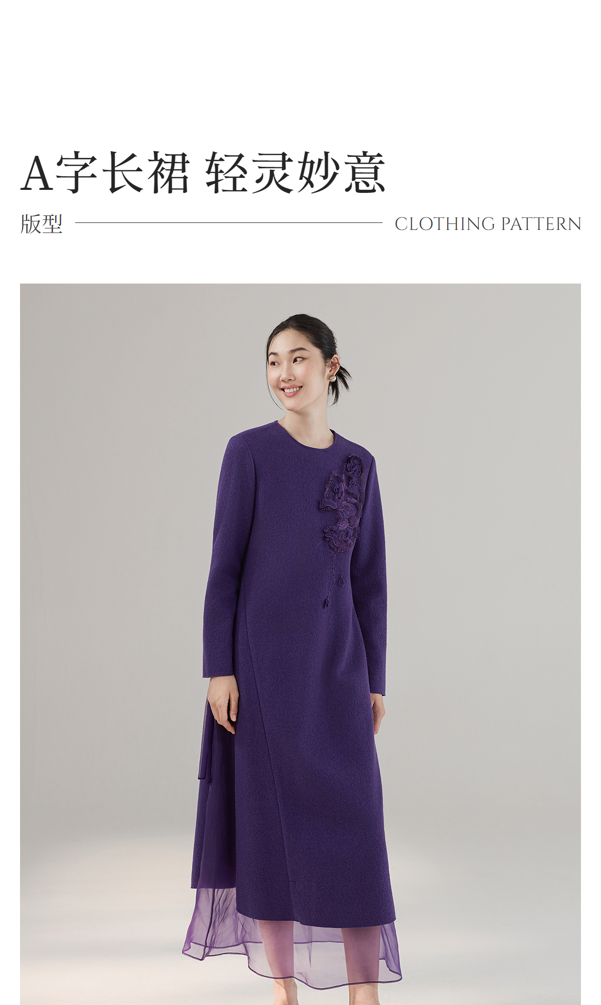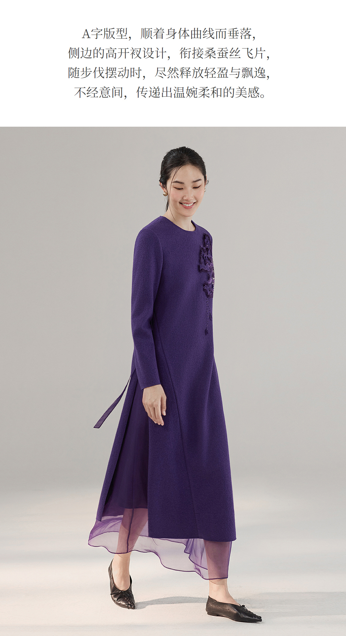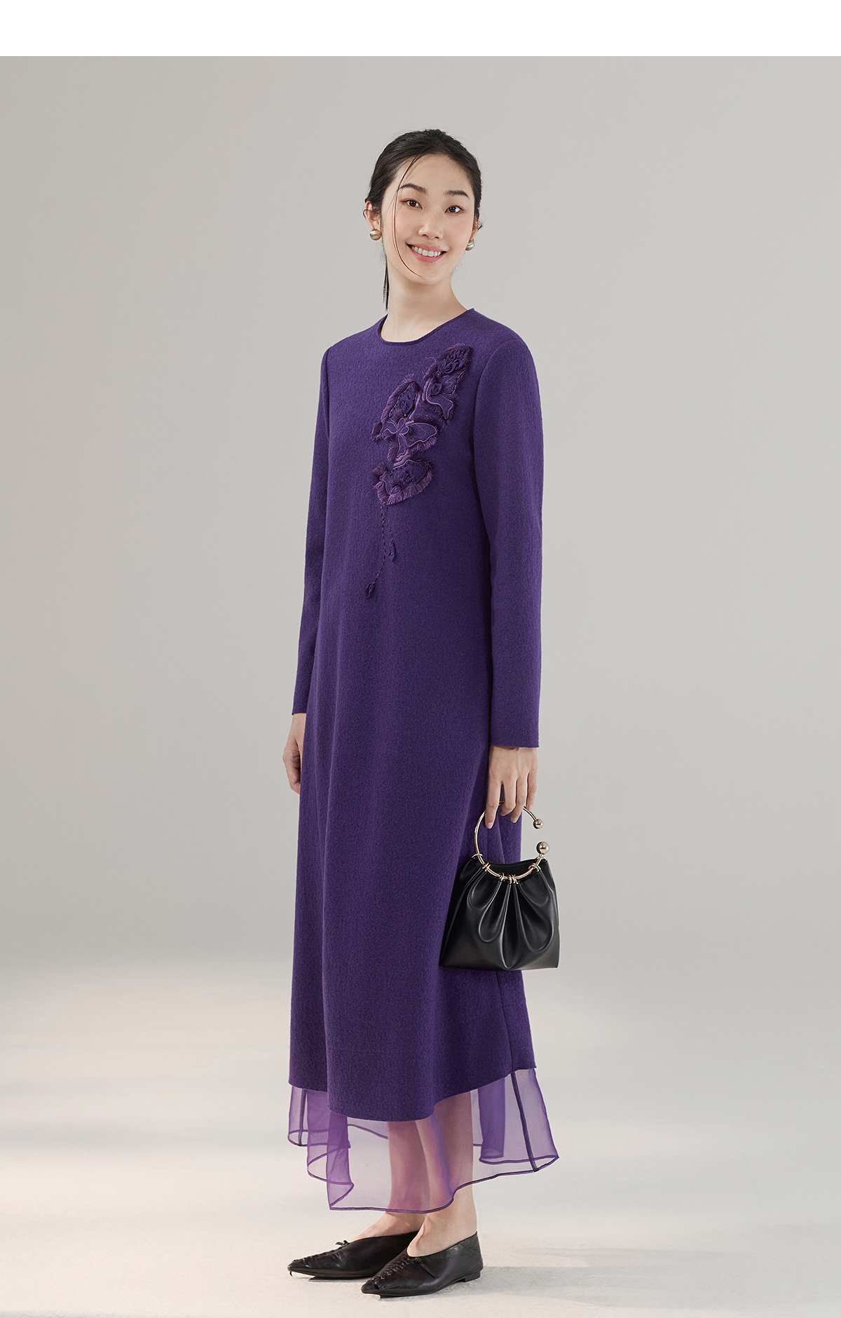 【林栖设计小店】绵羊毛连衣裙拼桑蚕丝手工花钉珠2025秋冬新款绣花长裙女1954034
