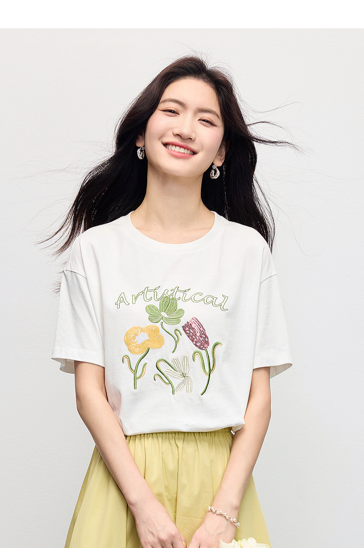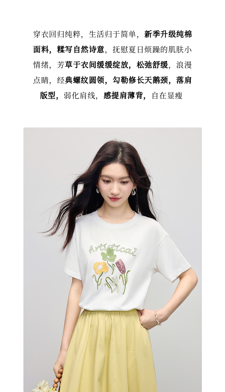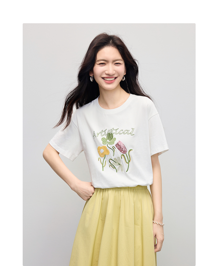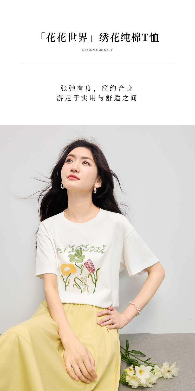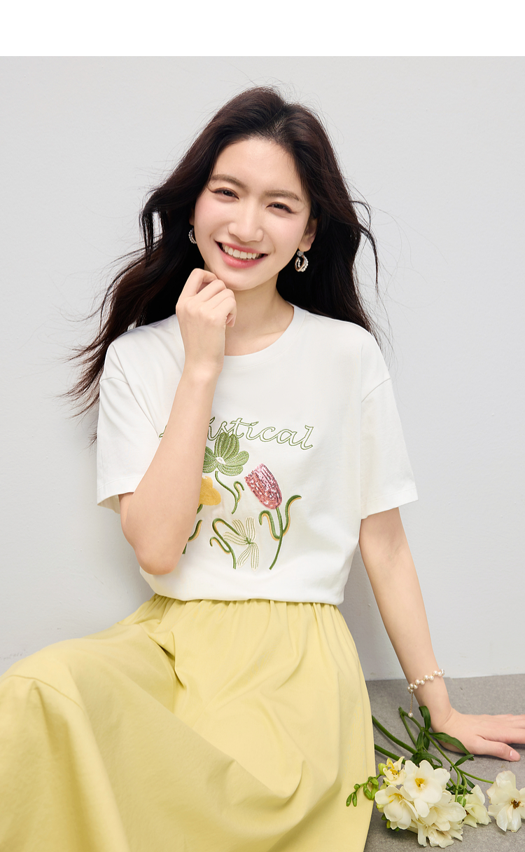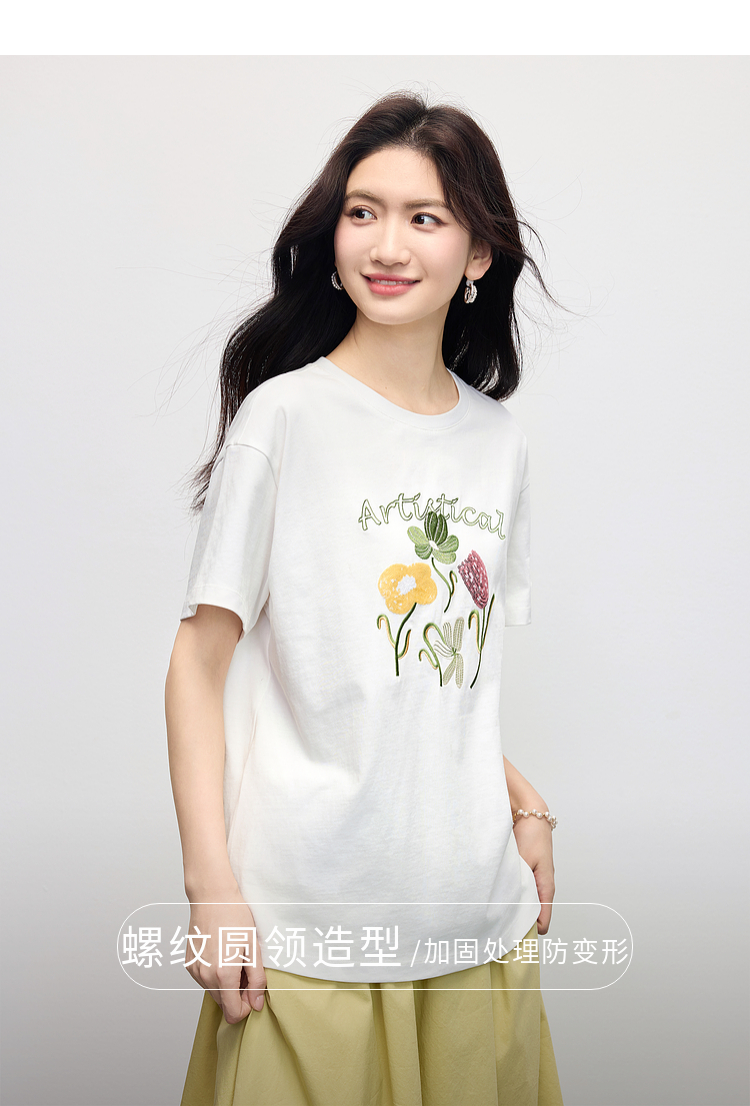 【专属特价】熙世界100%长绒棉绣花T恤短袖女2025夏季新款圆领宽松白体恤上衣